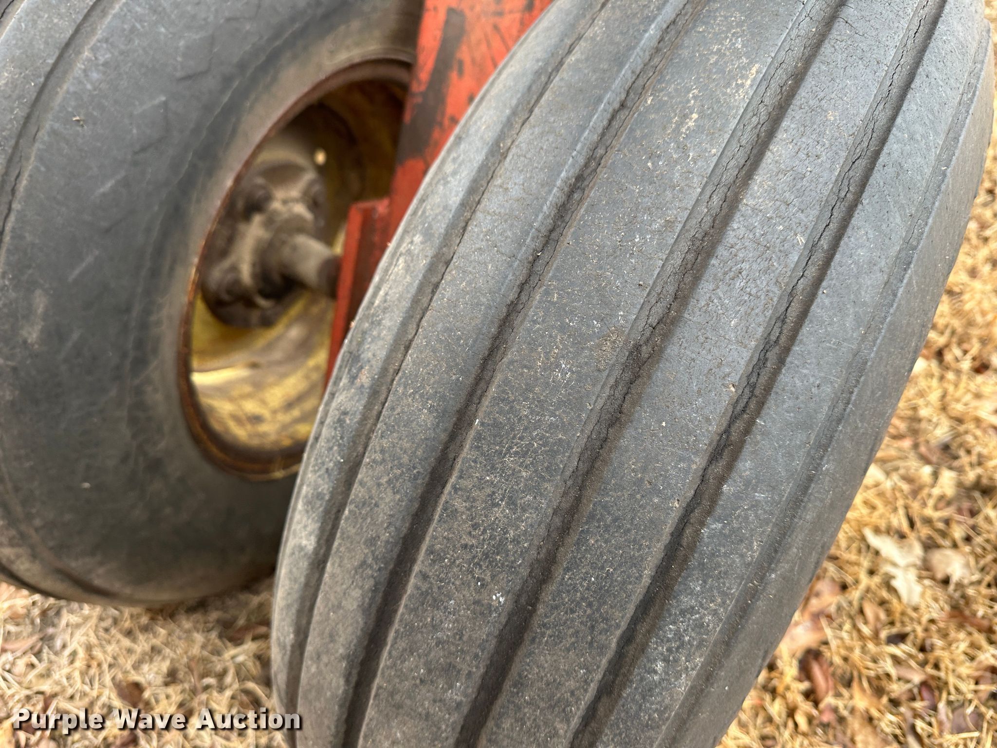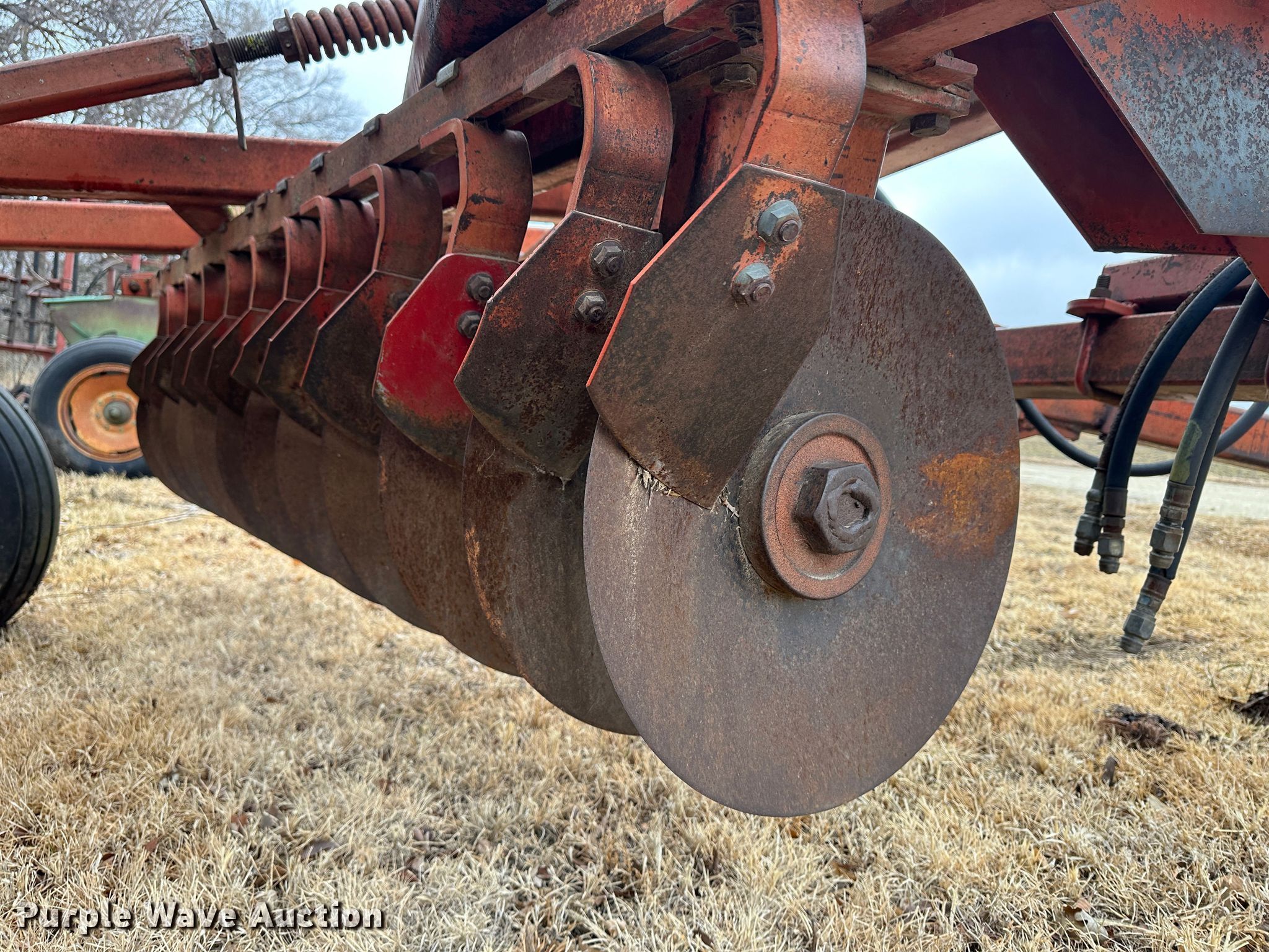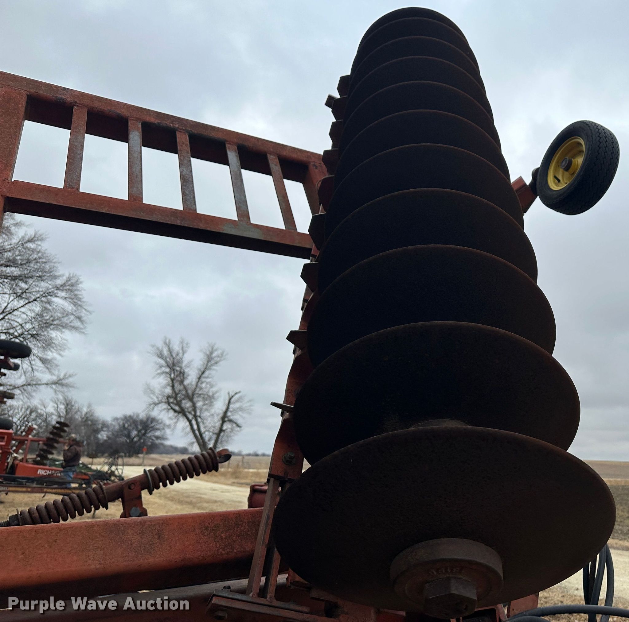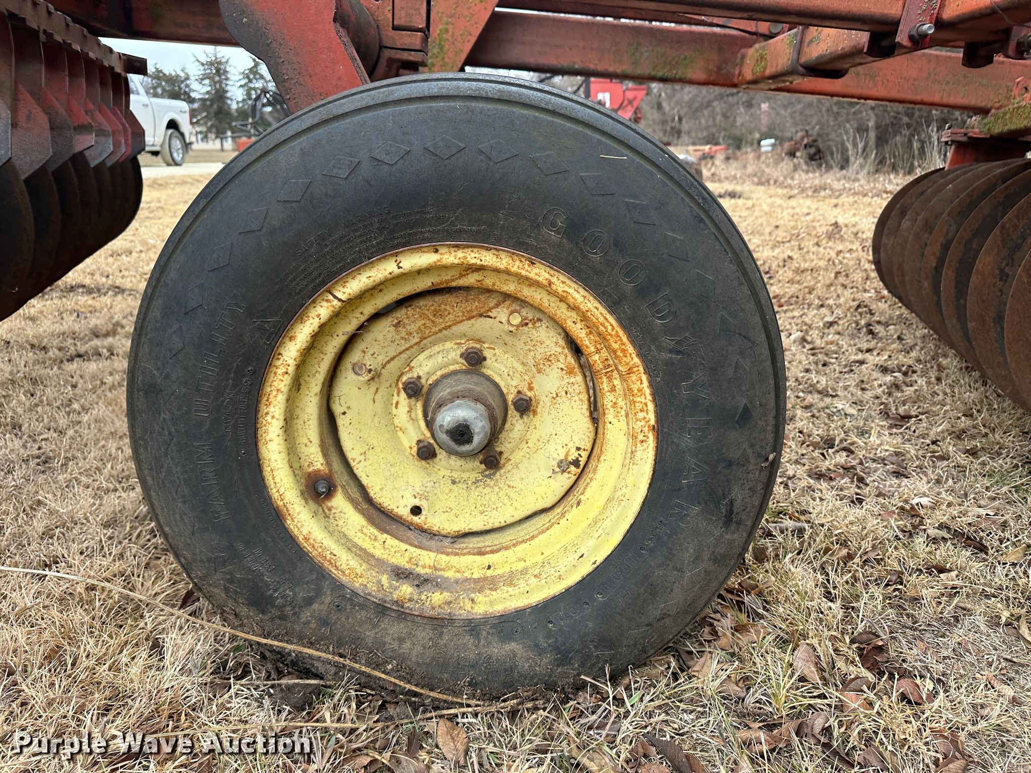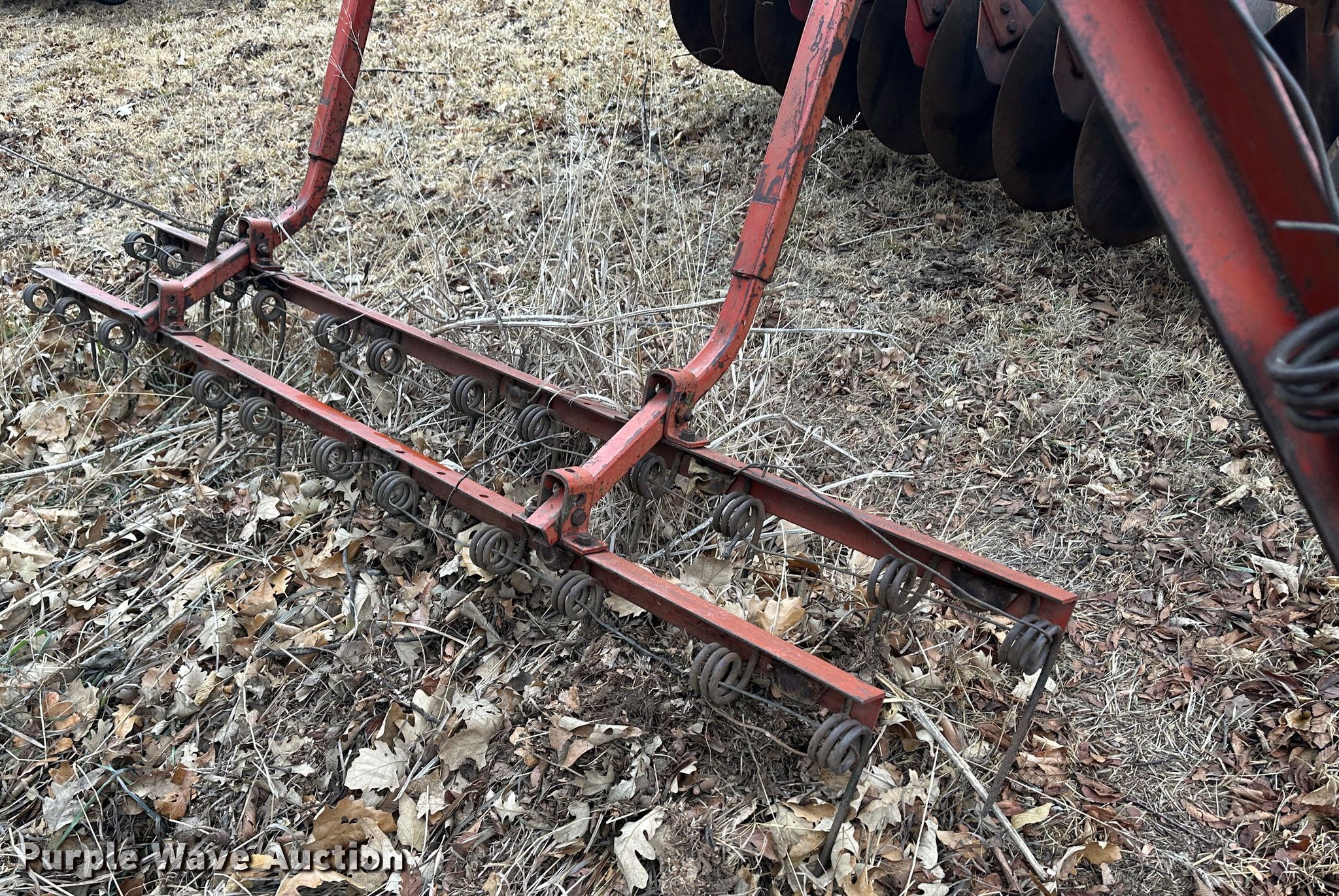 Sunflower disk. Overall width: 14'. Features Front blades Diameter: 19", Spacing: 7.5", Rear blades Diameter: 20", Spacing: 8.5", Disk scrapers, Operation Hydraulic lift, Hydraulic fold, Leveler: Manual, Attachments Tine harrow Harrow bars: 2.. Tires Tire size: 9.5L-15. Glen Elder, KS 67446