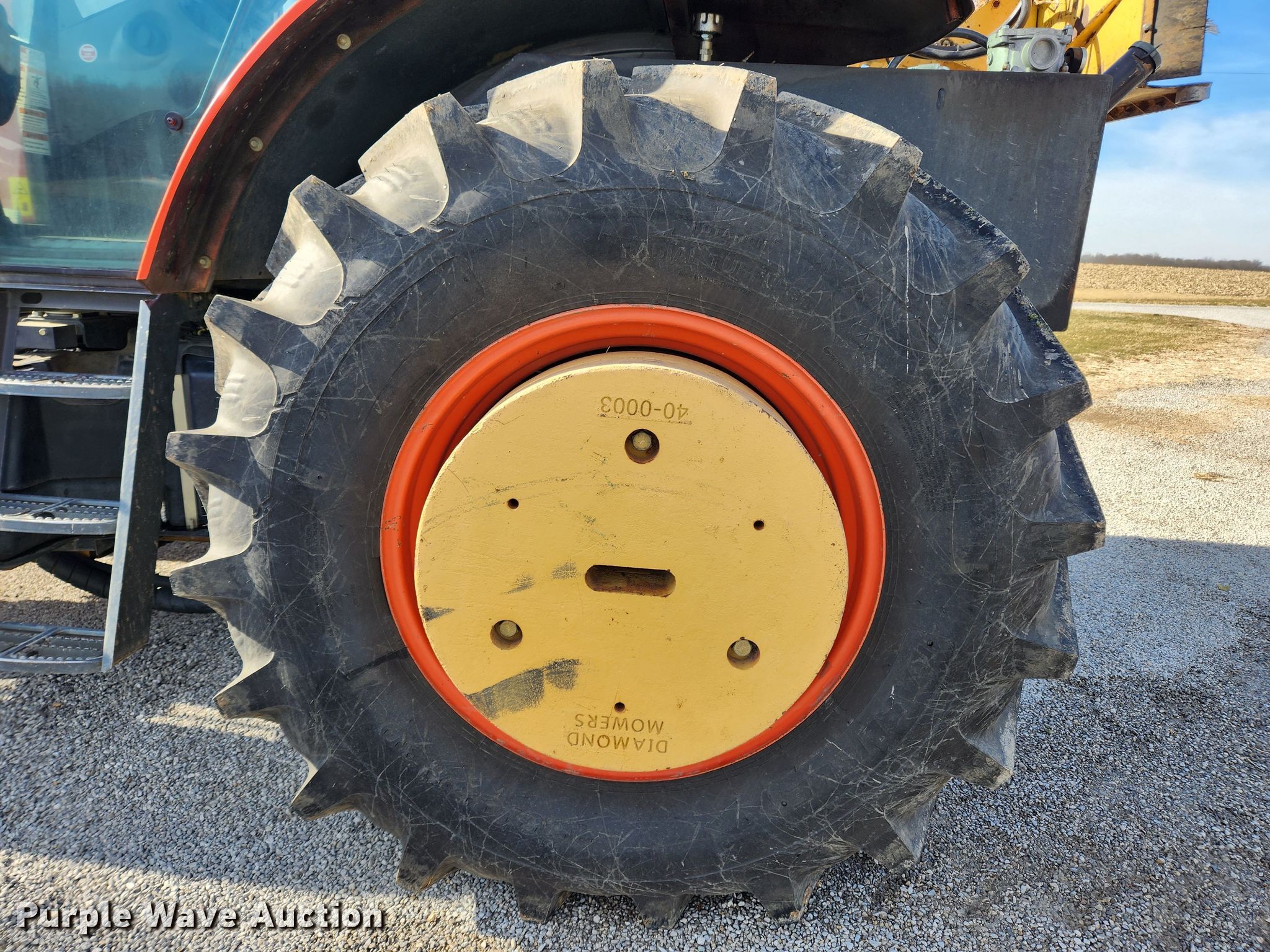 Kubota M6-111 MFWD tractor. Hours: 3,803 on meter, Miles or hours may vary, unit still in use, Serial: 10587. Engine Kubota, Displacement: 3.8L, Cylinders: 4, Fuel type: Diesel. Transmission Powershift, 24F - 24R, Left-hand reverser, Differential lock. Operators station AC, Heat. Features PTO: 540, Three point, Seven pin outlet, Hydraulic remote sets Rear: 2. Tires Front: 320/85R24, Rear: 460/85R30, Wheel weights: 4. Notes Non-operational radio. Diamond Mowers side boom rotary mower Serial: 21375, 17' L x 50" W deck, (4) lever controls , Oil coolant fan. Girard, IL 62640
