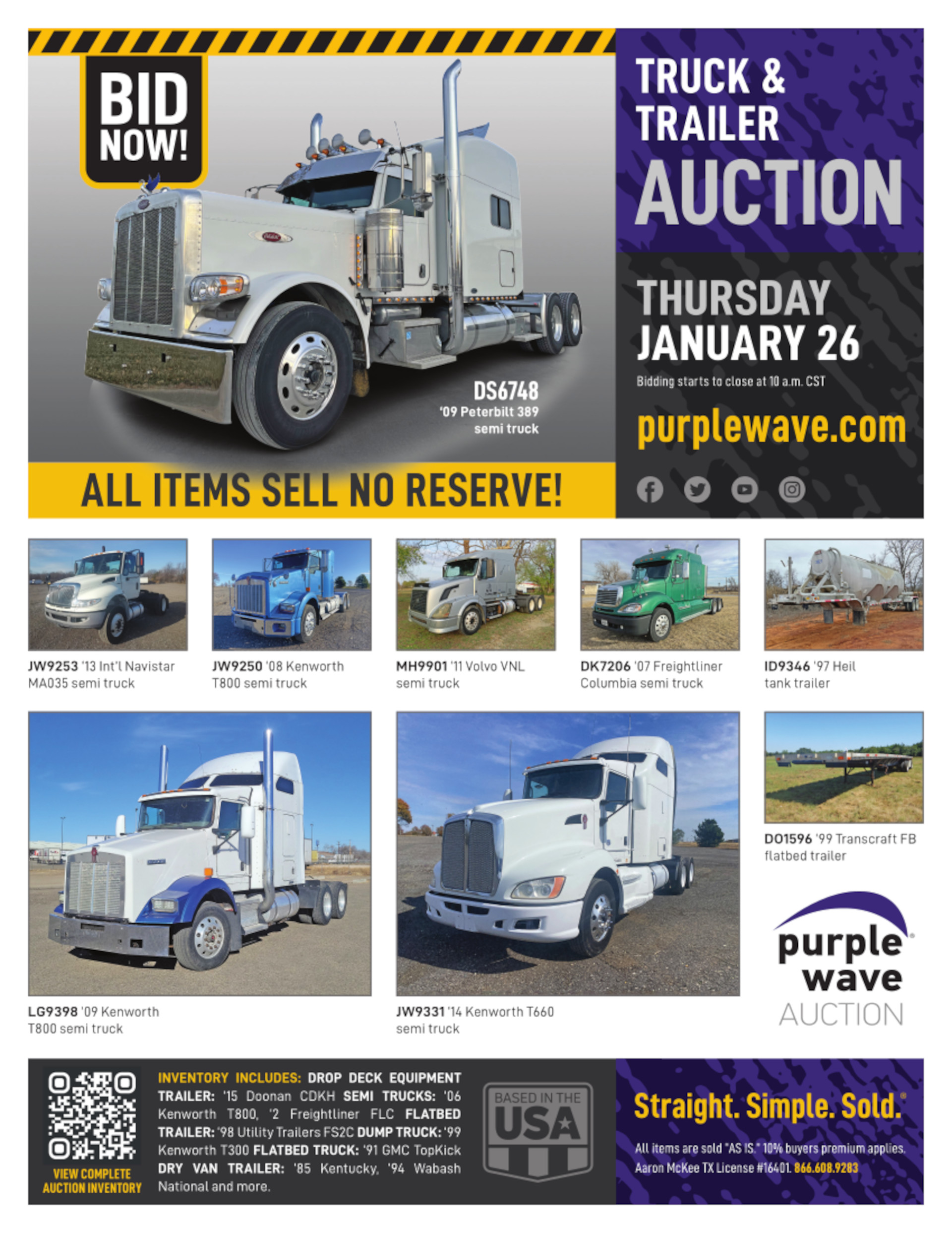This auction is conducted by Purple Wave, Inc., whose home office is 825 Levee Drive, Manhattan, Kansas. Aaron McKee, Texas auctioneer license # 16401, operates Purple Wave, Inc. Complaints against us may be directed to the Texas Department of Licensing and Regulation, P.O. Box 12157, Austin, Texas 78711, (512) 463-6599. For additional required information, see the attached document.