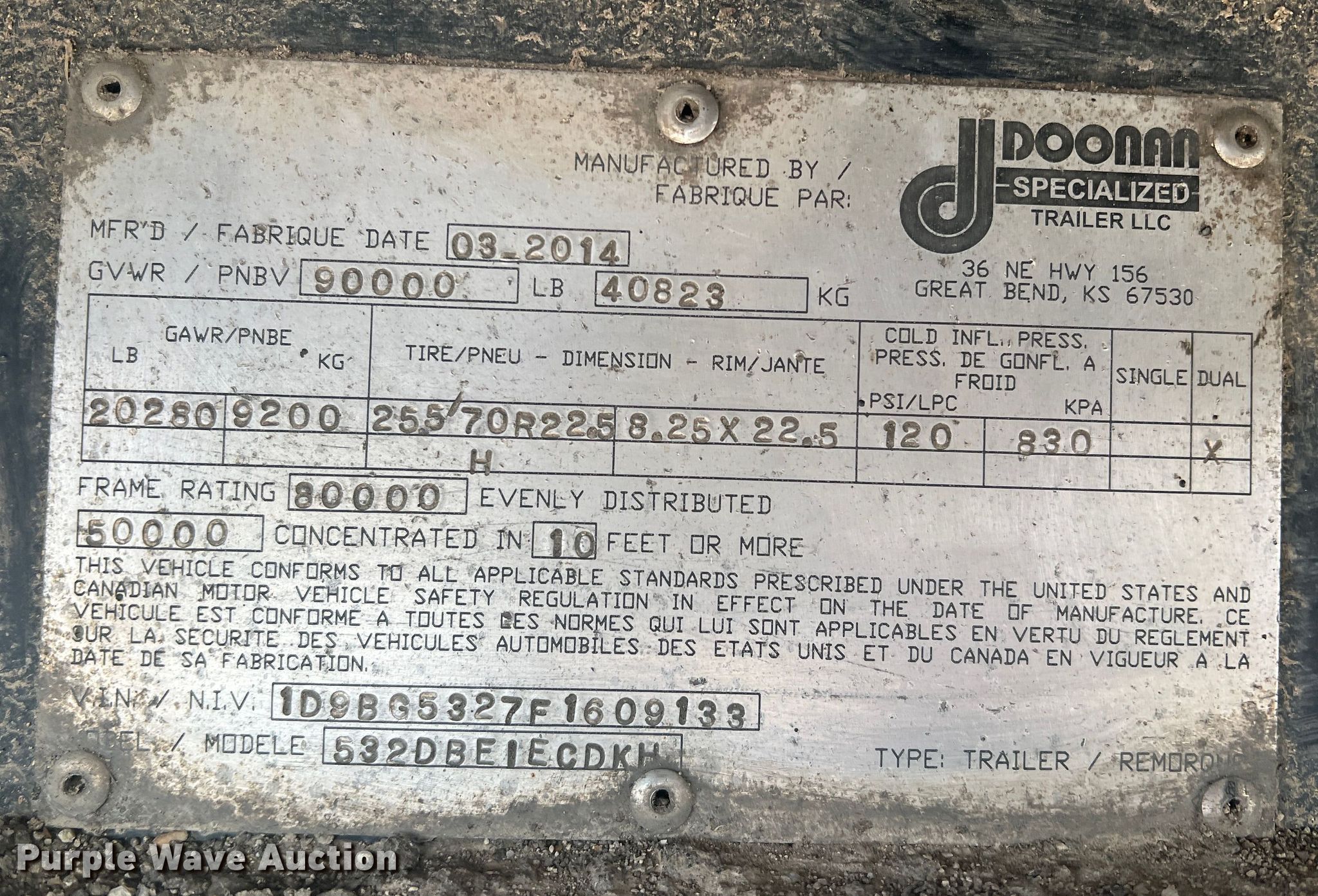 Purple Wave is selling a used Flat or Drop Deck Trailer in Oklahoma. This item is a 2015 Doonan CDKH drop deck equipment trailer with the following: VIN: 1D9BG5327F1609133