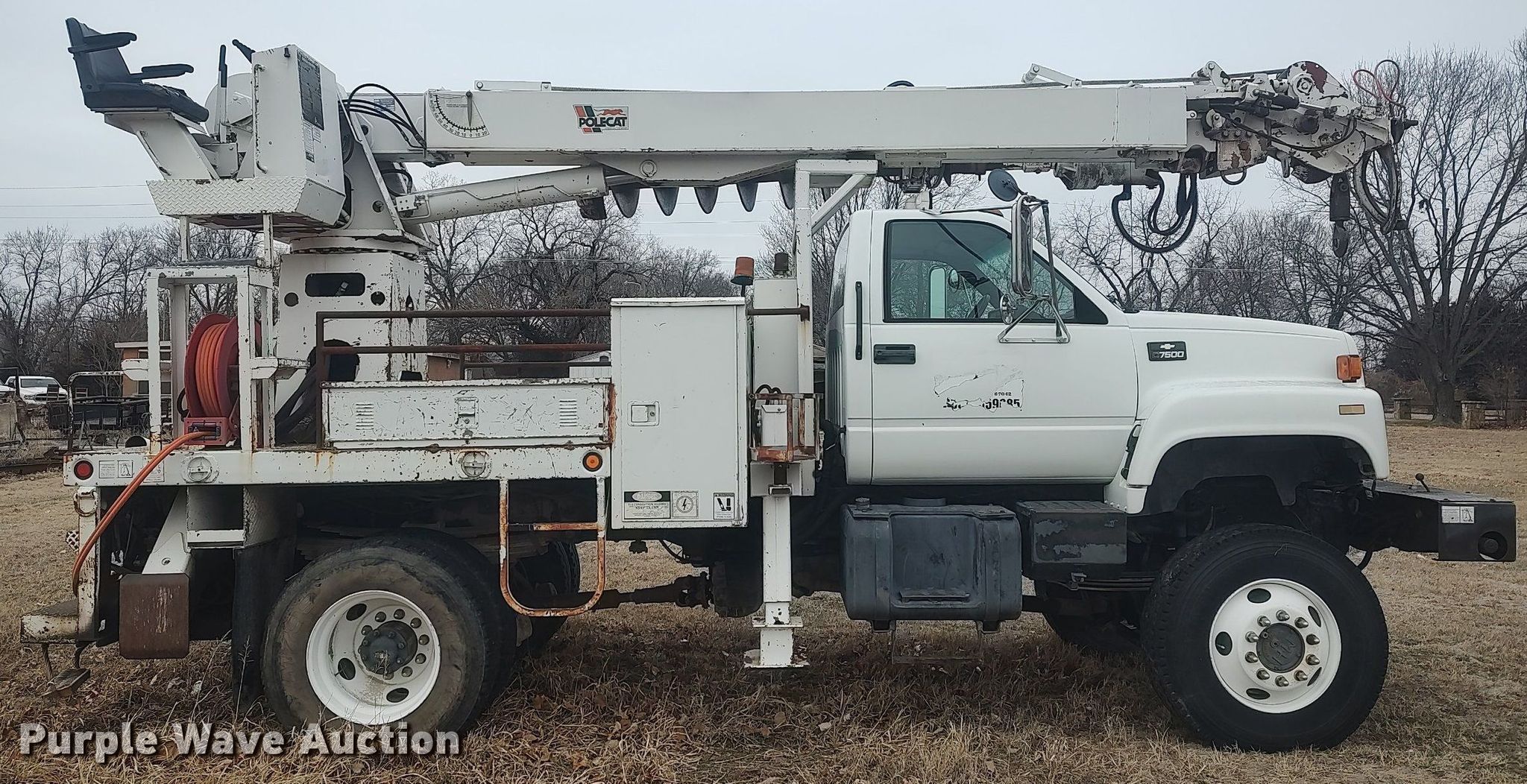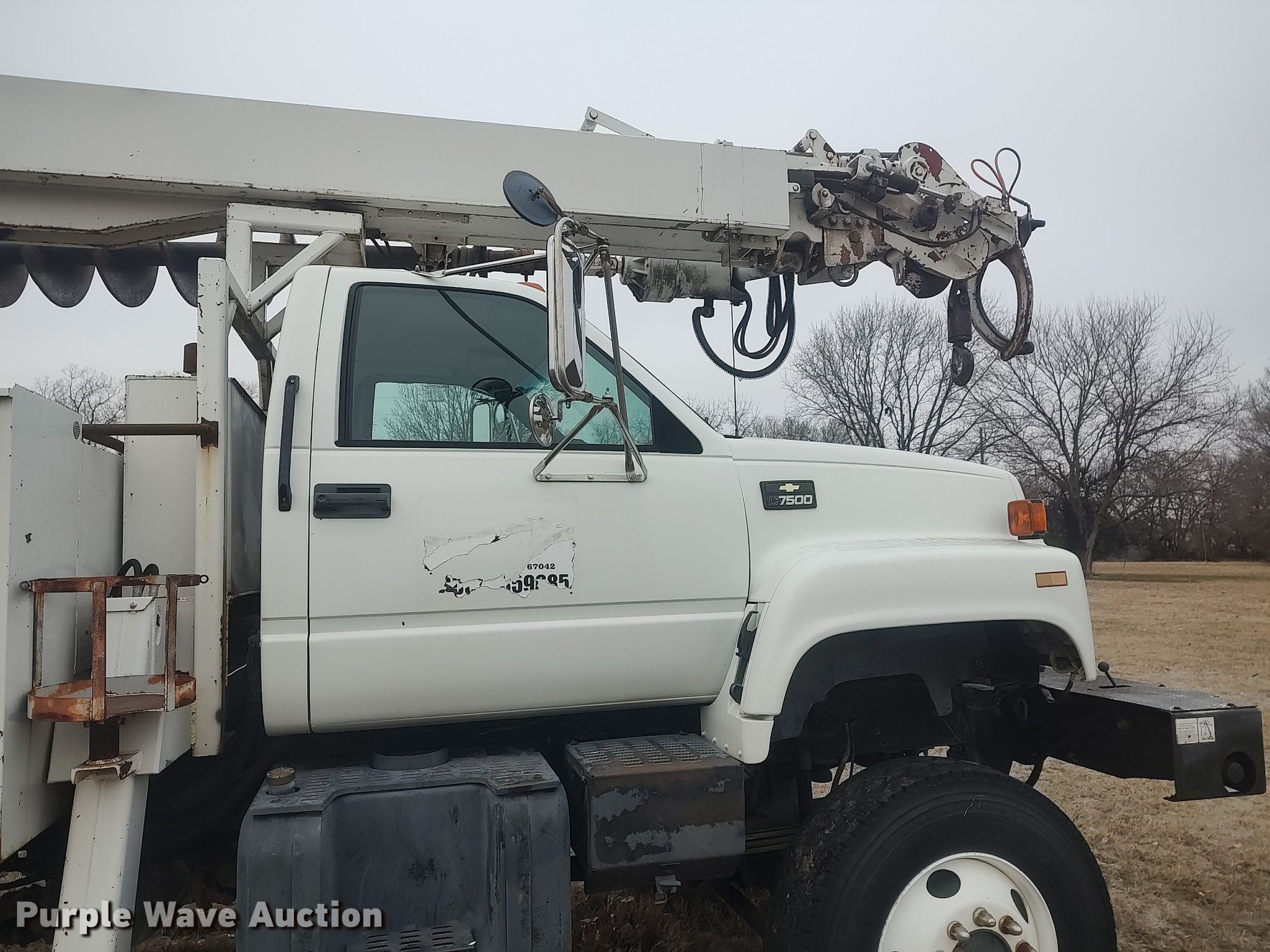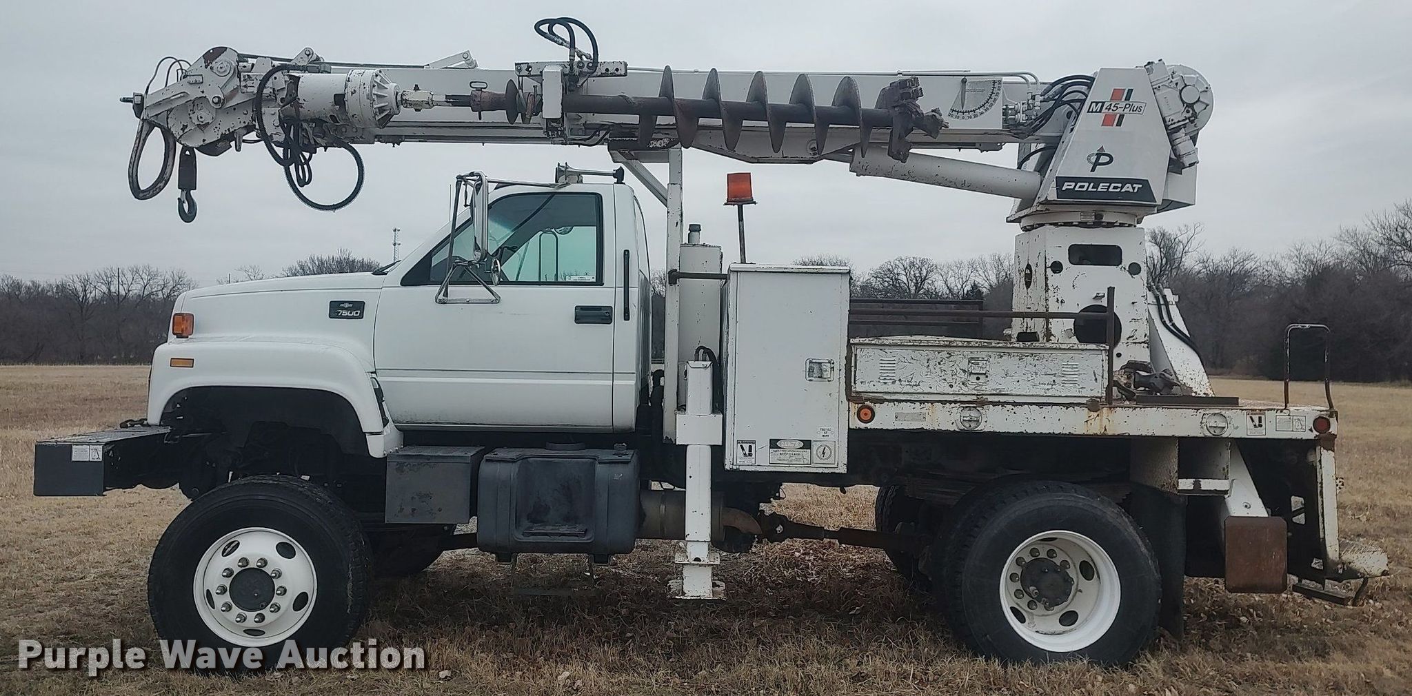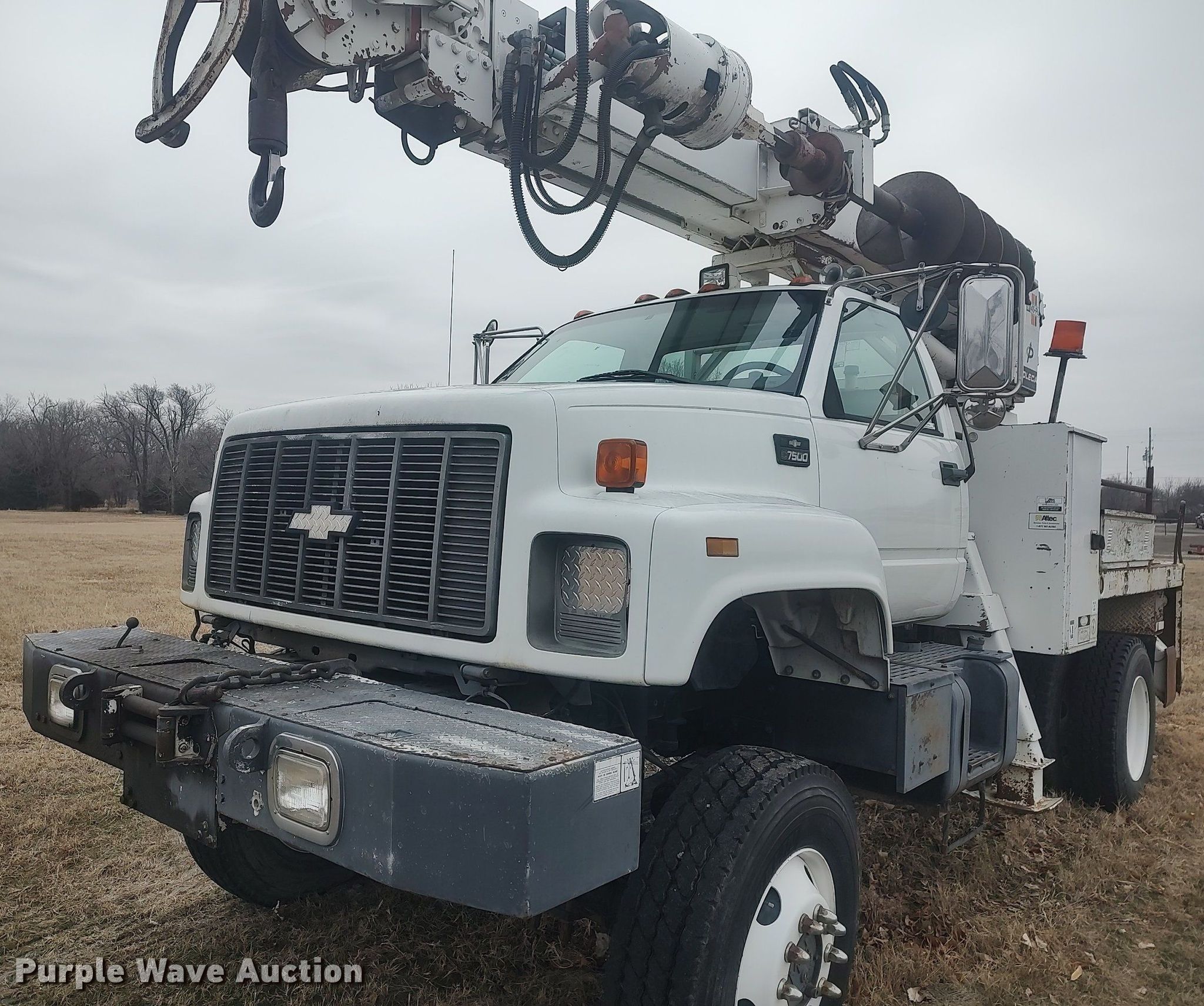 2000 Chevrolet C7500 digger derrick truck. Miles: 102,374 on odometer, VIN: 1GBM7H1C3YJ505223. Engine Caterpillar 3126, Serial: 8YL11012, Displacement: 7.2L, Cylinders: 6, Fuel type: Diesel, HP: 275. Transmission Eaton Fuller, Manual, Speed: 9. Chassis Four wheel drive, Axles: Single, Suspension: Spring, Brakes: Air, PTO, GVWR: 32,000 lbs. Interior AC, Heat, Cruise control. Features Boom Pole cat M 45-Plus, Boom length: 45', Maximum lift capacity: 14,000 lbs, Boom type: Telescopic, Boom controls Platform/ basket, Pole guide, Auger Diameter: 18", Diametter: 8".. Tires Size: 11R22.5. Kansas title. Title distribution may be delayed up to 14 days from verification of funds. Bills Electrical Inc. El Dorado, KS 67042