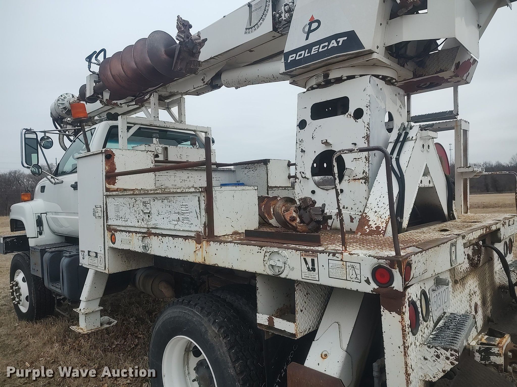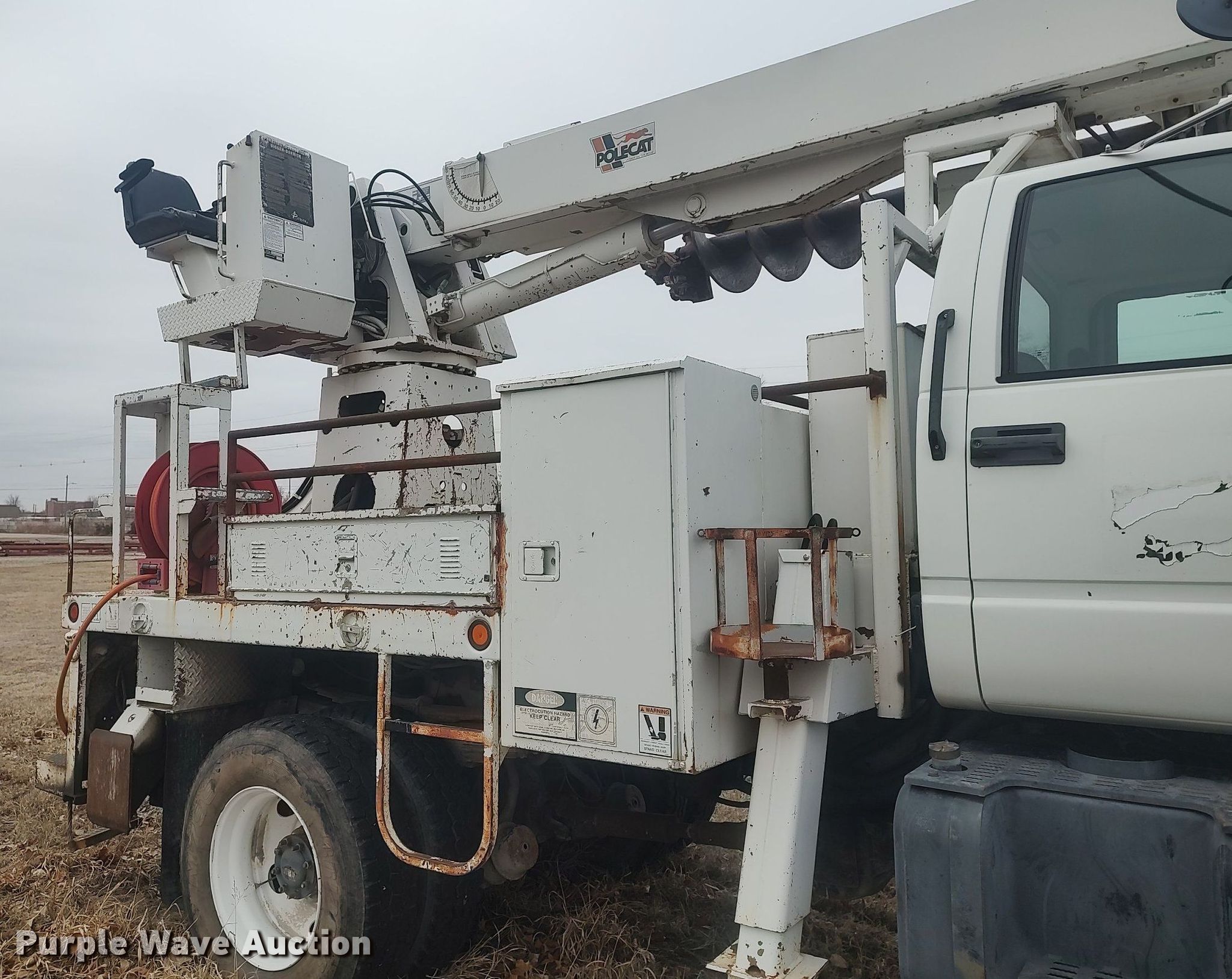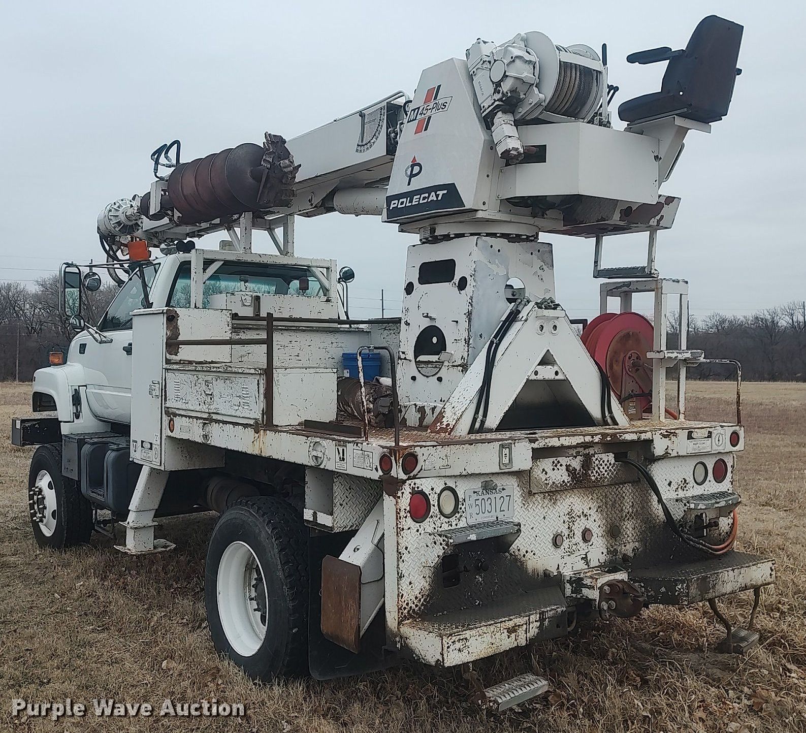 2000 Chevrolet C7500 digger derrick truck. Miles: 102,374 on odometer, VIN: 1GBM7H1C3YJ505223. Engine Caterpillar 3126, Serial: 8YL11012, Displacement: 7.2L, Cylinders: 6, Fuel type: Diesel, HP: 275. Transmission Eaton Fuller, Manual, Speed: 9. Chassis Four wheel drive, Axles: Single, Suspension: Spring, Brakes: Air, PTO, GVWR: 32,000 lbs. Interior AC, Heat, Cruise control. Features Boom Pole cat M 45-Plus, Boom length: 45', Maximum lift capacity: 14,000 lbs, Boom type: Telescopic, Boom controls Platform/ basket, Pole guide, Auger Diameter: 18", Diametter: 8".. Tires Size: 11R22.5. Kansas title. Title distribution may be delayed up to 14 days from verification of funds. Bills Electrical Inc. El Dorado, KS 67042