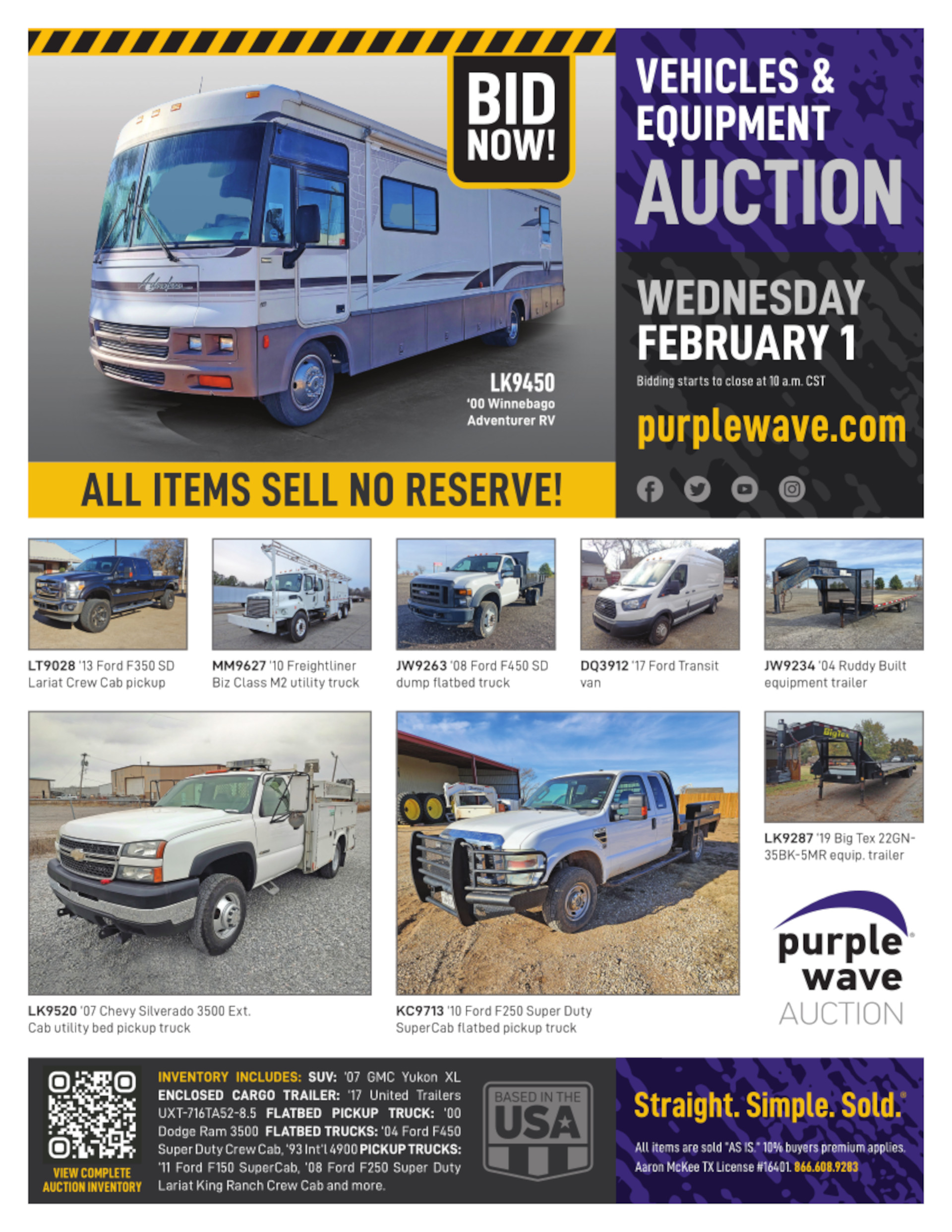 This auction is conducted by Purple Wave, Inc., whose home office is 825 Levee Drive, Manhattan, Kansas. Aaron McKee, Texas auctioneer license # 16401, operates Purple Wave, Inc. Complaints against us may be directed to the Texas Department of Licensing and Regulation, P.O. Box 12157, Austin, Texas 78711, (512) 463-6599. For additional required information, see the attached document.