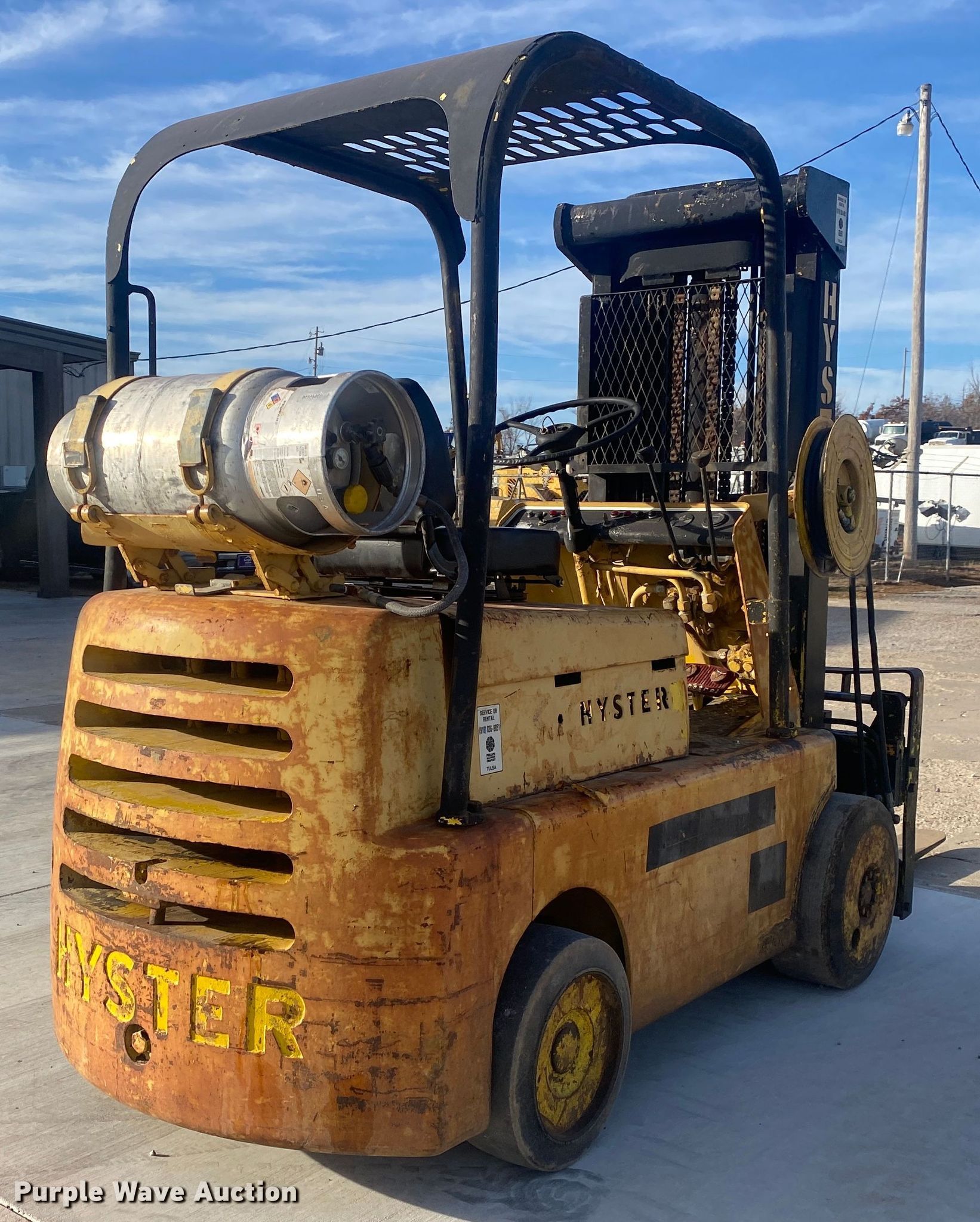 Purple Wave is selling a used Warehouse Forklift in Oklahoma. This item is a Hyster S80 forklift with the following: Hours: 1,234 on meter, Serial: 98635