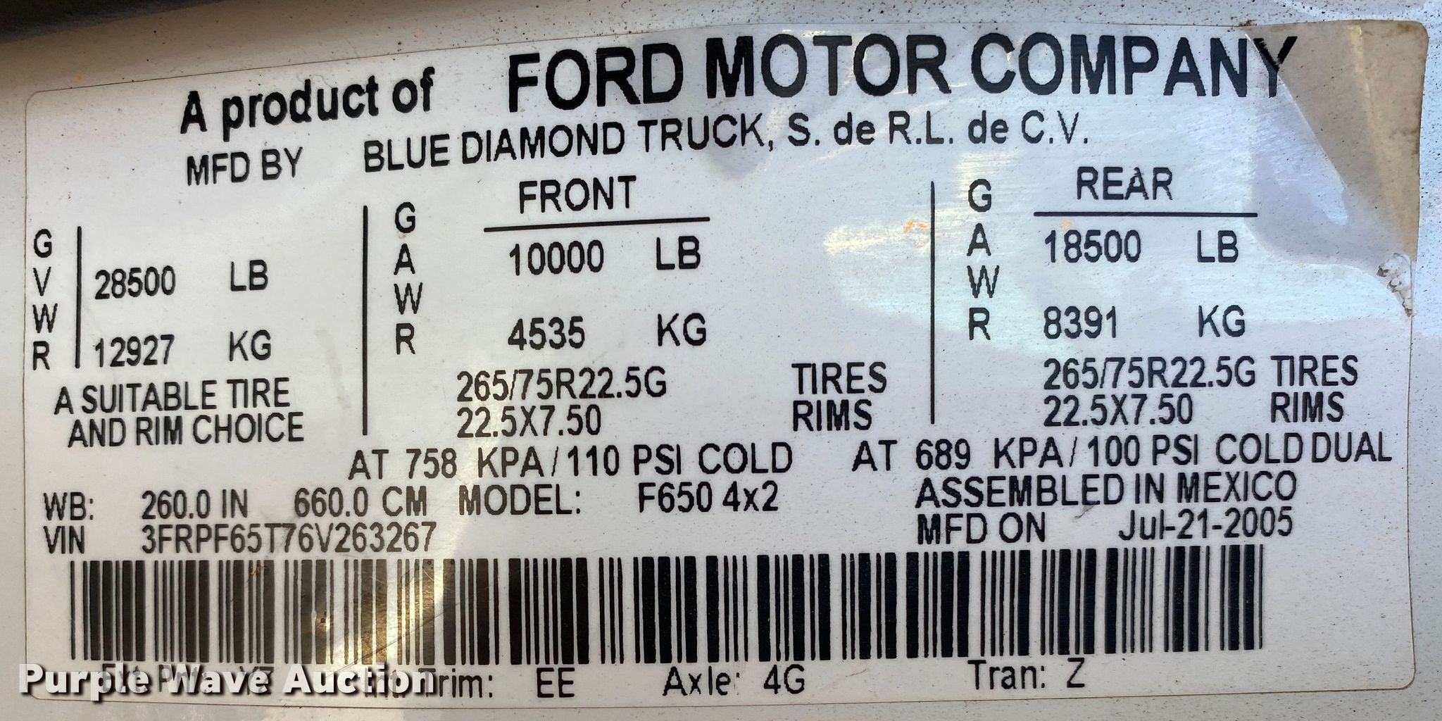 2006 Ford F650 Super Duty flatbed truck. Miles: 140,985 on odometer, VIN: 3FRPF65T76V263267. Engine Caterpillar C7, Displacement: 7.2L, Cylinders: 6, Fuel type: Diesel. Transmission Manual, Speed: 6. Chassis Axles: Single, Suspension: Spring, Brakes: Hydraulic, GVWR: 28,500 lbs, Wheelbase: 260". Interior AC, Heat, Cruise control, Brake controller. Features Flatbed 18' 2" L x 99" W, Removable sides. Tires Size: 295/75R22.5. Oklahoma title. Mileage has not been verified. Exempt will be written in the odometer disclosure on the title. Title distribution may be delayed up to 14 days from verification of funds. 15107 North 137th East Avenue. Collinsville, OK 74021