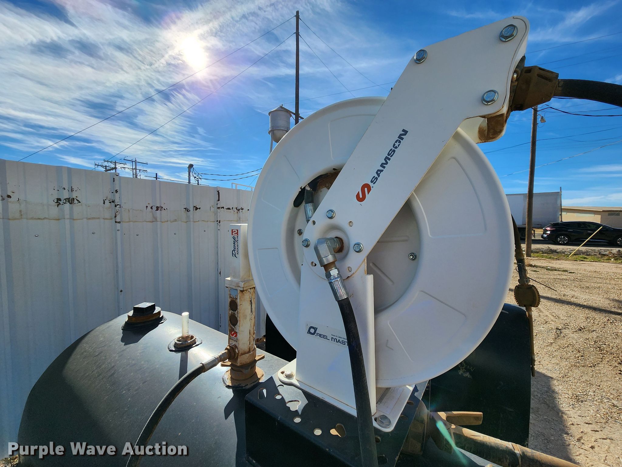 Wendland MFG Corporation oil tank. Serial: A03544, Capacity: 275 gallons, Dimensions: 60" x 27" x 44", Sampson hose reel. Tucker Oil Company Inc. 910 Industrial Drive. Slaton, TX 79364