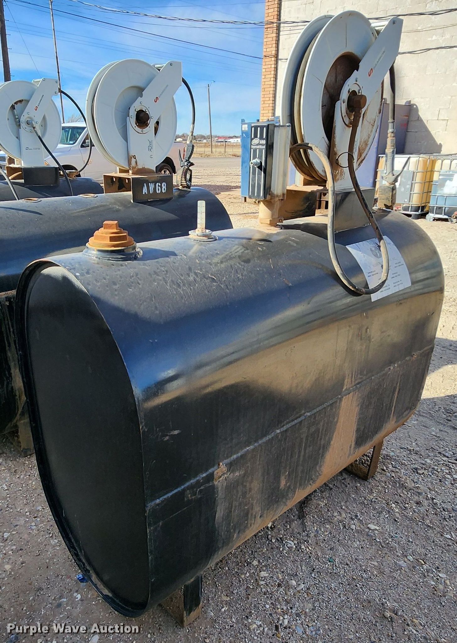 Purple Wave is selling a used Fuel and Lube in Texas. This item is a Wendland MFG Corporation oil tank with the following: Serial: L00658, Capacity: 275 gallons, Dimensions: 60" x 27" x 44", Sampson hose reel