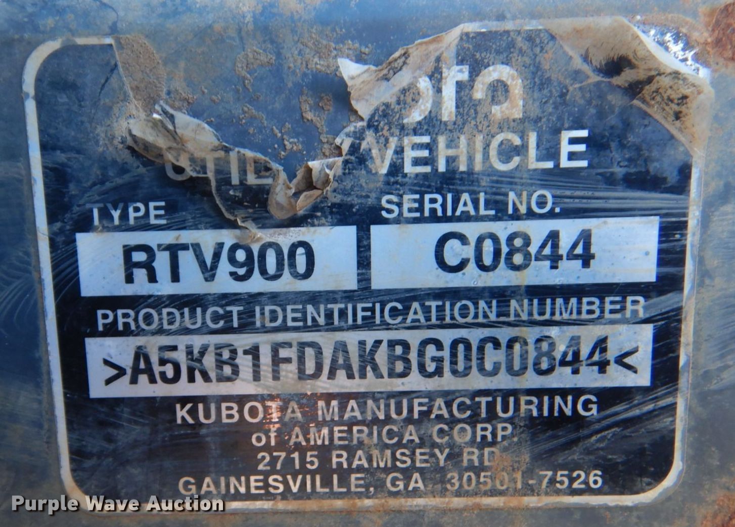 Purple Wave is selling a used Utility Vehicle in Louisiana. This item is a Kubota RTV900 utility vehicle with the following: Hours: 2,533 on meter, VIN: A5KB1FDAKBG0C0844, Serial: C0844
