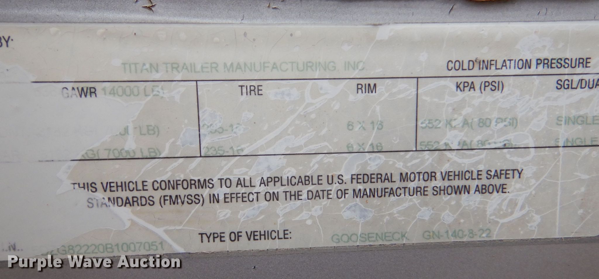 2011 Titan GN-140-8-22 enclosed cargo trailer. VIN: 5DZG82220B1007051. Dimensions Overall: 30' L x 102" W, Body: 22' L x 96" W. Features Deck type: Wood. Chassis Hitch: Gooseneck, Landing gear: Single, Brakes: Electric, Axles: Tandem, GVWR: 14,000 lbs, GAWR: 7,000 lbs. Tires Steel wheels, Size: 235/80R16. Kansas title. Accurate Construction Retirement. 3085 W Sagebrush Rd. Garden City, KS 67846