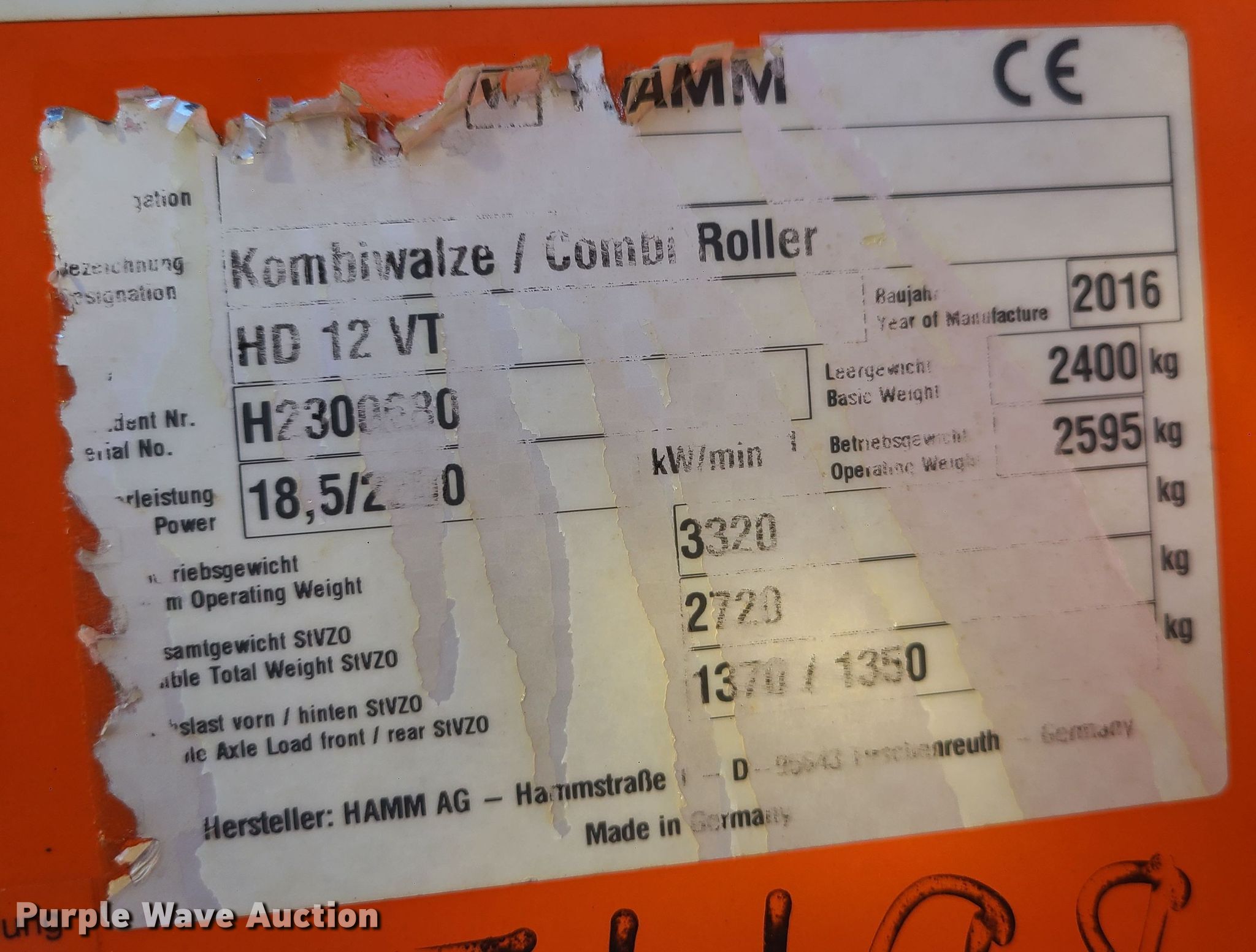 Purple Wave is selling a used Double Drum Roller Compactor in Missouri. This item is a 2016 Hamm HD12 double drum roller with the following: Hours: 1,590 on meter, Serial: H2300680