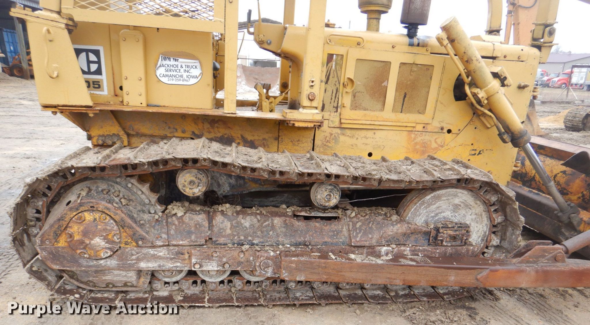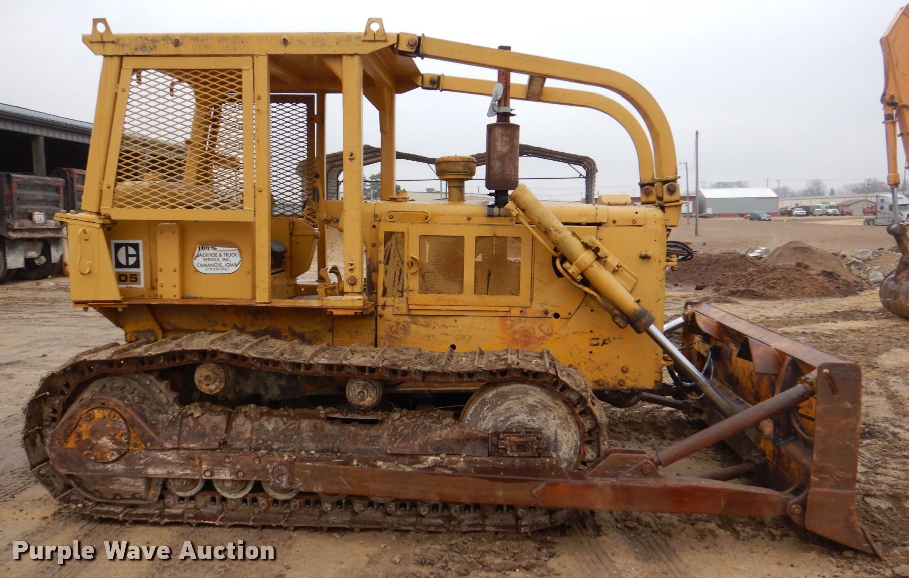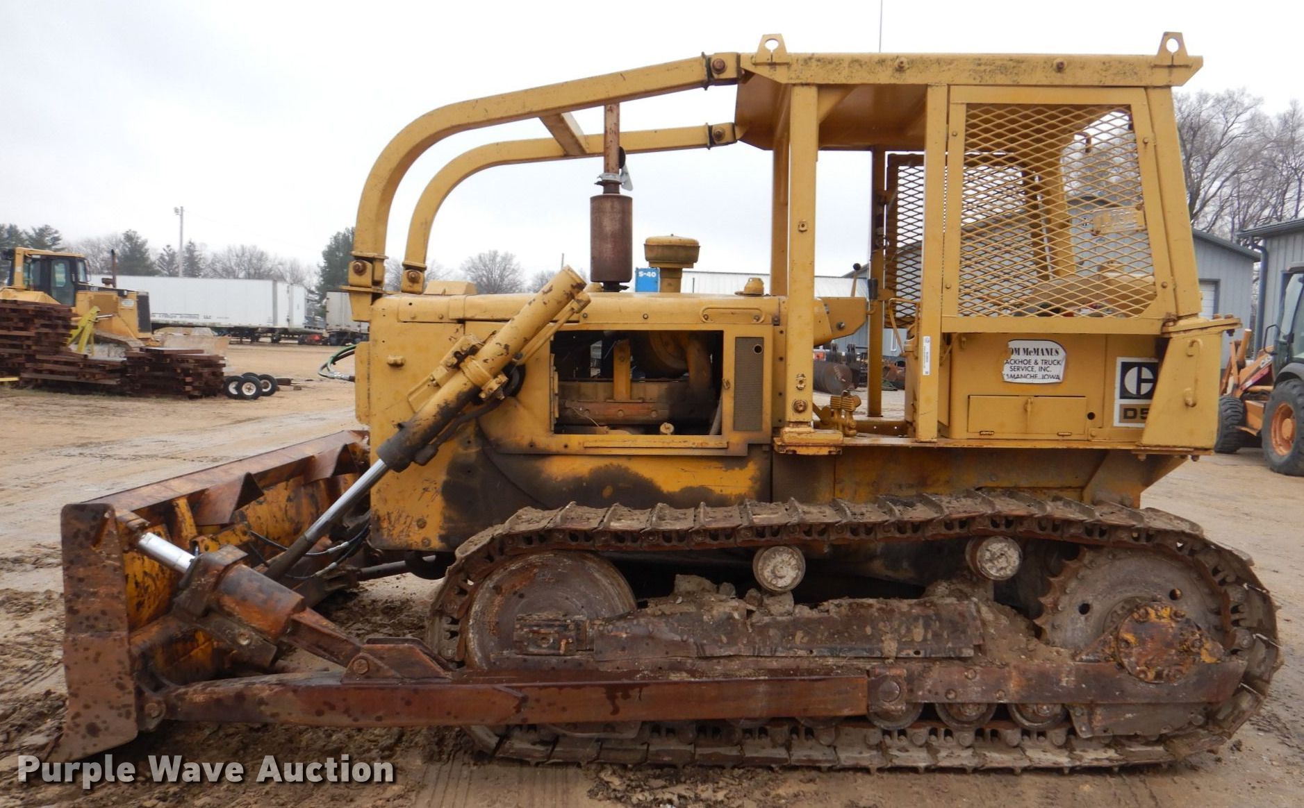 1975 Caterpillar D5 dozer. Hours: 7,872 on meter, Serial: 96J5221. Engine Caterpillar 3306, Cylinders: 6, Fuel type: Diesel. Transmission Powershift, 3F - 3R. Operators station OROPS, Steering: Clutch brake. Features Sweeps, Rear drawbar, Dozer blade Type: Straight, Single-tilt, Width: 112" W. Tracks Width: 20", Grouser pads: Single, Bottom rollers: 6. Notes Engine oil leak. Tom McManus Backhoe and Trucking. 310 U.S. 67. Camanche, IA 52730
