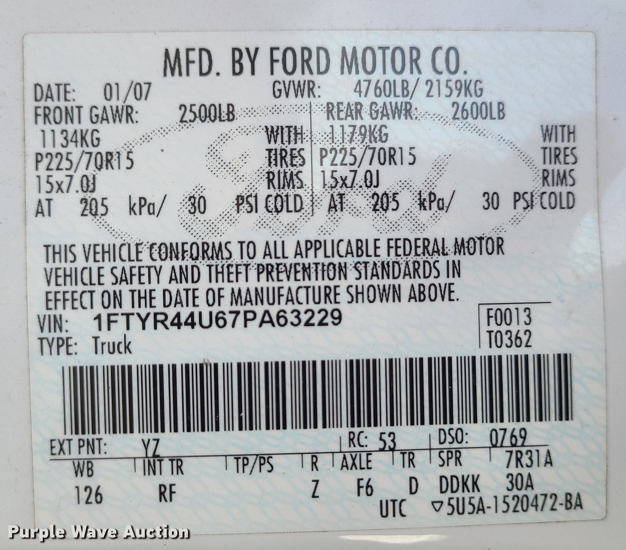 2007 Ford Ranger XLT SuperCab pickup truck. Miles: 84,655 on odometer, VIN: 1FTYR44U67PA63229. Engine Displacement: 3.0L V6 OHV, Cylinders: 6, Fuel type: Gas. Transmission Automatic. Interior AC, Heat, Power windows, Power locks. Tires Size: 225/70R15. Notes Dash warning indicator: TPMS, Dead battery, Possible suspension issues, ball joints need replaced. Missouri title. Title distribution may be delayed up to 14 days from verification of funds. City of Independence. 111 E Maple Ave. Independence, MO 64050