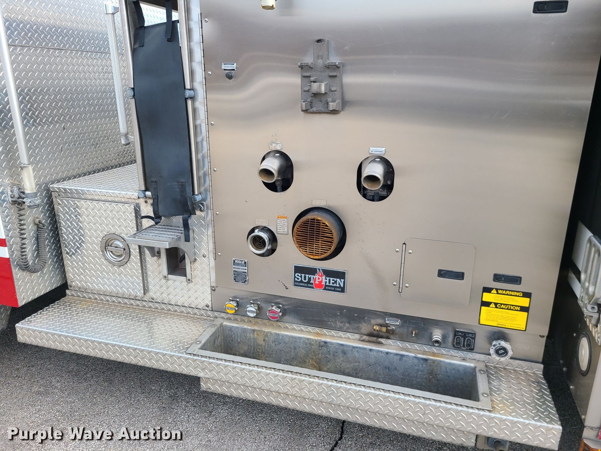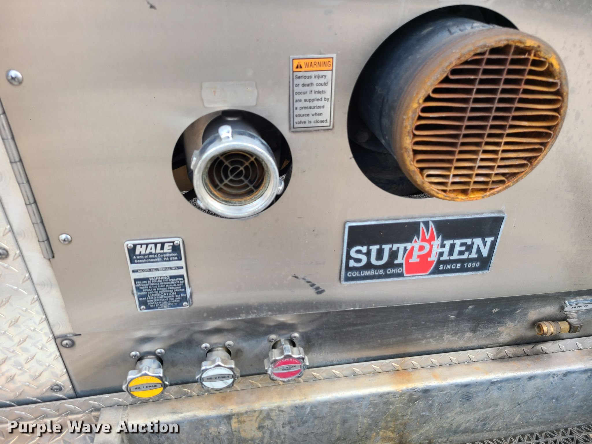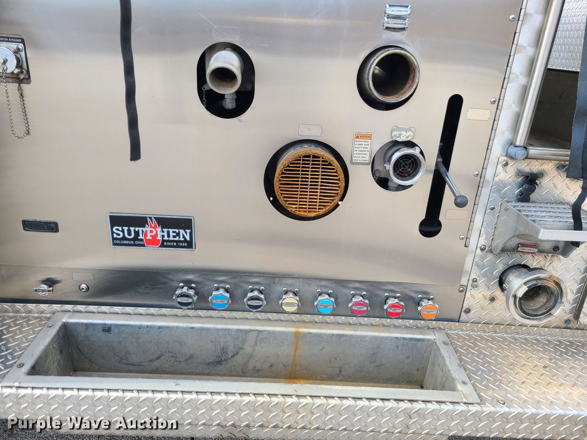 2007 Sutphen fire truck. Miles: 90,993 on odometer, VIN: 1S9A1HLD272003101. Engine Cummins ISM, Cylinders: 6, Fuel type: Diesel. Transmission Automatic. Chassis Axles: Single, Suspension: Spring, Brakes: Air. Interior AC, Heat. Features Fire truck body Stuphen, 1,758 gpm, Ground ladder, Hose. Tires Front: 385/65R22.5, Rear: 12R22.5. Notes Non-operational pump, failed test. Missouri title. Title distribution may be delayed up to 14 days from verification of funds. City of Independence. 111 E Maple Ave. Independence, MO 64050