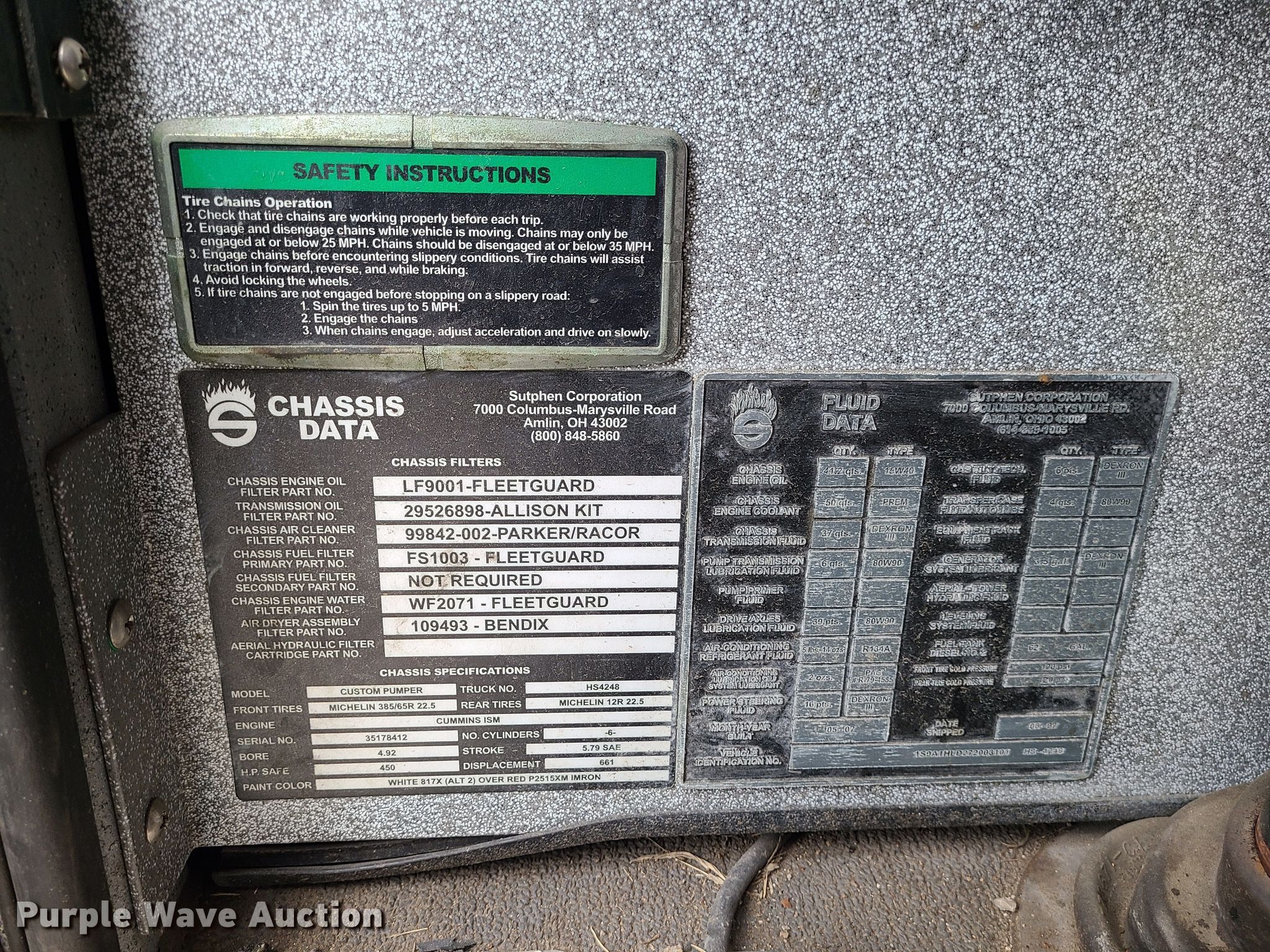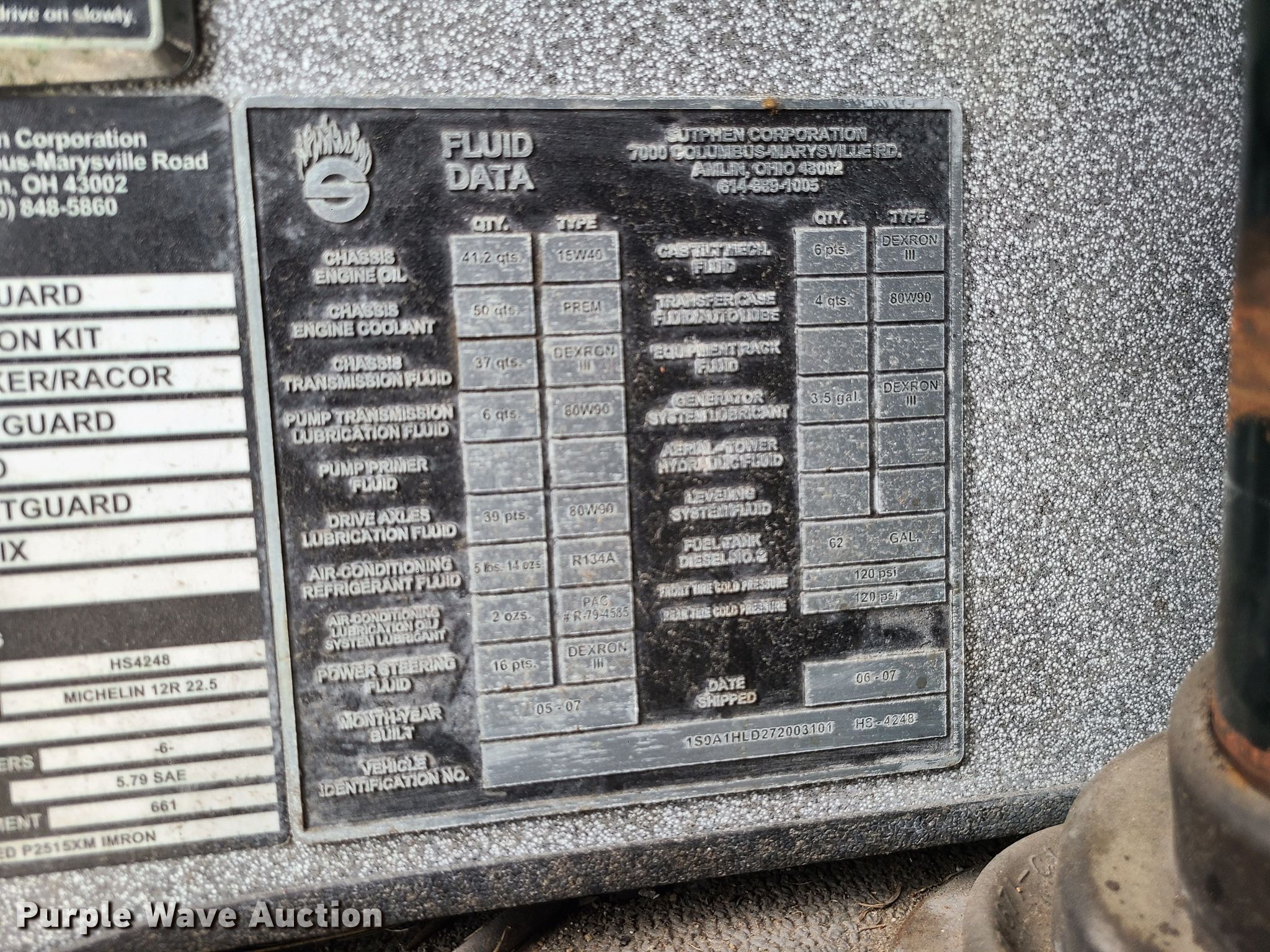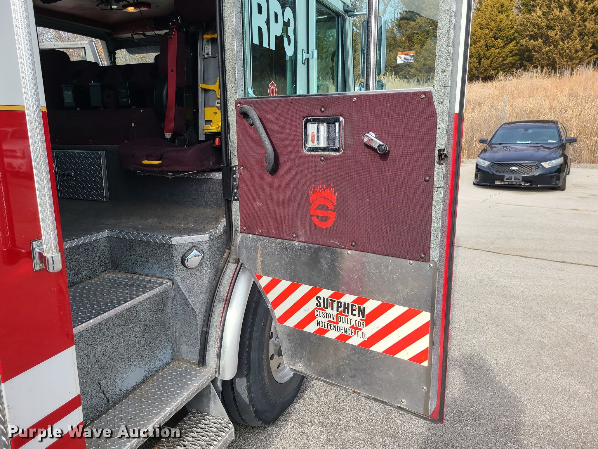 2007 Sutphen fire truck. Miles: 90,993 on odometer, VIN: 1S9A1HLD272003101. Engine Cummins ISM, Cylinders: 6, Fuel type: Diesel. Transmission Automatic. Chassis Axles: Single, Suspension: Spring, Brakes: Air. Interior AC, Heat. Features Fire truck body Stuphen, 1,758 gpm, Ground ladder, Hose. Tires Front: 385/65R22.5, Rear: 12R22.5. Notes Non-operational pump, failed test. Missouri title. Title distribution may be delayed up to 14 days from verification of funds. City of Independence. 111 E Maple Ave. Independence, MO 64050