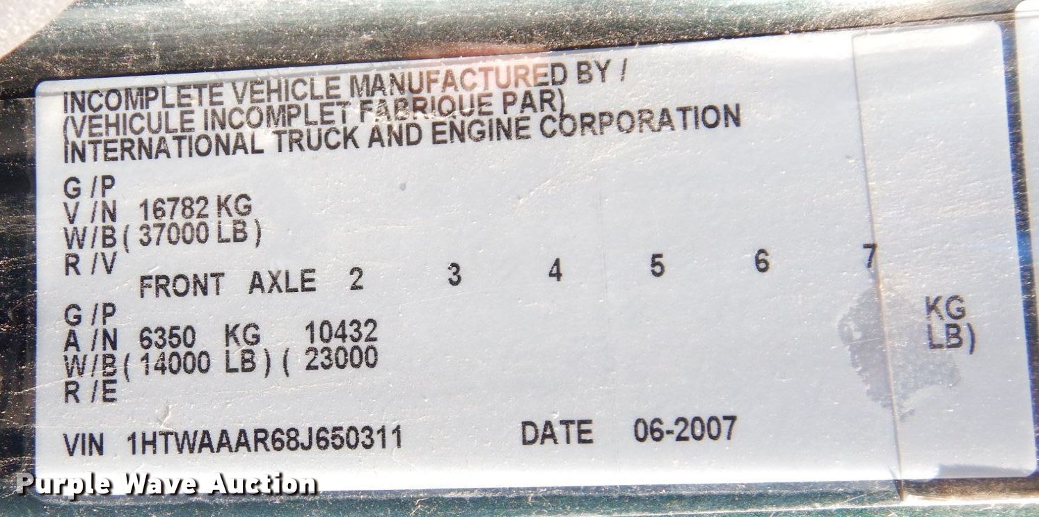 2008 International WorkStar 7300 dump truck. Miles: 16,064 on odometer, Hours: 1,355 on meter, VIN: 1HTWAAAR68J650311, Unit #: 615. Engine International GDT155, Displacement: 7.6L, Cylinders: 6, Fuel type: Diesel. Transmission Allison, Automatic. Chassis Axles: Single, Suspension: Spring, Brakes: Air, PTO, GVWR: 37,000 lbs FAWR: 14,000 lbs, RAWR: 23,000 lbs, Wheelbase: 172". Interior AC, Heat, Heated mirrors, Cruise control, Brake controller. Features Dump bed Warren U-10, Capacity: 6 cu.yd., 10' L x 7' 8" W, Side height: 25", Bed type: Steel, Roll tarp, Ram: Single , End gate: Manual. Tires Size: 12R22.5. Spreader Warren AC2420A-10, Capacity: 6.2 cu.yd.. Plow Monroe MP41R10-ISCT, Width: 120". Kansas title. Seller is a government entity who will be assigning and distributing the title. Please contact the seller for distribution questions. Leawood, KS 66210