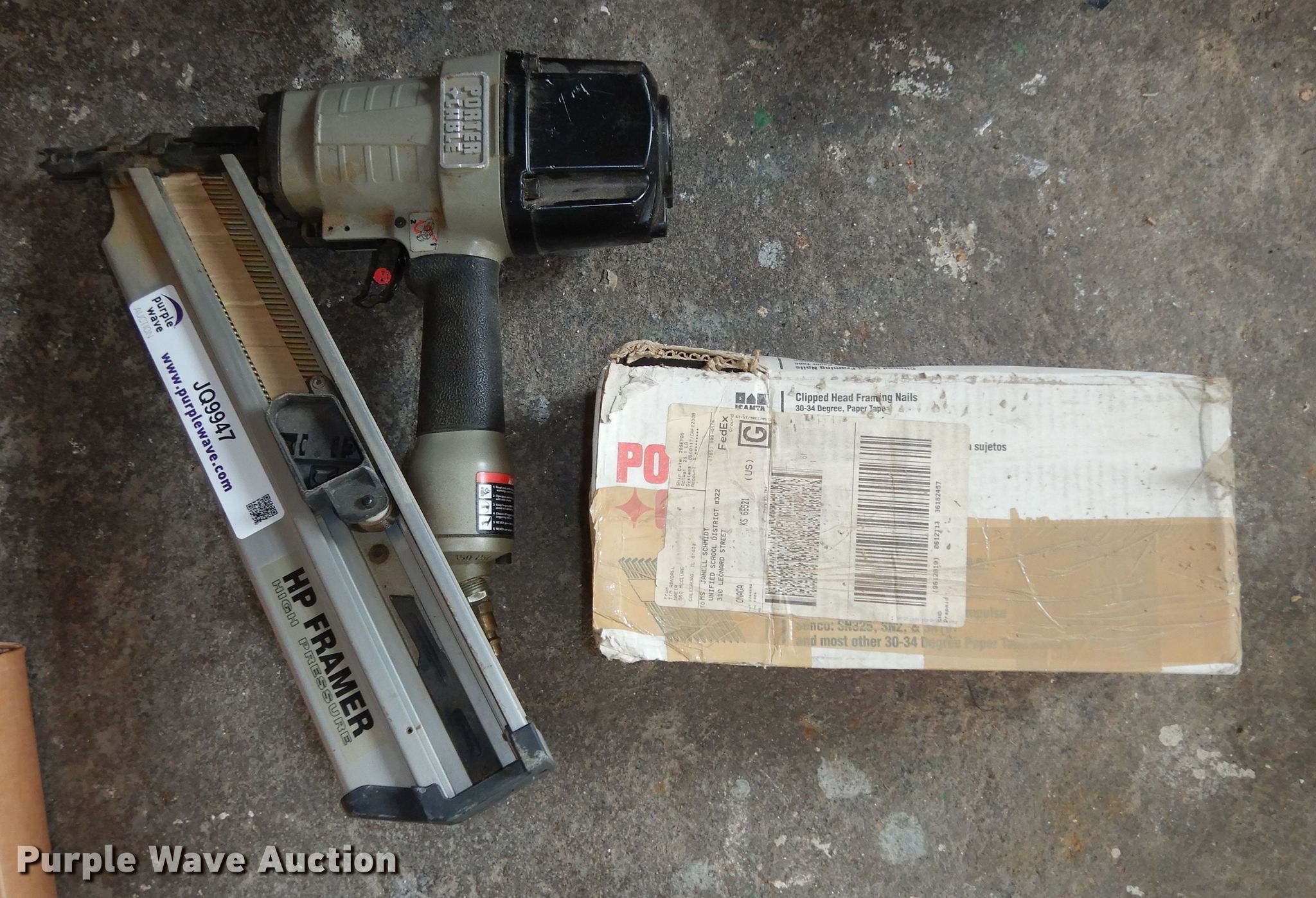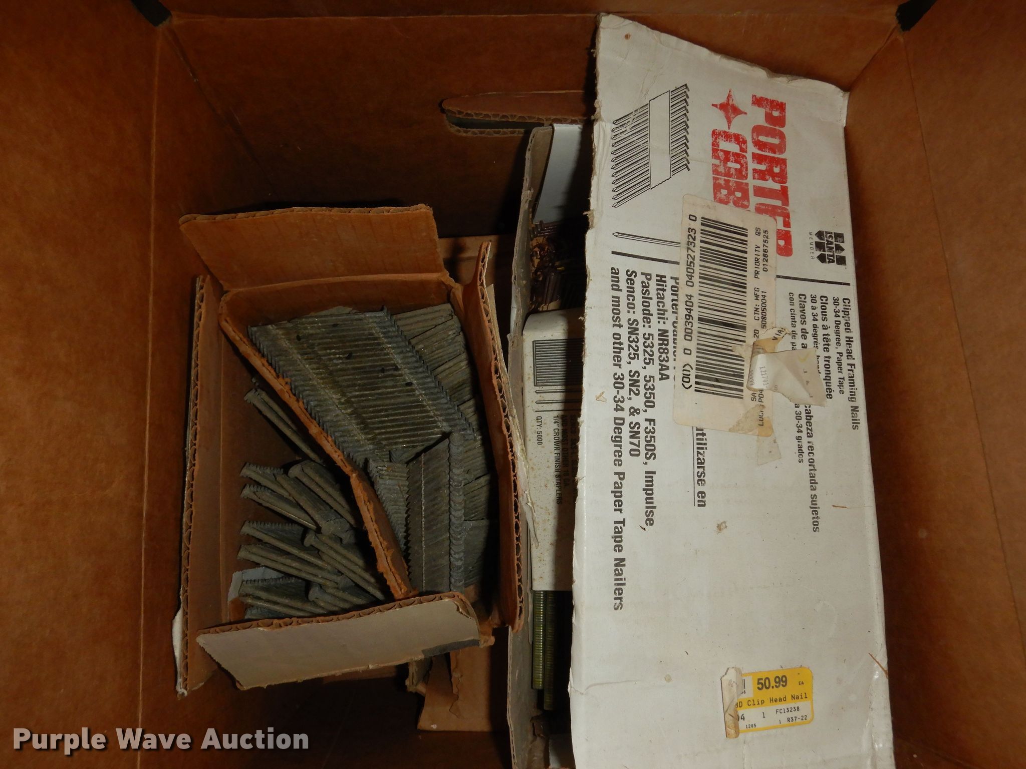 Purple Wave is selling a used Tools in Kansas. This item is a Porter Cable framing nail gun with the following: Boxes of nails, Unknown quantity