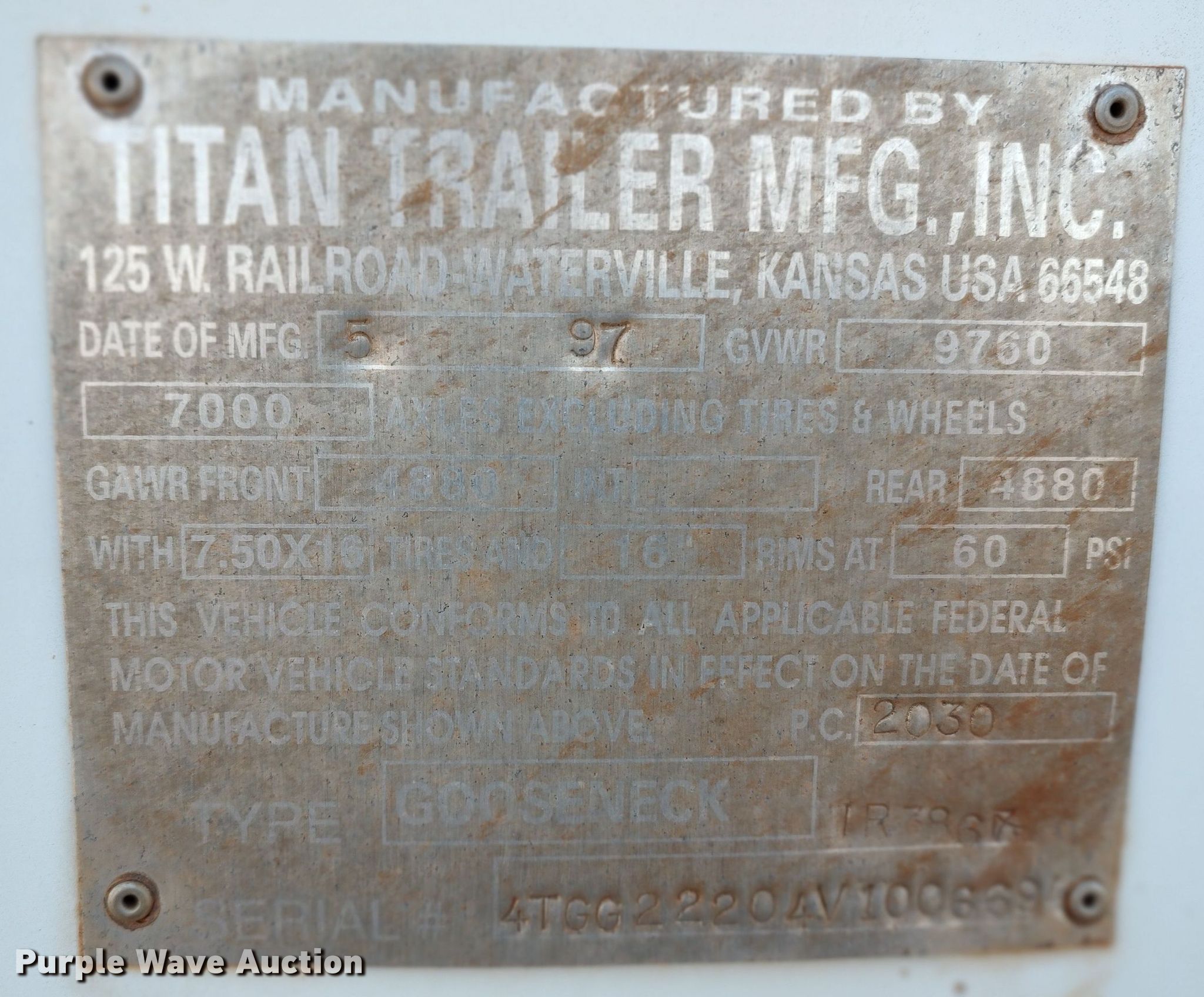 1997 Titan livestock trailer. VIN: 4TGG22204V1006694. Dimensions Overall: 30' L x 96" W, Body: 23' L x 78" W. Features Center gates: 1, Ground load, Rubber floor mat. Chassis Hitch: Gooseneck, Landing gear: Single, Suspension: Spring, Brakes: Electric, Axles: Tandem, GVWR: 9,760 lbs. Tires Size: 235/85R16. Transfer of ownership documentation will be a bill of sale. 604 East Oklahoma Street. Hennessey, OK 73742
