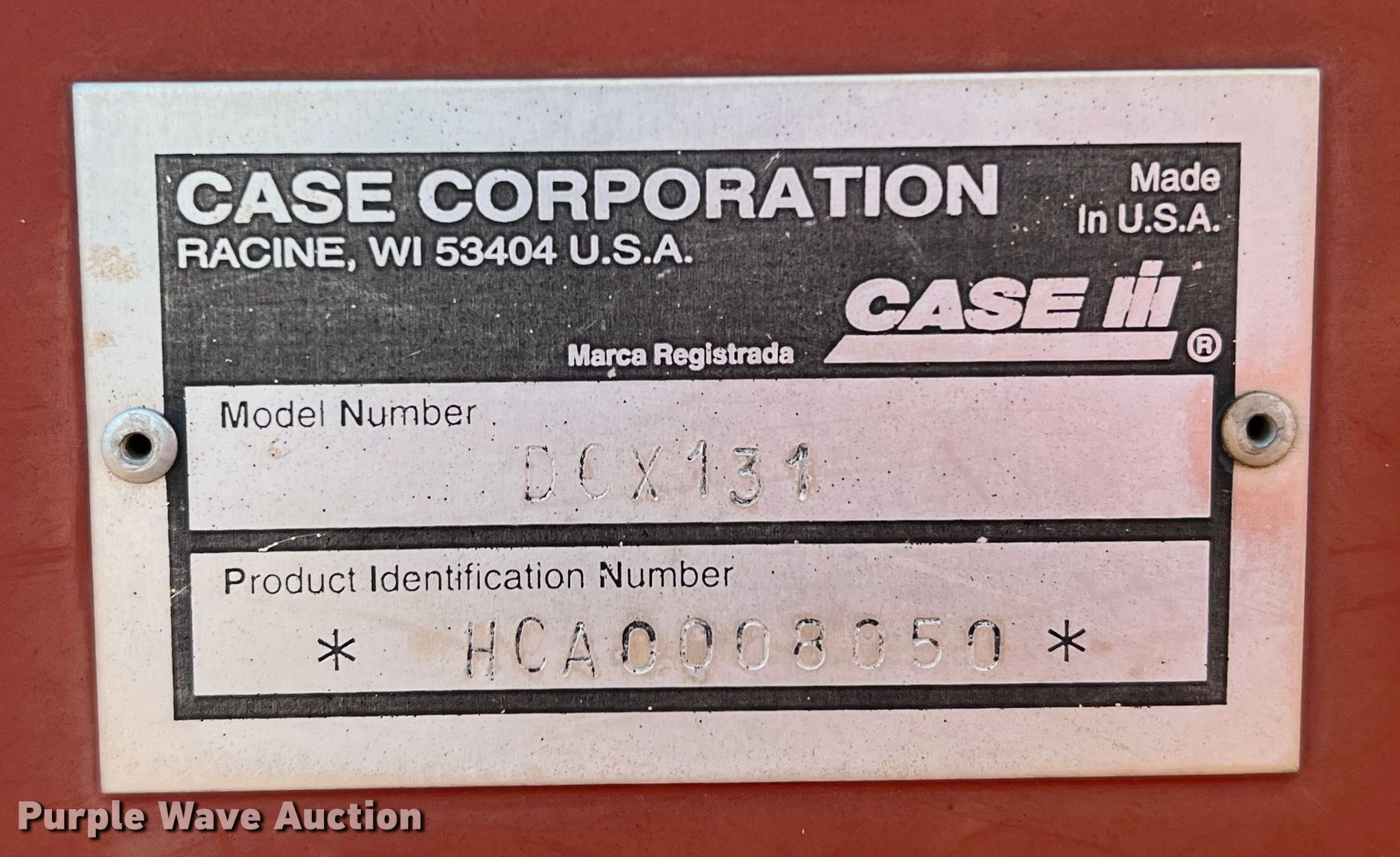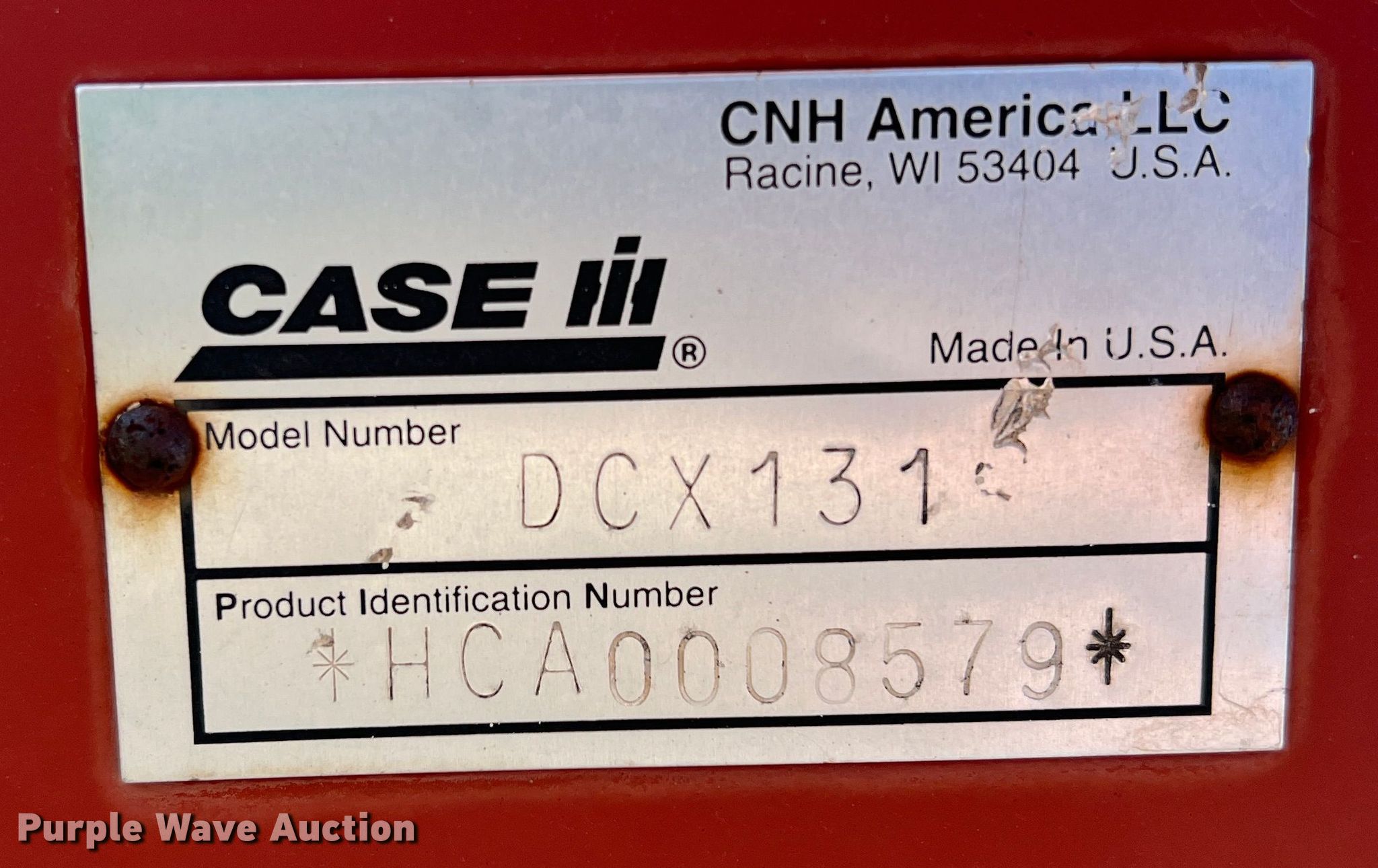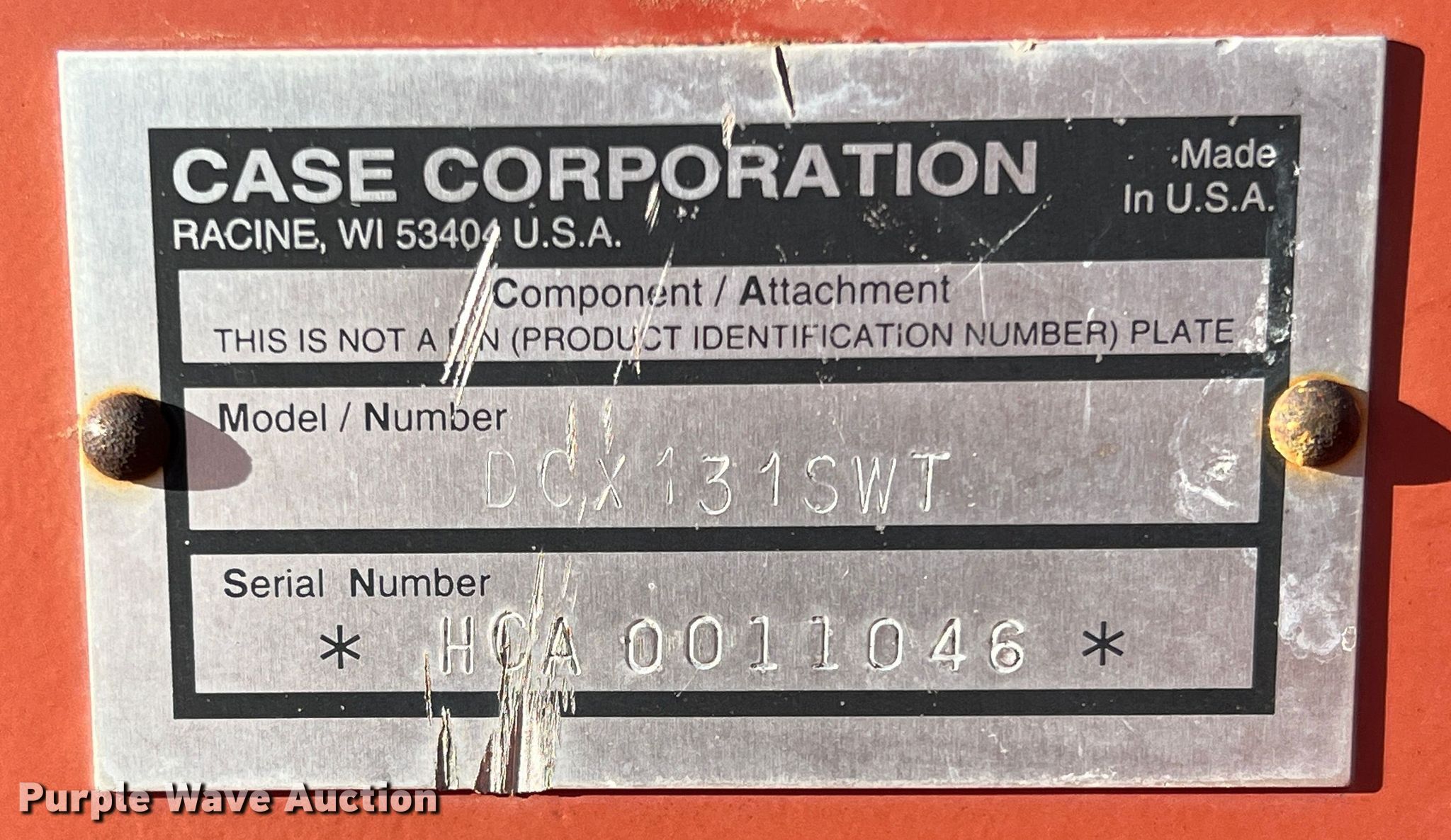 (2) windrowers. Case DCX131SWT. Serial: HCA0011046. Features PTO: 1000, Hitch Two point, Head Disc, Case DCX131, Serial: HCA0008050, Width: 13', Conditioners: Rubber/ rubber. Tires Rear: 13.50-15. Case DCX131. Notes Additional parts, Unit disassembled, parts may be missing, Non-operational unit. 4E Farms. County Road 2590. Walters, OK 73572