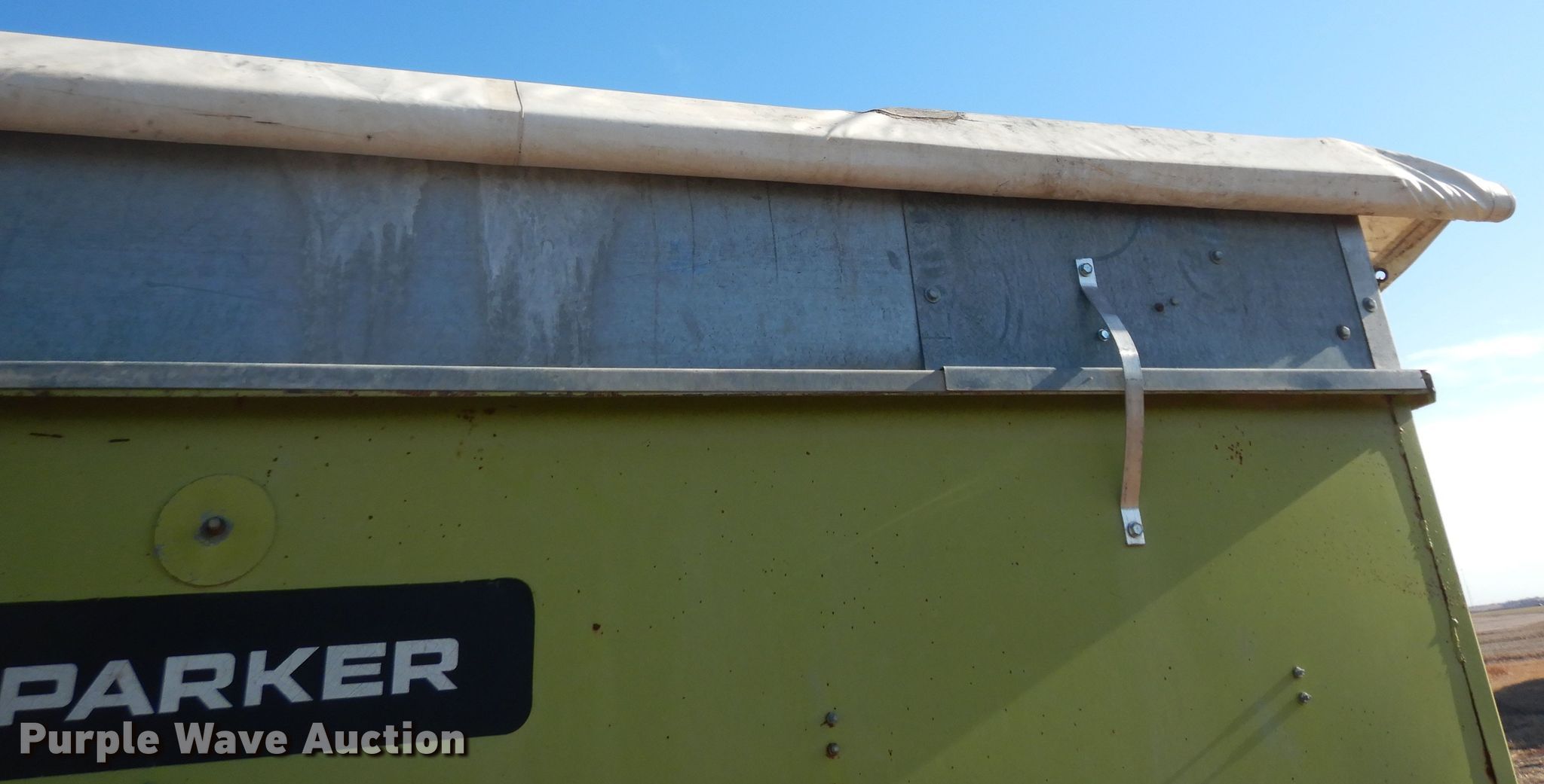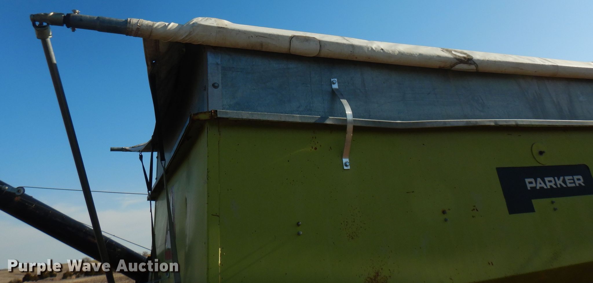 Parker J2100 gravity wagon. Serial: 7222717. Features Auger diameter: 6" Length: 15', Lift: Hydraulic, Roll tarp. Tires Front: 11L-15, Brand: Firestone. Abilene, KS 67410