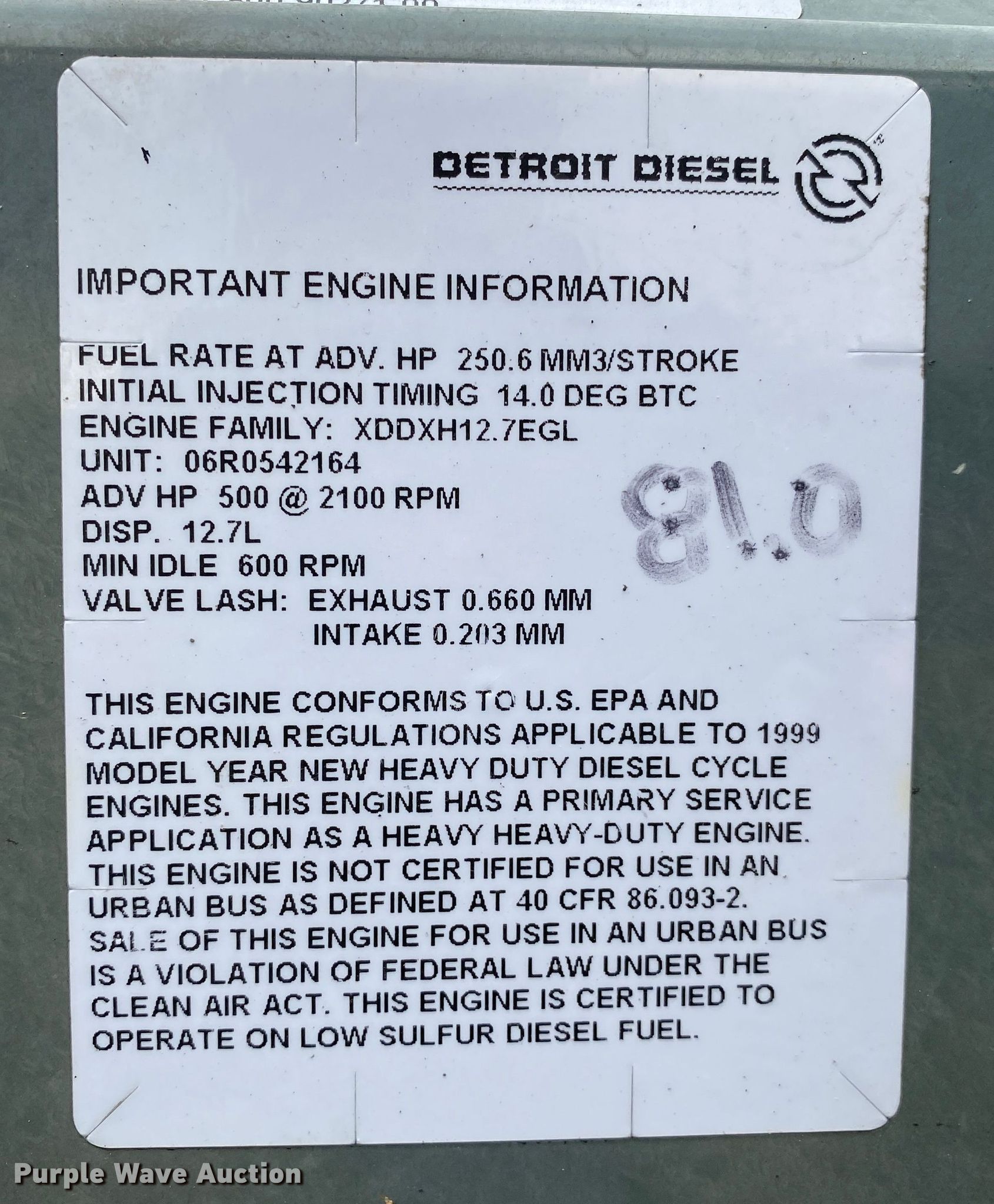 2000 Freightliner FLD semi truck. Miles: 842,956 on odometer, VIN: 1FUPCSZB0YPB96154. Engine Detroit Diesel, Displacement: 12.7L, Cylinders: 6, Fuel type: Diesel, HP: 500, Engine brake. Transmission Eaton Fuller, Manual, Speed: 13. Chassis Axles: Tandem, Differential lock: Inter-axle, Suspension: Air Dump valves, Brakes: Air, GVWR: 52,000 lbs FAWR: 12,000 lbs, IAWR: 20,000 lbs, RAWR: 20,000 lbs. Interior AC, Heat, Air ride cab, Sleeper Sleeper length: 5', Beds: Double bunk. Features Fifth wheel type: Air operated, Sliding, Fuel tank: Dual. Tires Front: 285/75R24.5, Rear: 275/80R24.5. Notes Dash warning indicator: Tractor ABS, Windshield chipped or cracked. Oklahoma title. Title distribution may be delayed up to 14 days from verification of funds. 15107 North 137th East Avenue. Collinsville, OK 74021