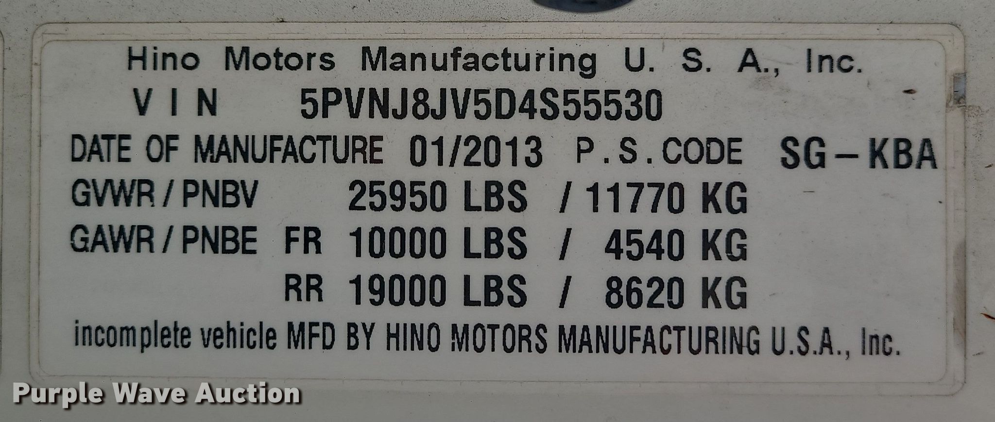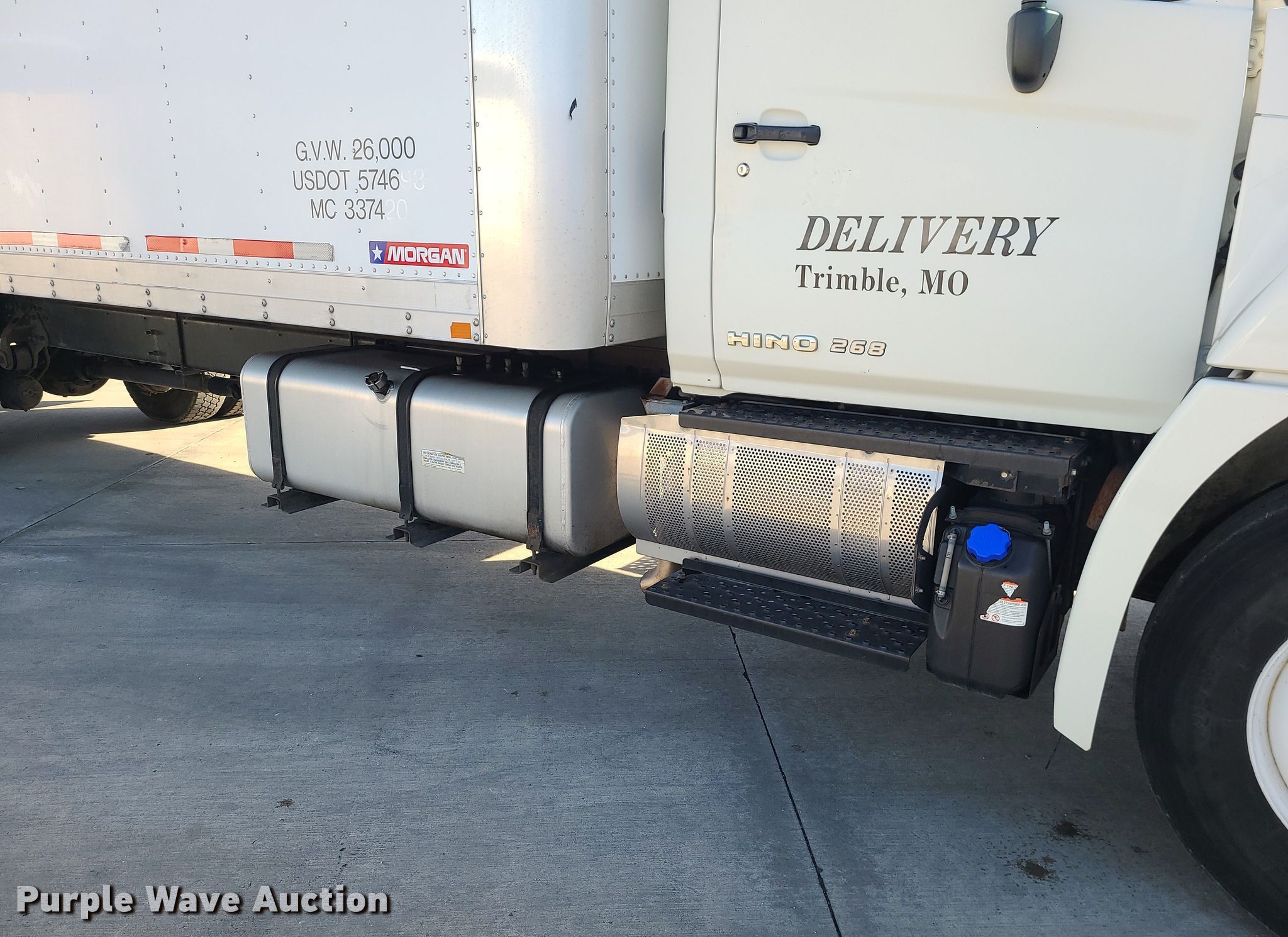 2013 Hino 268 box truck. Miles: 410,327 on odometer, VIN: 5PVNJ8JV5D4S55530. Engine Hino J08E-VC, Displacement: 7.6L, Cylinders: 6, Fuel type: Diesel. Transmission Automatic. Chassis Axles: Single, Suspension: Air, Brakes: Air, GVWR: 25,959 lbs. Interior AC, Heat, Power windows, Power locks. Features Box bed Morgan, 26' L x 102" W x 102" H, Floor: Wood, End gate lift. Tires Front: 295/75R22.5, Rear: 11R22.5. Missouri title. Title distribution may be delayed up to 14 days from verification of funds. LT Delivery, Inc.. 5034 Northwest Waukomis Drive. Northmoor, MO 64151