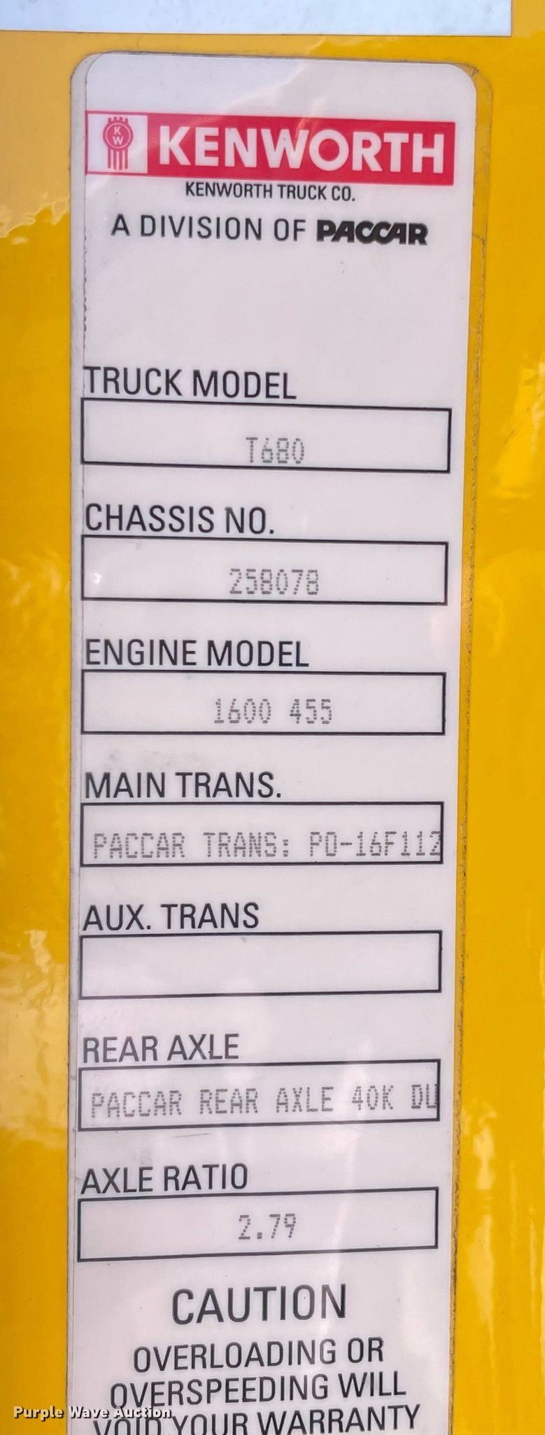 2019 Kenworth T680 semi truck. Miles: 742,647 on odometer, Hours: 15,153 on meter, VIN: 1XKYDP9X7KJ258078, Unit #: 2562. Engine Paccar MX-13, Serial: Y169680, Displacement: 12.9L, Cylinders: 6, Fuel type: Diesel, Engine brake. Transmission Automated manual. Chassis Axles: Tandem, Differential lock: Inter-axle, Suspension: Air Dump valves, Brakes: Air, Wet kit, GVWR: 50,350 lbs FAWR: 12,350 lbs, IAWR: 19,000 lbs, RAWR: 19,000 lbs. Interior AC, Heat, Heated mirrors, Power windows, Power locks, Cruise control, Air ride cab. Features Deck plate: Aluminum, Fifth wheel type: Fixed, Fuel tank: Single. Tires Front: 295/75R22.5, Rear: 445/50R22.5. Oklahoma title. Title distribution may be delayed up to 30 days from verification of funds. 10220 W Reno Ave. Oklahoma City, OK 73127