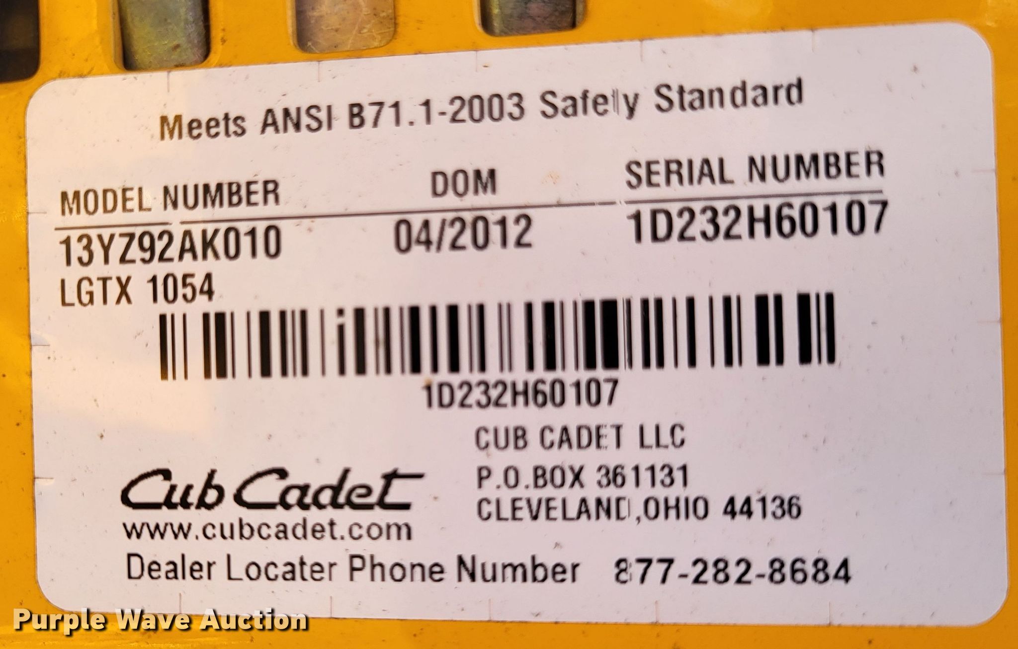 Purple Wave is selling a used Lawn Mower in Missouri. This item is a Cub Cadet LGTX 1054 lawn mower with the following: Hours: 11 on meter, Miles or hours may vary, unit still in use, Cutting width: 54", Serial: S1D232H60107