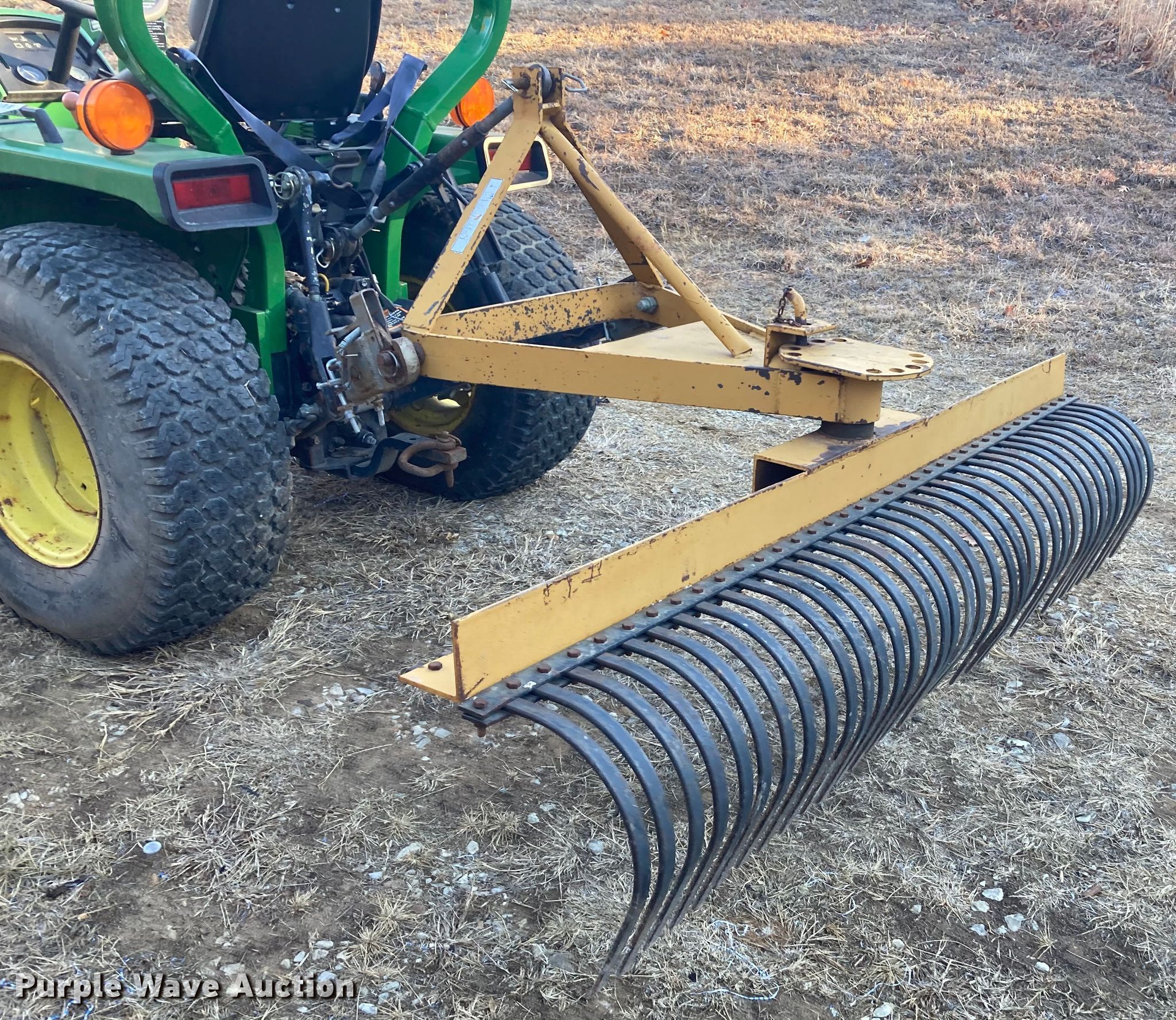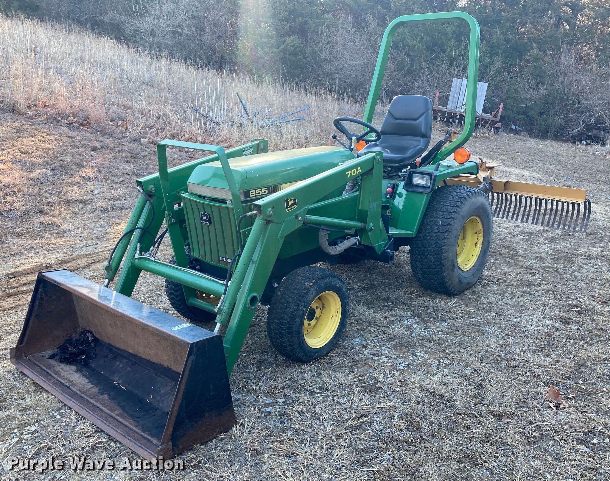 John Deere 855 MFWD tractor. Hours: 927 on meter, Serial: LV0855D181837. Engine John Deere 3TN75RJ, Serial: CH30330022448, Cylinders: 3, Fuel type: Diesel. Transmission Hydrostatic. Features PTO: 540, Three point Top link, Loader John Deere 70A, Controls: Joystick, Bucket Width: 55".. Tires Front: 23x8.50-12, Rear: 33x12.50-15. King Cutter landscape rake Width: 72". King Kutter mower Width: 60", Hitch: Three-point, PTO: 540. Wallace jib Length: 72", Hitch: Three-point. View repairs. Salina, KS 67401