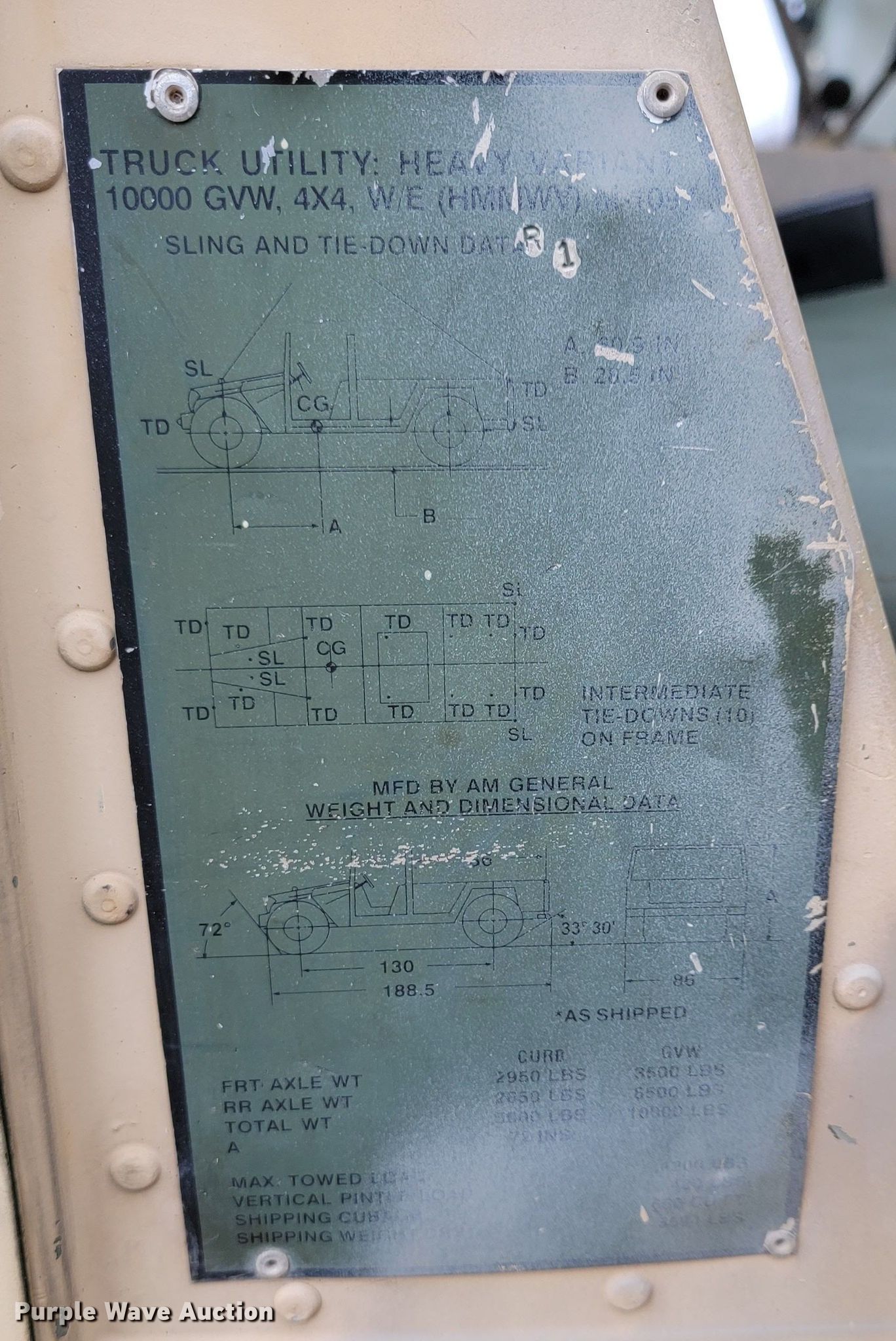 2007 Am General M1097R1 Humvee SUV. Miles: 15,762 on odometer, VIN: 606684. Engine Displacement: 6.5L, Cylinders: 8, Fuel type: Diesel. Transmission Automatic, Four wheel drive. Features Bed 83" L x 52" W. Tires Size: 37x12.50R16.5. International bidders restricted from bidding. Oklahoma title. Sundance Equipment & Truck Sales. 17251 E Virgin. Tulsa, OK 74116