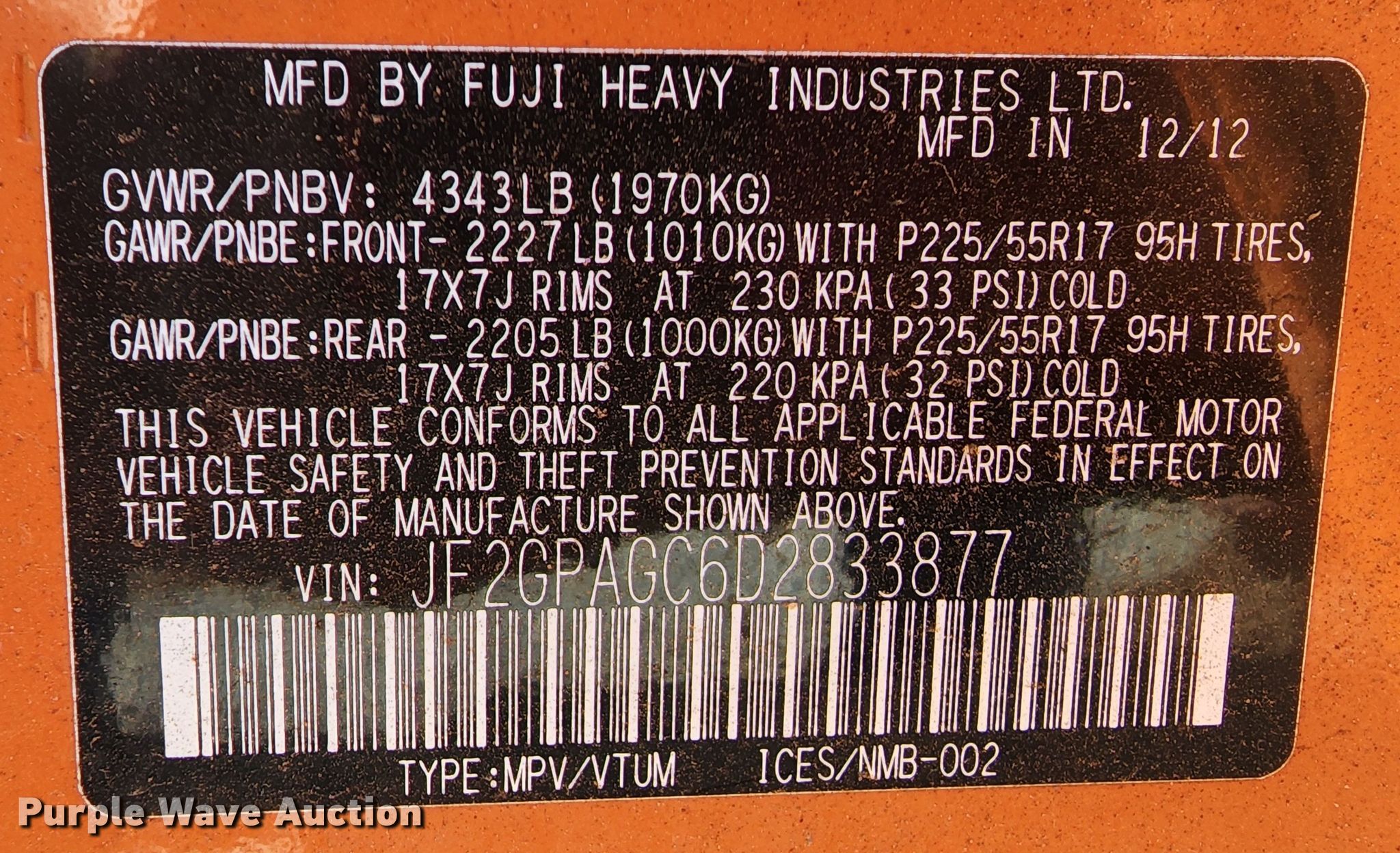 - VIN: JF2GPAGC6D2833877