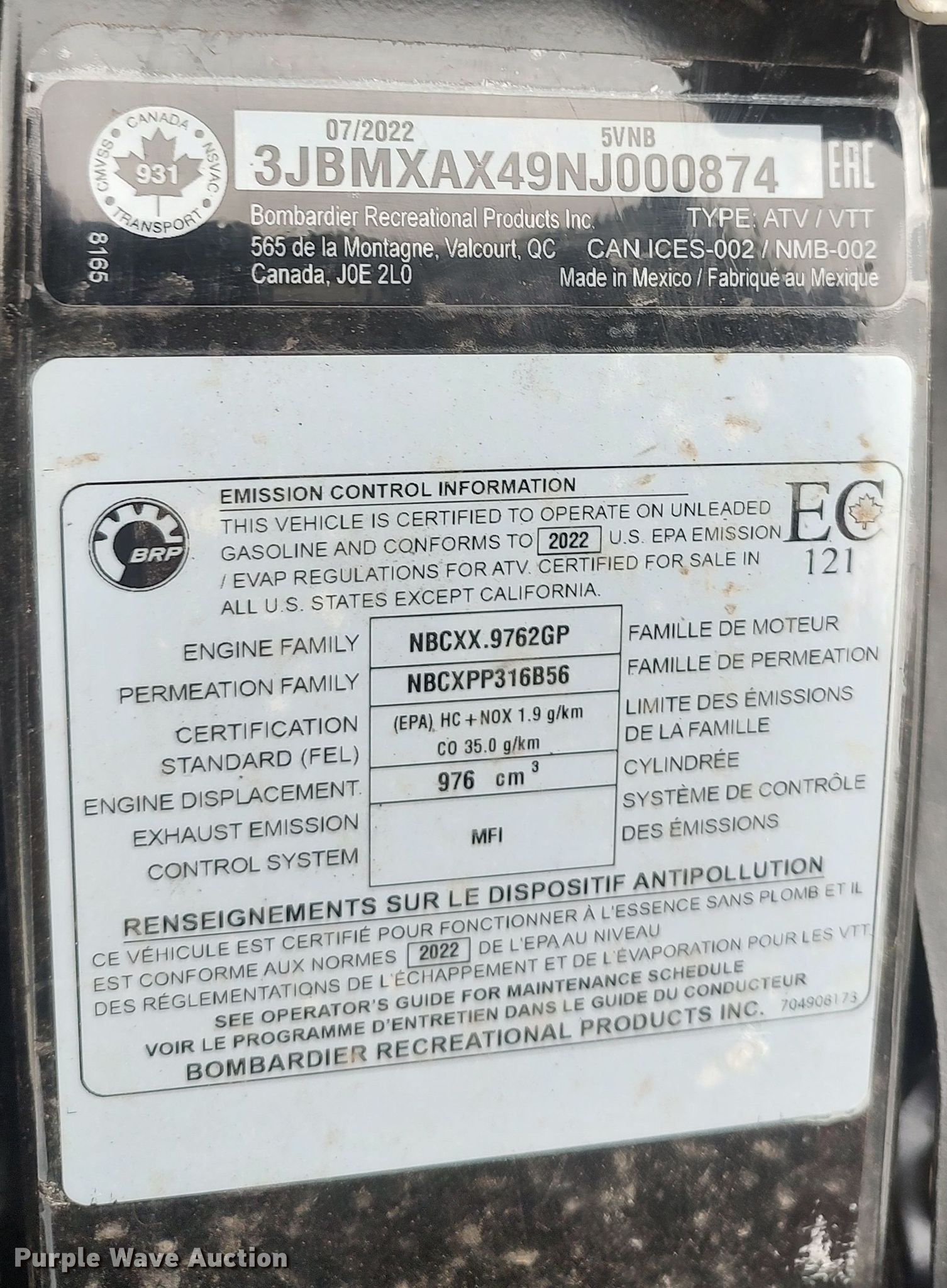 - VIN: 3JBMXAX49NJ000874