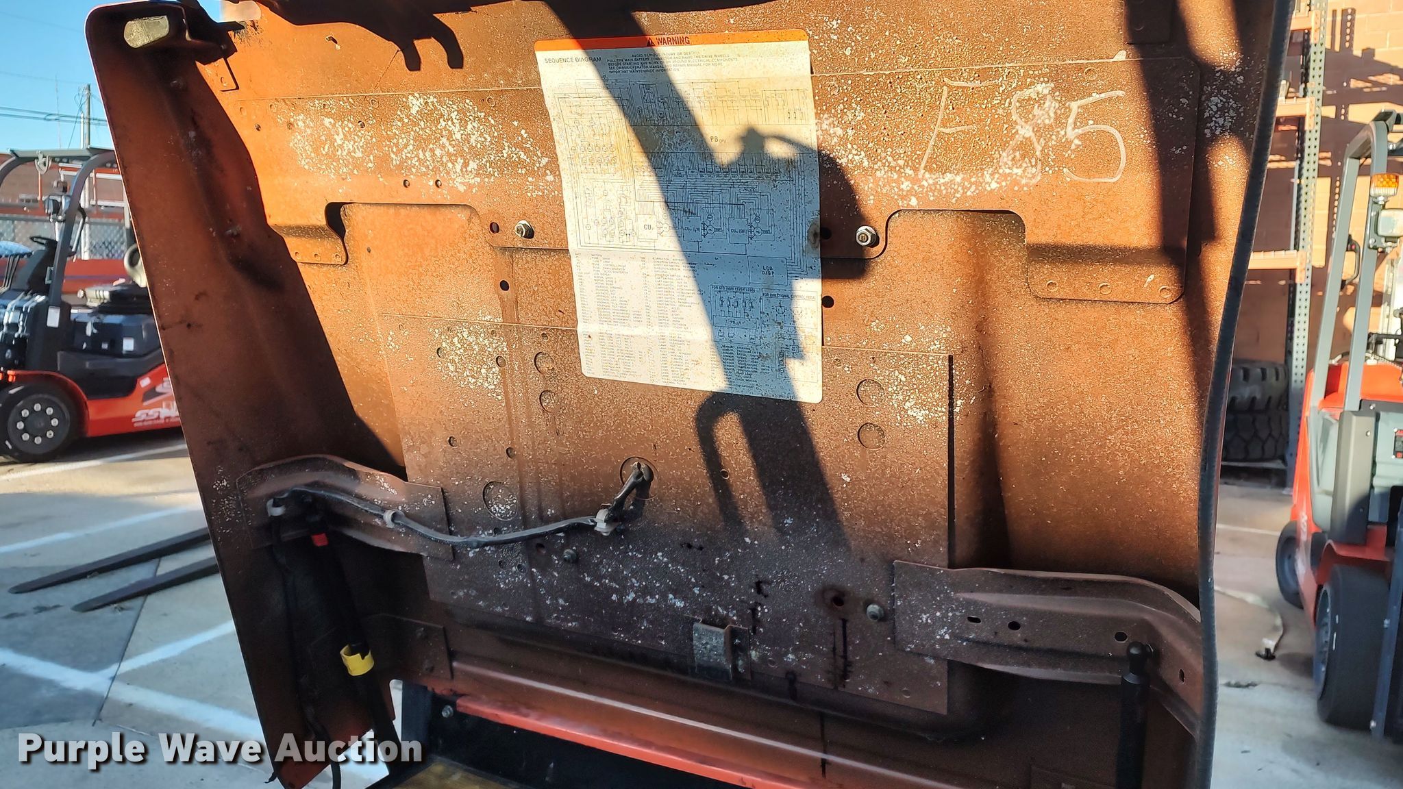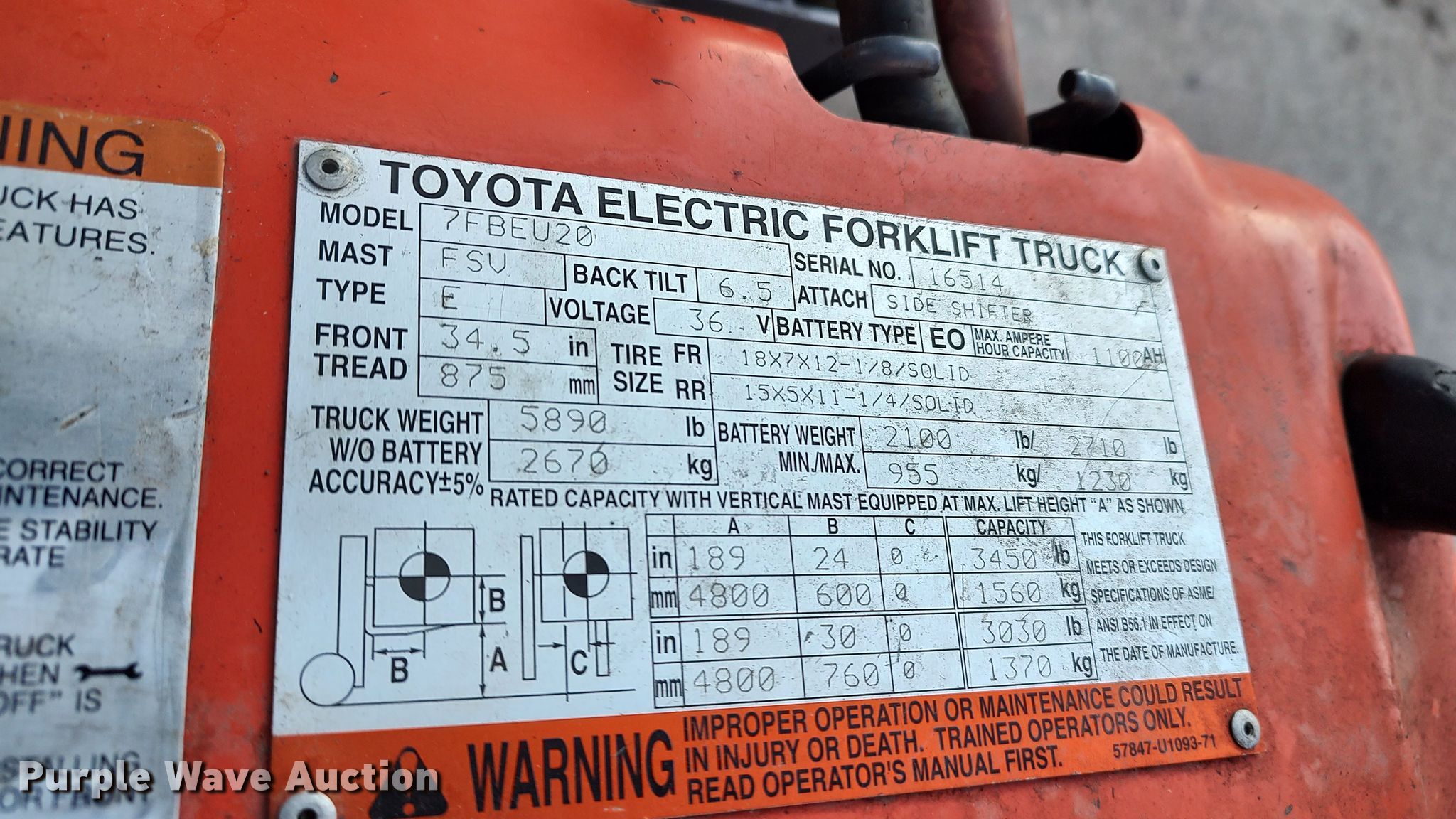 Toyota 7FBEU20 forklift. Hours: 13,922 on meter, Serial: 16514. Electric Motor Volts: 36. Transmission Hydrostatic. Operators station Canopy. Features Maximum lift capacity: 3,450 lbs, Maximum lift height: 189", Mast stages: 3, Side shift, Mast tilt, Fork length: 42". Tires Front: 18x7x12 1/8, Rear: 457/178-308, Solid. SS Lift. 317 East Hill Street. Oklahoma City, OK 73105