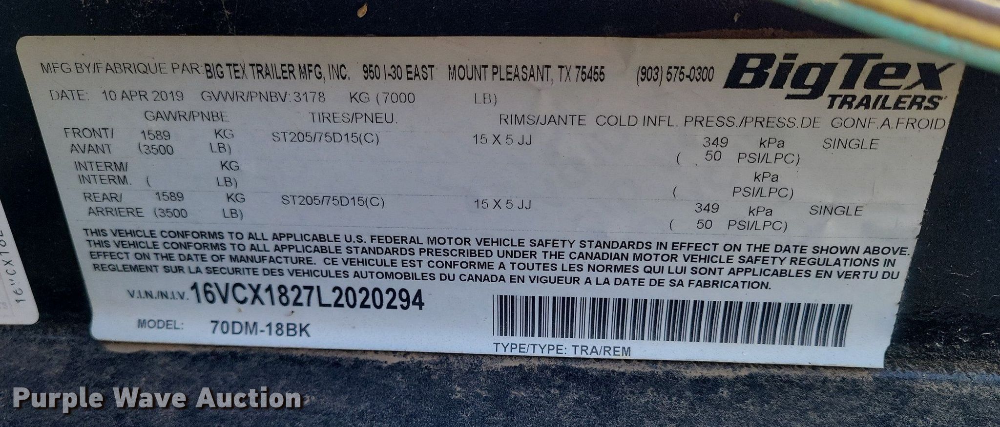 Purple Wave is selling a used Car or Utility Trailer in Texas. This item is a 2020 Big Tex 70DM-18BK utility trailer with the following: VIN: 16VCX1827L2020294