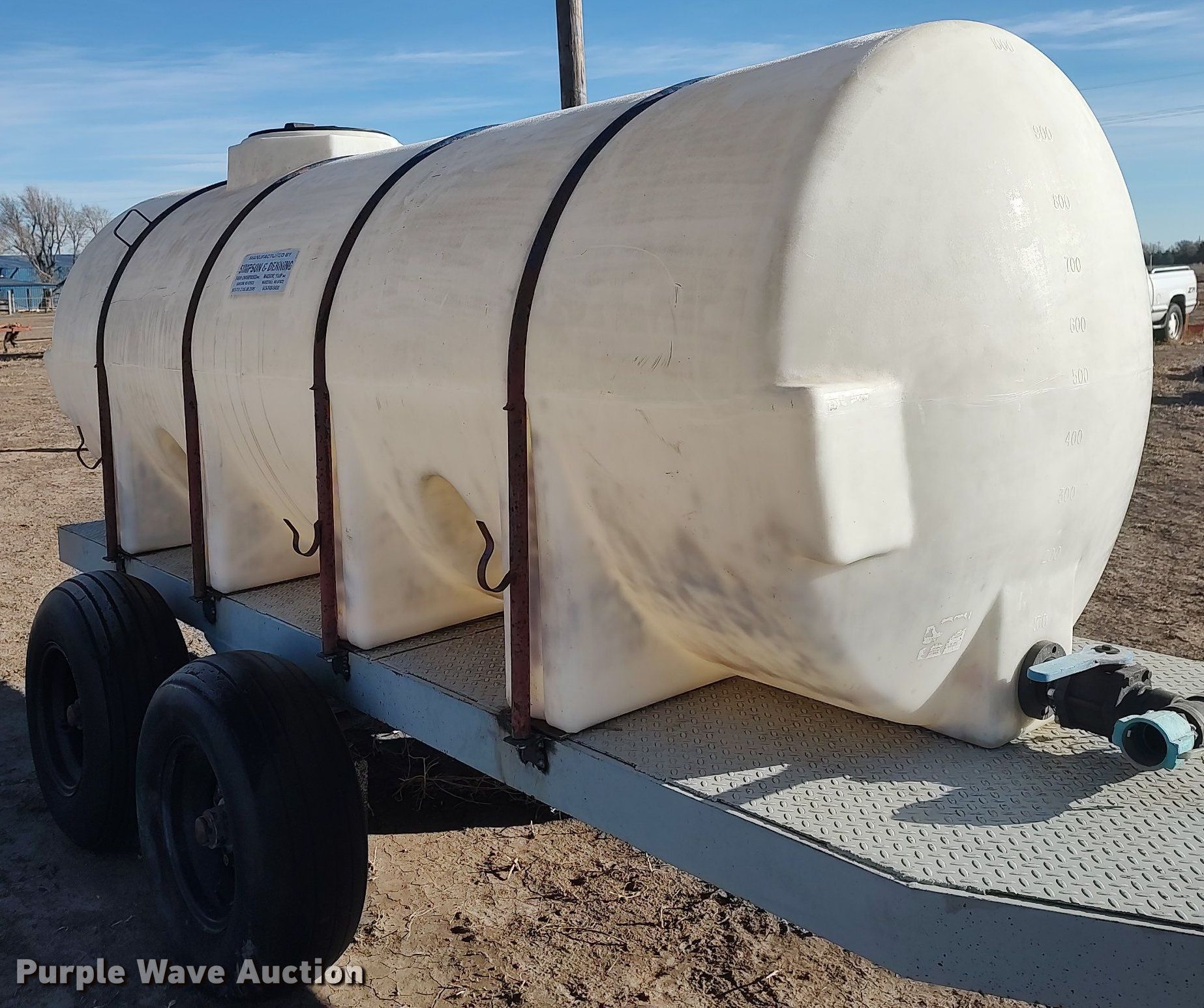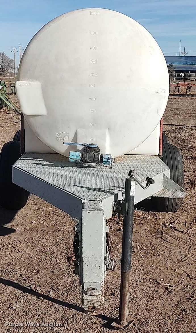 Shop built tank trailer. Dimensions. Overall: 17' 4" L x 48" W. Features Tank type: Poly Capacity: 1,000 gallons, Compartments: 1, Outlet valves: 2 Size: 2", No. of manways/manholes: 1. Chassis Hitch: Pin, Landing gear: Single, Suspension: Walking beam, Axles: Tandem. Tires Steel wheels, Size: 11L-15. Margarito Olvera. 16021 Road 4. Plains, KS 67869