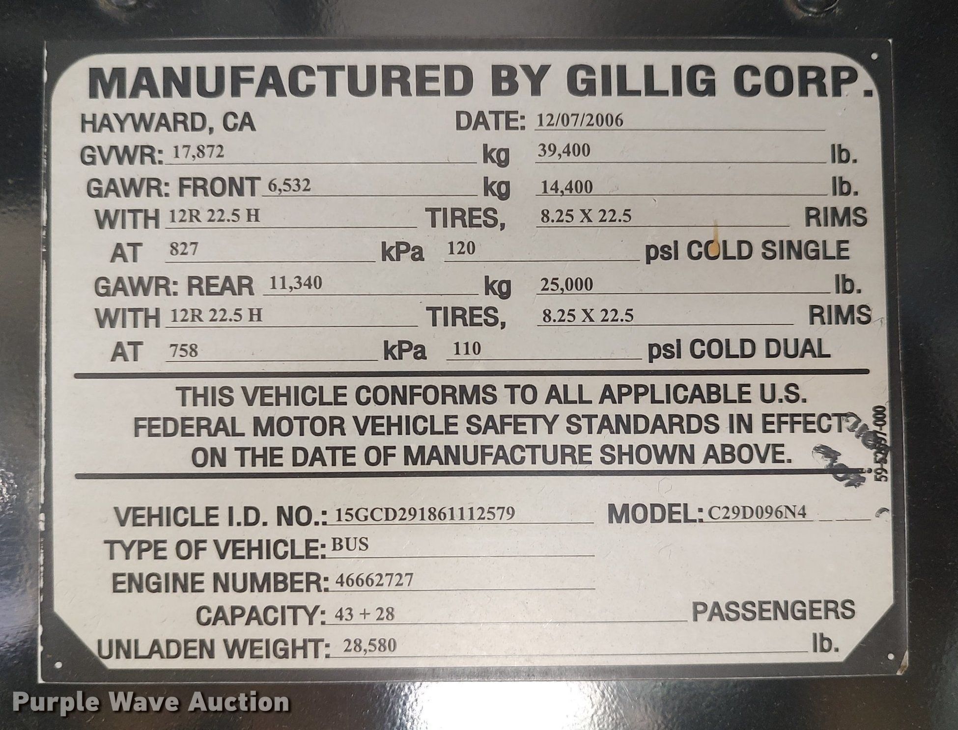 2006 Gillig Phantom C29D096N4 transit bus. Miles: Unknown, VIN: 15GCD291861112579. Engine Cummins ISL, Displacement: 8.9L, Cylinders: 6, Fuel type: Diesel. Transmission Allison, Automatic. Chassis Axles: Single, Suspension: Air, Brakes: Air. Interior AC, Heat, Passengers: 71. Tires Size: 315/80R22.5. Notes Dead battery, Unknown operating condition. Kansas title. Mileage has not been verified. Odometer discrepancy will be marked on the title. 13505 Southwest 140th Street. Rose Hill, KS 67133