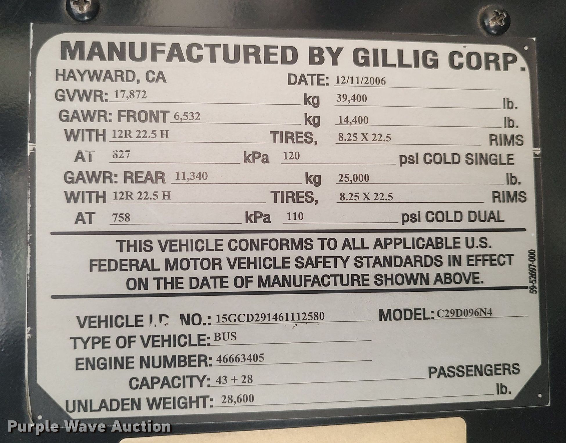 2006 Gillig Phantom C29D096N4 transit bus. Miles: 409,096, VIN: 15GCD291461112580. Engine Cummins ISL, Displacement: 8.9L, Cylinders: 6, Fuel type: Diesel. Transmission Allison, Automatic. Chassis Axles: Single, Suspension: Air, Brakes: Air. Interior AC, Heat, Passengers: 71. Tires Size: 315/80R22.5. Notes Dead battery, Unknown operating condition. Kansas title. Mileage has not been verified. Odometer discrepancy will be marked on the title. 13505 Southwest 140th Street. Rose Hill, KS 67133