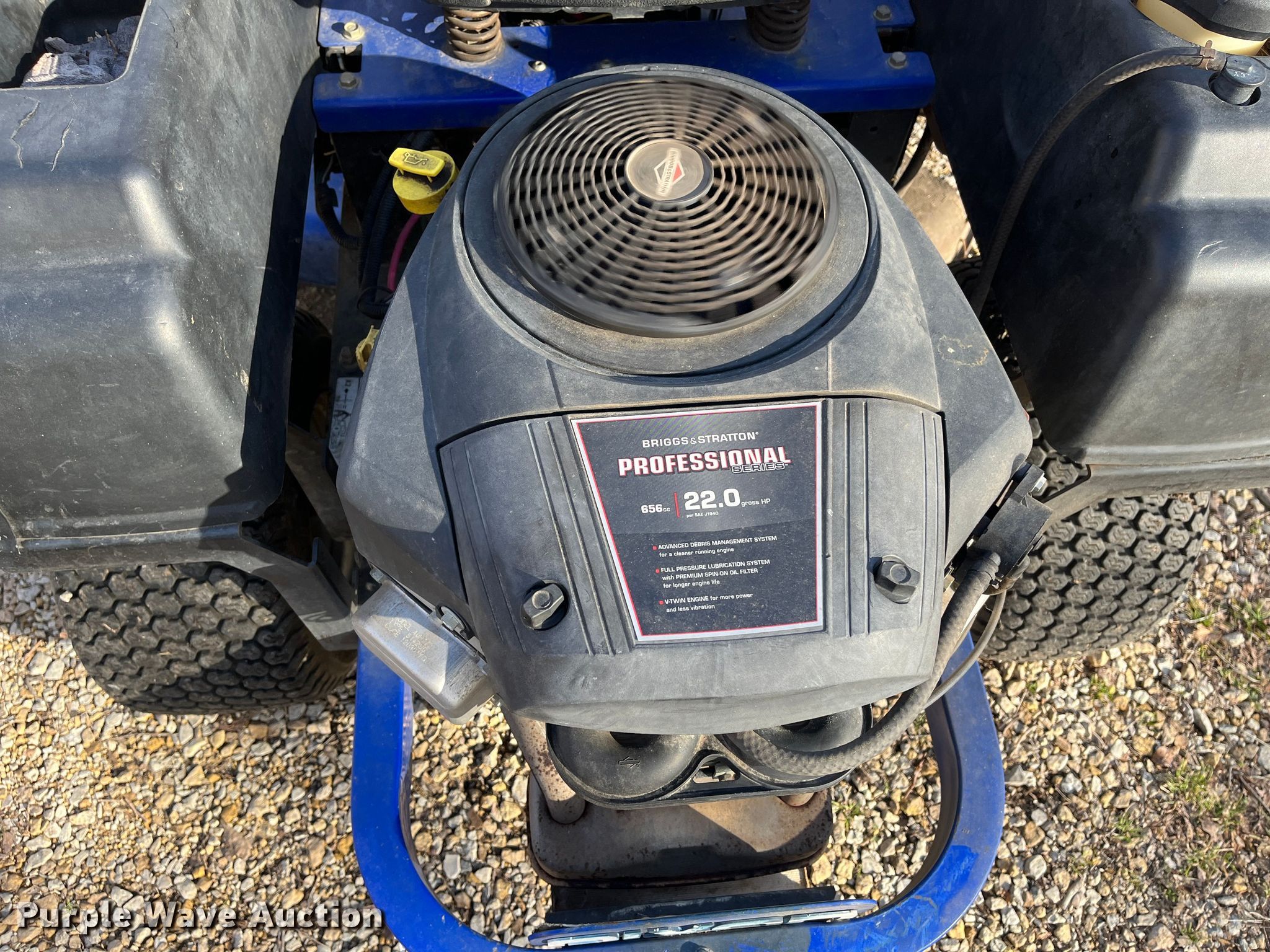 Dixon SpeedZTR 46 ZTR lawn mower. Cutting width: 46", Serial: 032412C001713. Engine Briggs & Stratton, Cylinders: 2, Fuel type: Gas, HP: 22. Transmission Hydrostatic. Tires Front: 11x4.00-5, Rear: 18x8.50-8. Notes Tensioner pulley broken. 1822 East 1450 Road. Lawrence, KS 66044