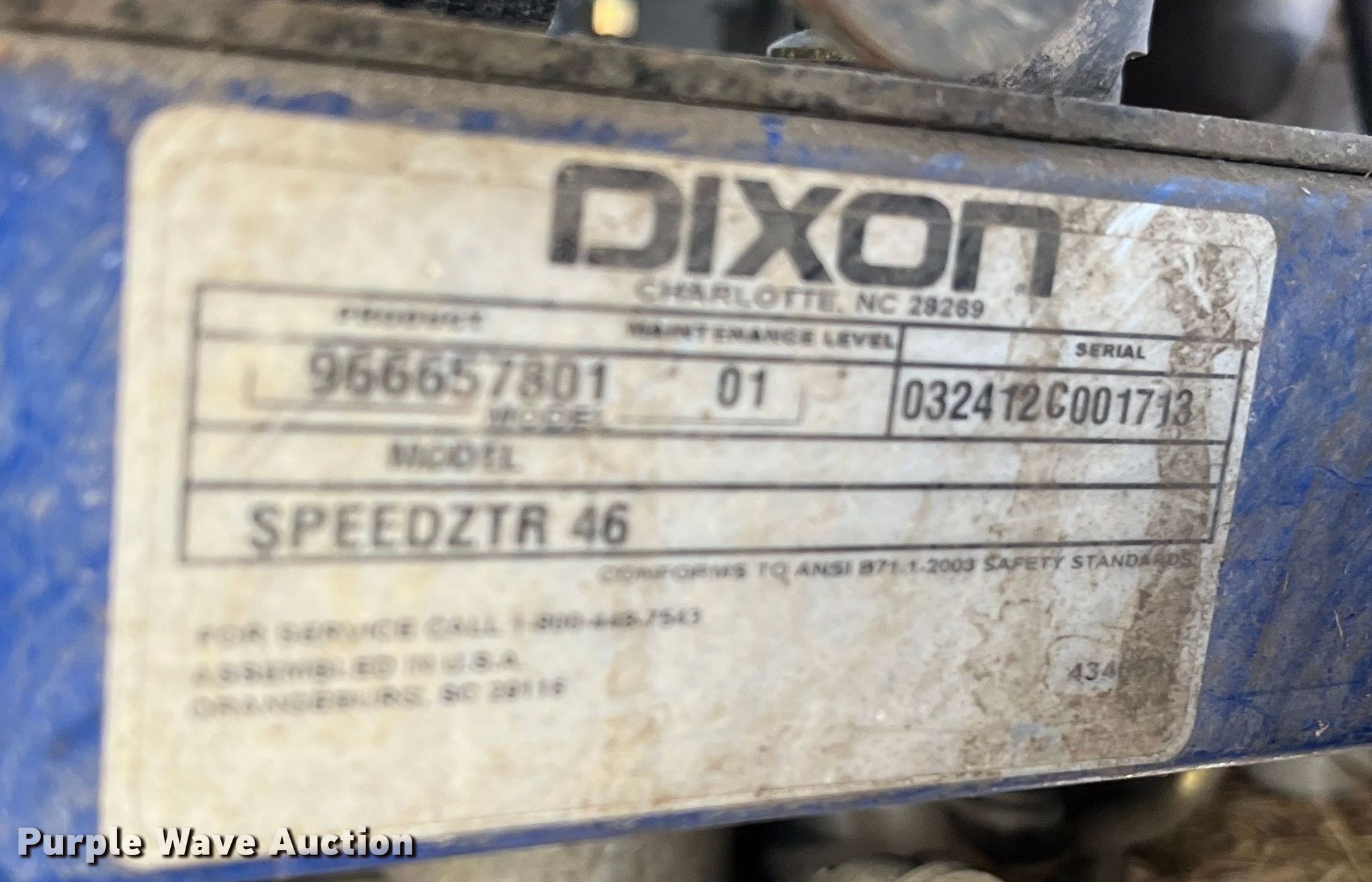 Purple Wave is selling a used Lawn Mower in Kansas. This item is a Dixon SpeedZTR 46 ZTR lawn mower with the following: Cutting width: 46", Serial: 032412C001713