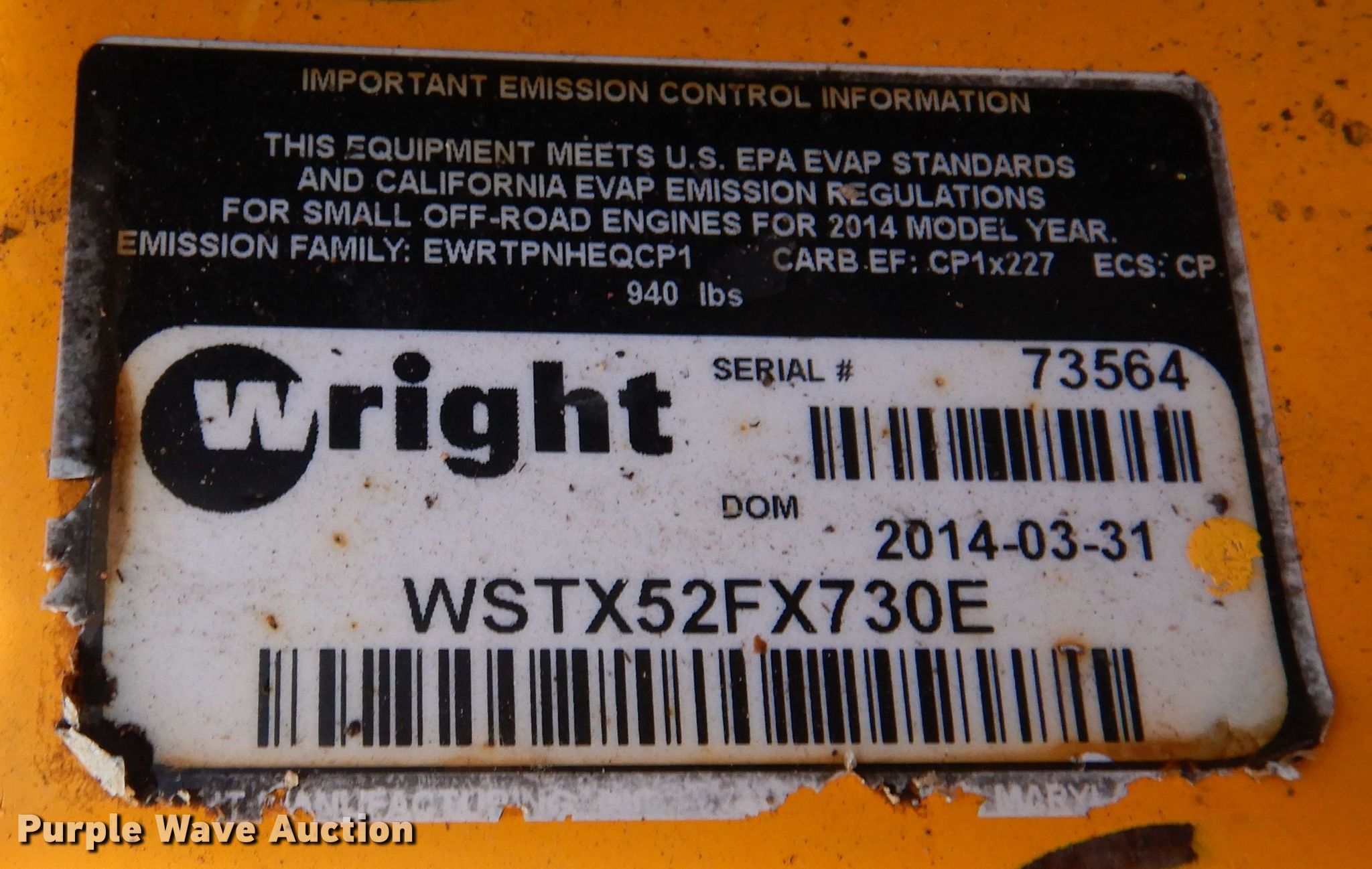 Purple Wave is selling a used Commercial Turf Mower in Colorado. This item is a 2014 Wright lawn mower with the following: Hours: 1,673 on meter, Cutting width: 52", Serial: 73564