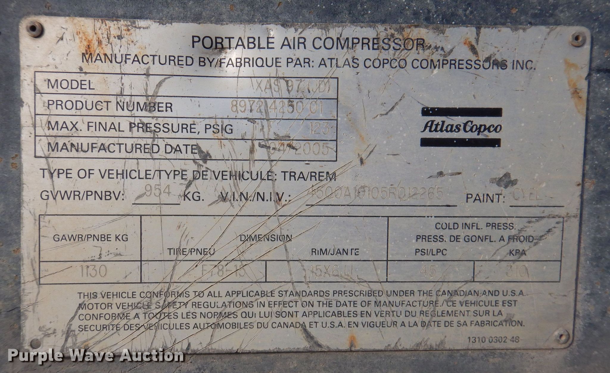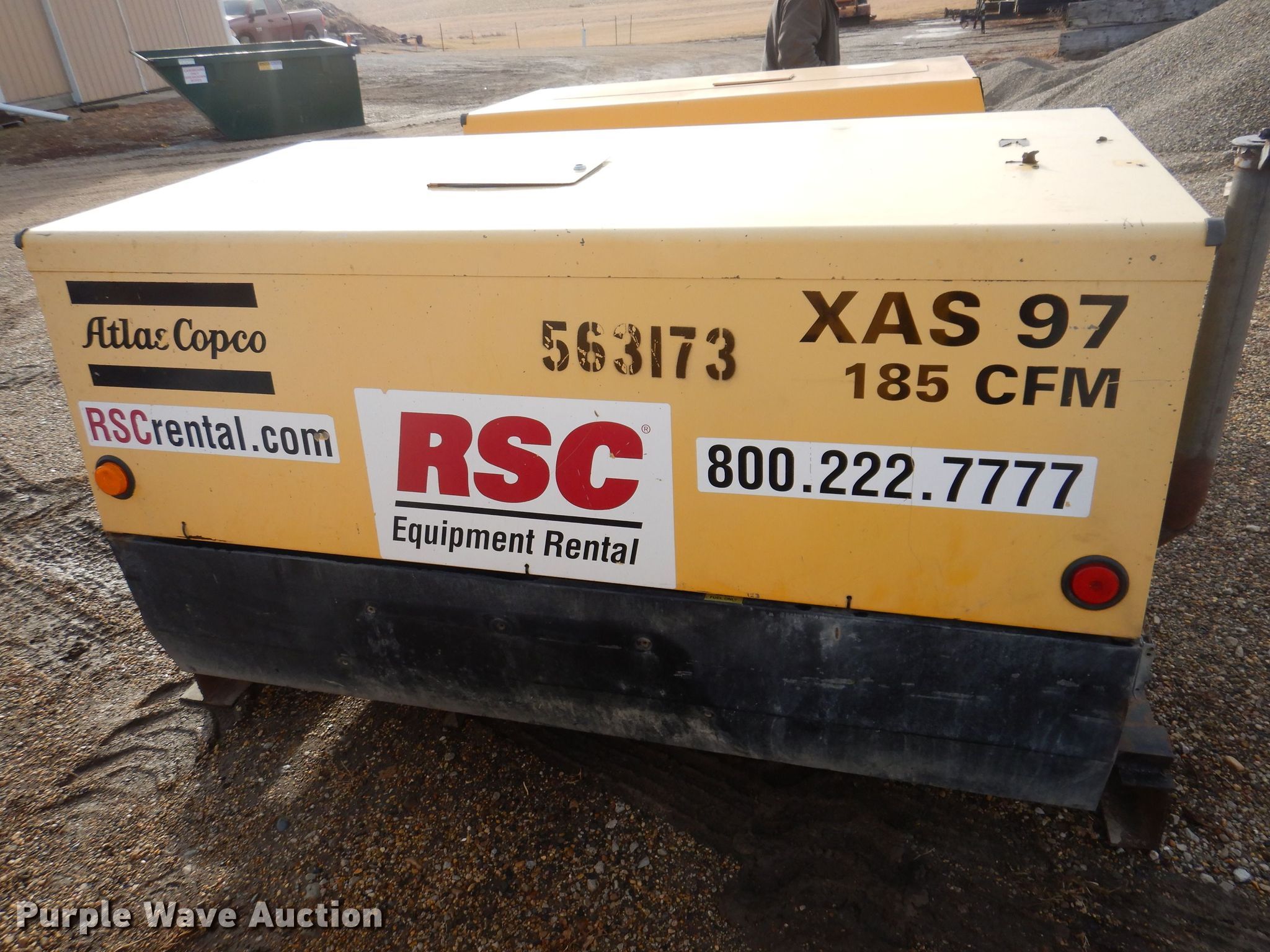Purple Wave is selling a used Air Compressor in Iowa. This item is a 2005 Atlas Copco XAS 97 air compressor with the following: Hours: 1,331 on meter, Serial: 89Y2425001