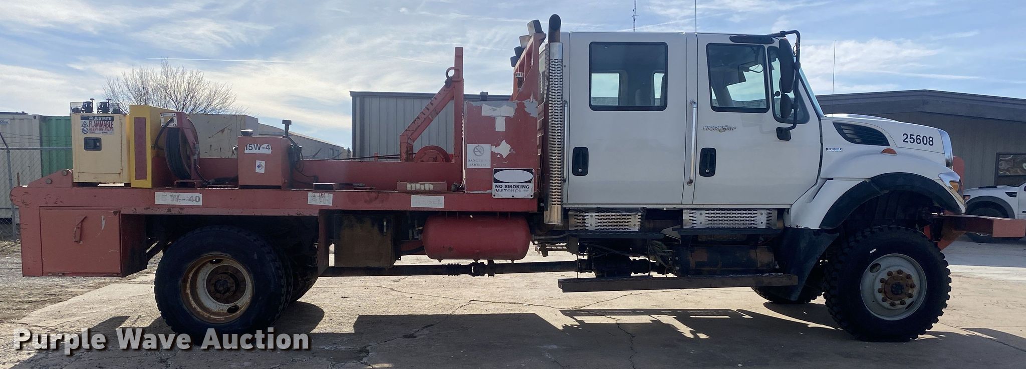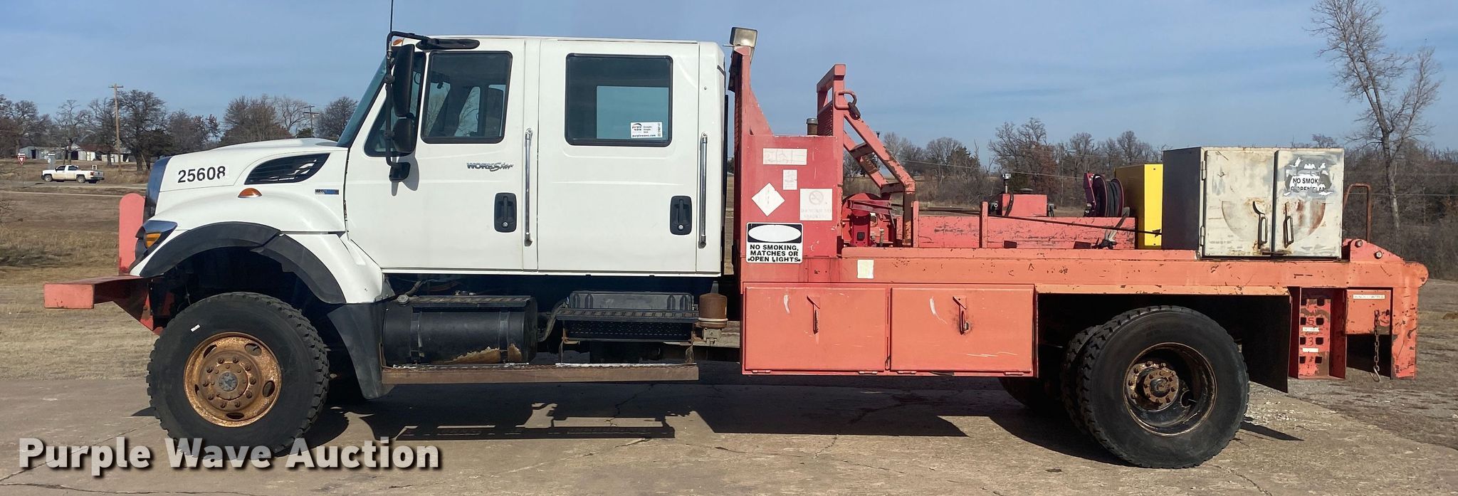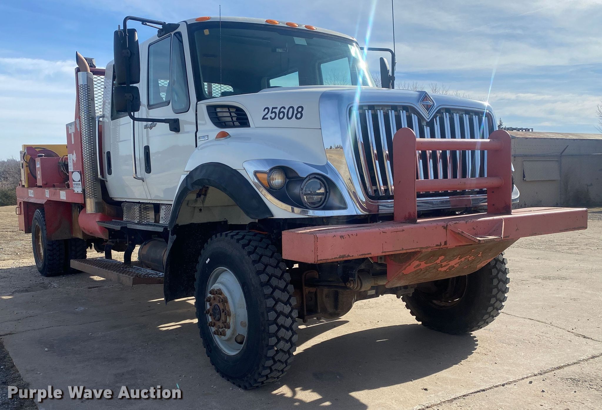 2010 International 7000 flatbed truck. Miles: 45,523 on odometer, Hours: 13,386 on meter, VIN: 1HTWEAAR8AJ214957. Engine Displacement: 7.6L, Cylinders: 6, Fuel type: Diesel. Transmission Automatic. Chassis Four wheel drive, Axles: Single, Suspension: Spring, Brakes: Air, PTO, GVWR: 35,000 lbs. Interior AC, Heat, Heated mirrors, Cruise control. Features Flatbed 14' 3" L x 96" W, Winch, Rolling tailboard, Reservoirs Oil, Fuel tank Diesel, Capacity: 200 gallons, Nozzle, Hose reel. Tires Size: 11R22.5. Notes Dash warning indicator: ABS, DPF, Engine warning. Oklahoma title. Mileage has not been verified. Exempt will be written in the odometer disclosure on the title. Title distribution may be delayed up to 14 days from verification of funds. Flint Equipment. 9305 E Main St. Drumright, OK 74030