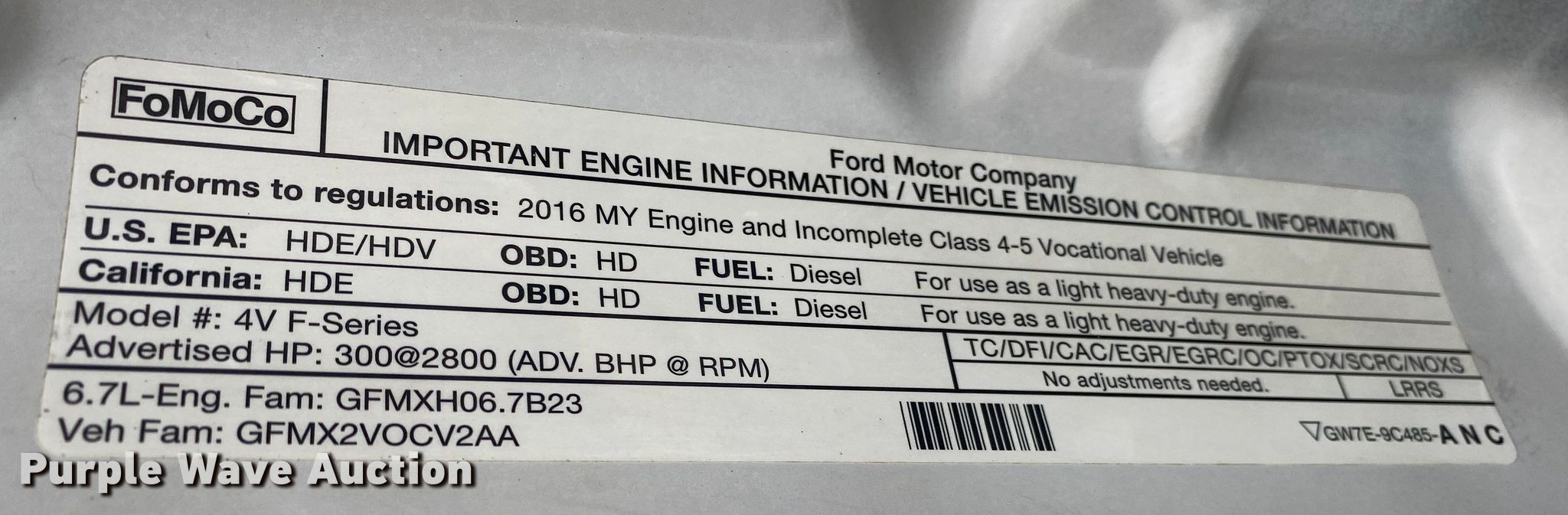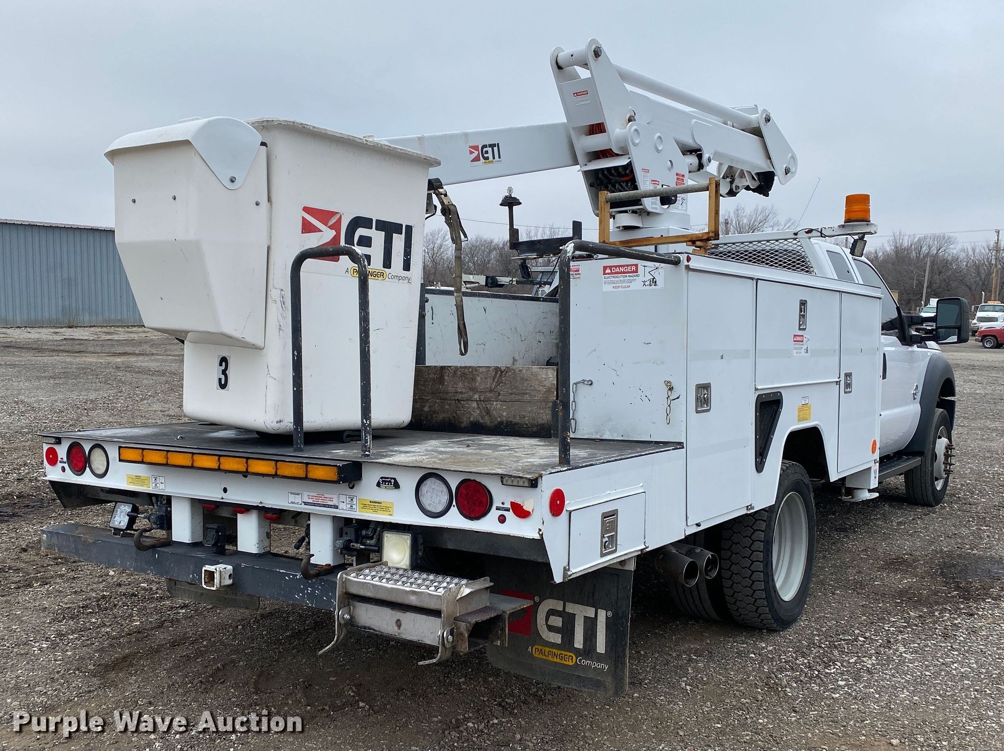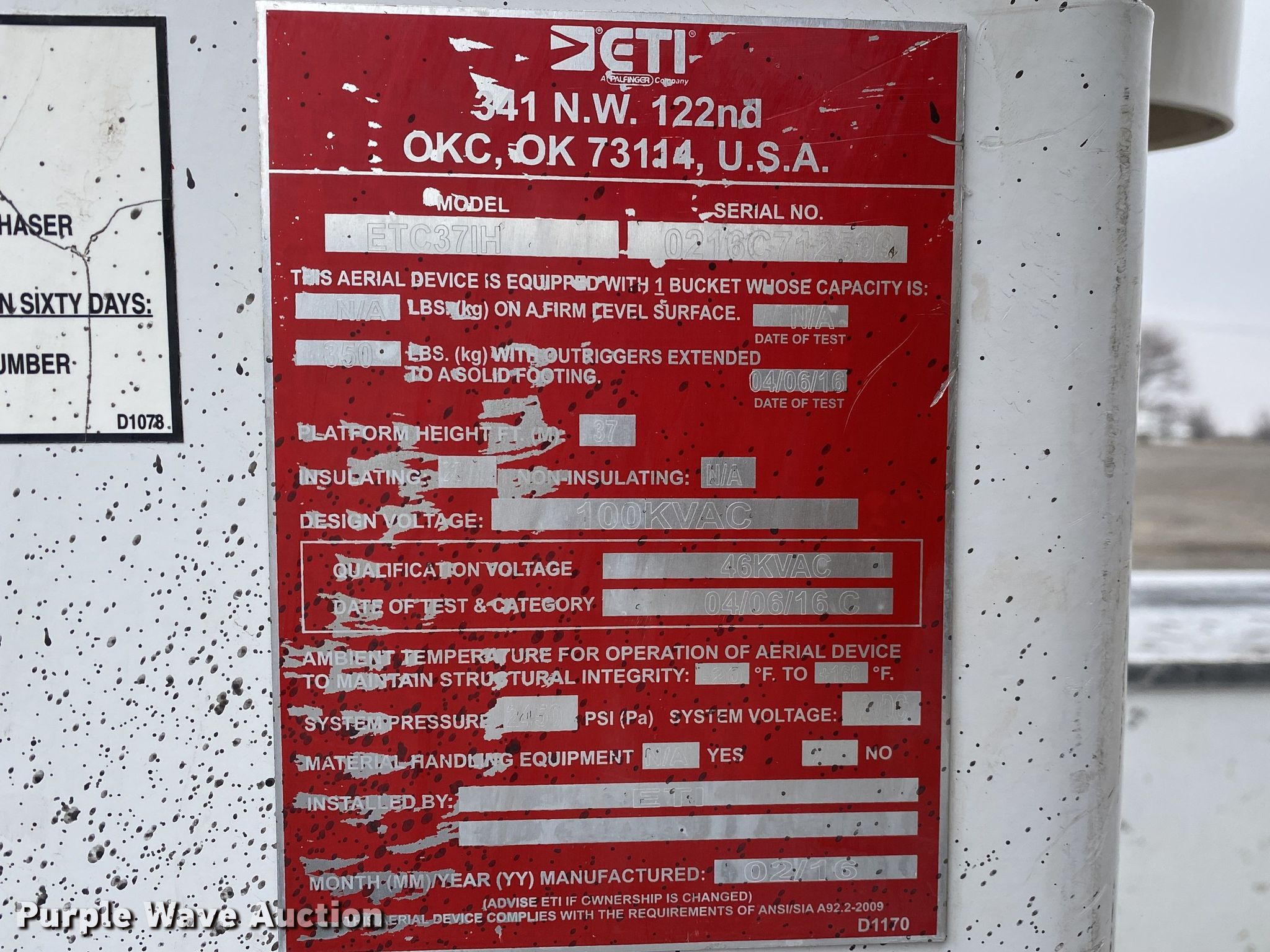 2016 Ford F550 Super Duty XL SuperCab bucket truck. Miles: 129,680 on odometer, VIN: 1FD0X5GT6GEB20337. Engine Displacement: 6.7L, Cylinders: 8, Fuel type: Diesel. Transmission Automatic. Chassis Axles: Single, Suspension: Spring, Brakes: Hydraulic, GVWR: 19,500 lbs, Wheelbase: 162". Interior AC, Heat, Cruise control, Auxiliary controls, Brake controller. Features Bed ETI SB108DD96A40N, Serial: 18872, 12' L x 96" W, Boom 2016 ETI ETC37IH, Serial: 0216C712599, Maximum lift capacity: 350 lbs, Maximum lift height: 37', Boom type: Insulated, Man basket, Boom controls Platform/ basket.. Tires Size: 225/70R19.5. Oklahoma title. 15107 North 137th East Avenue. Collinsville, OK 74021