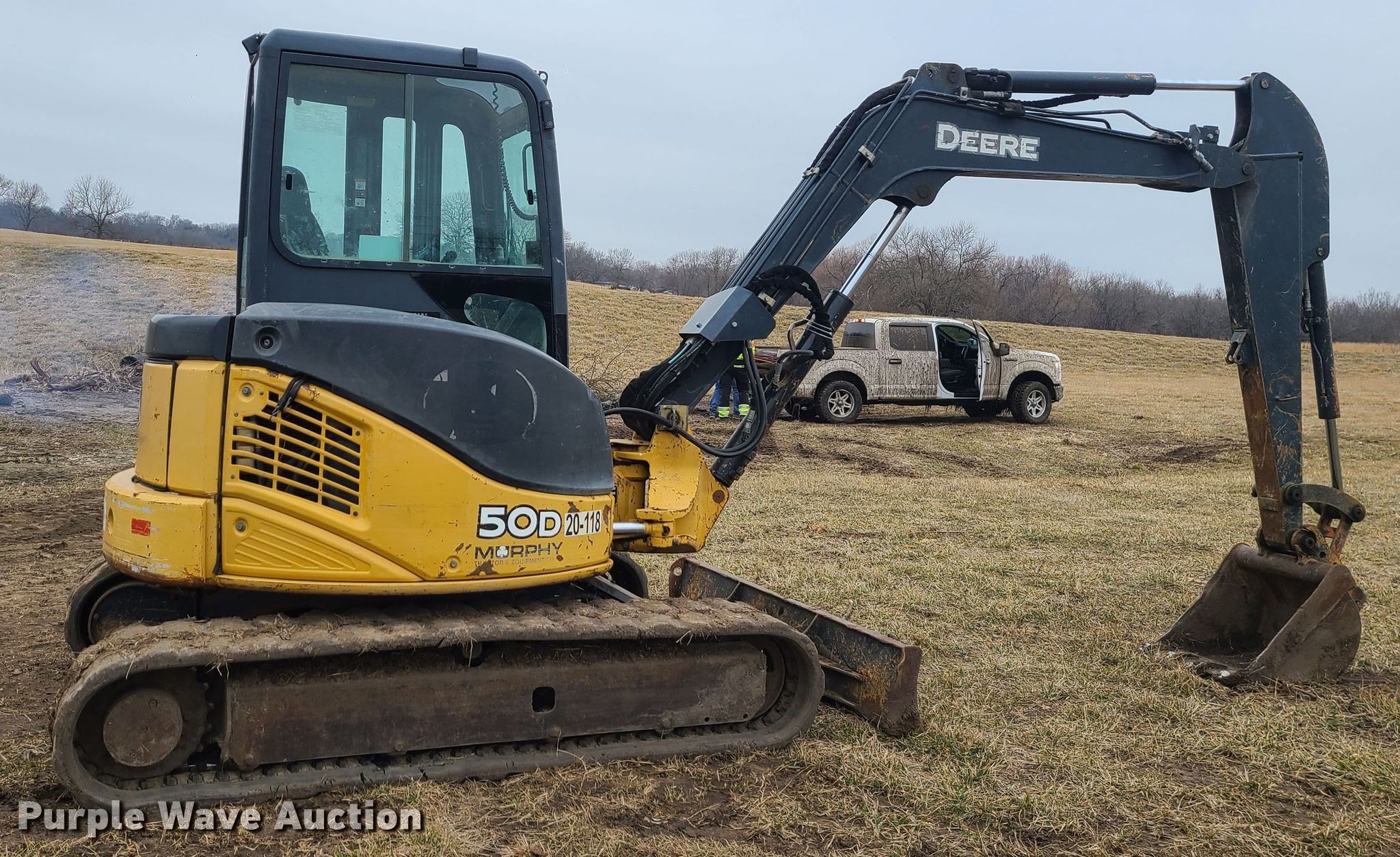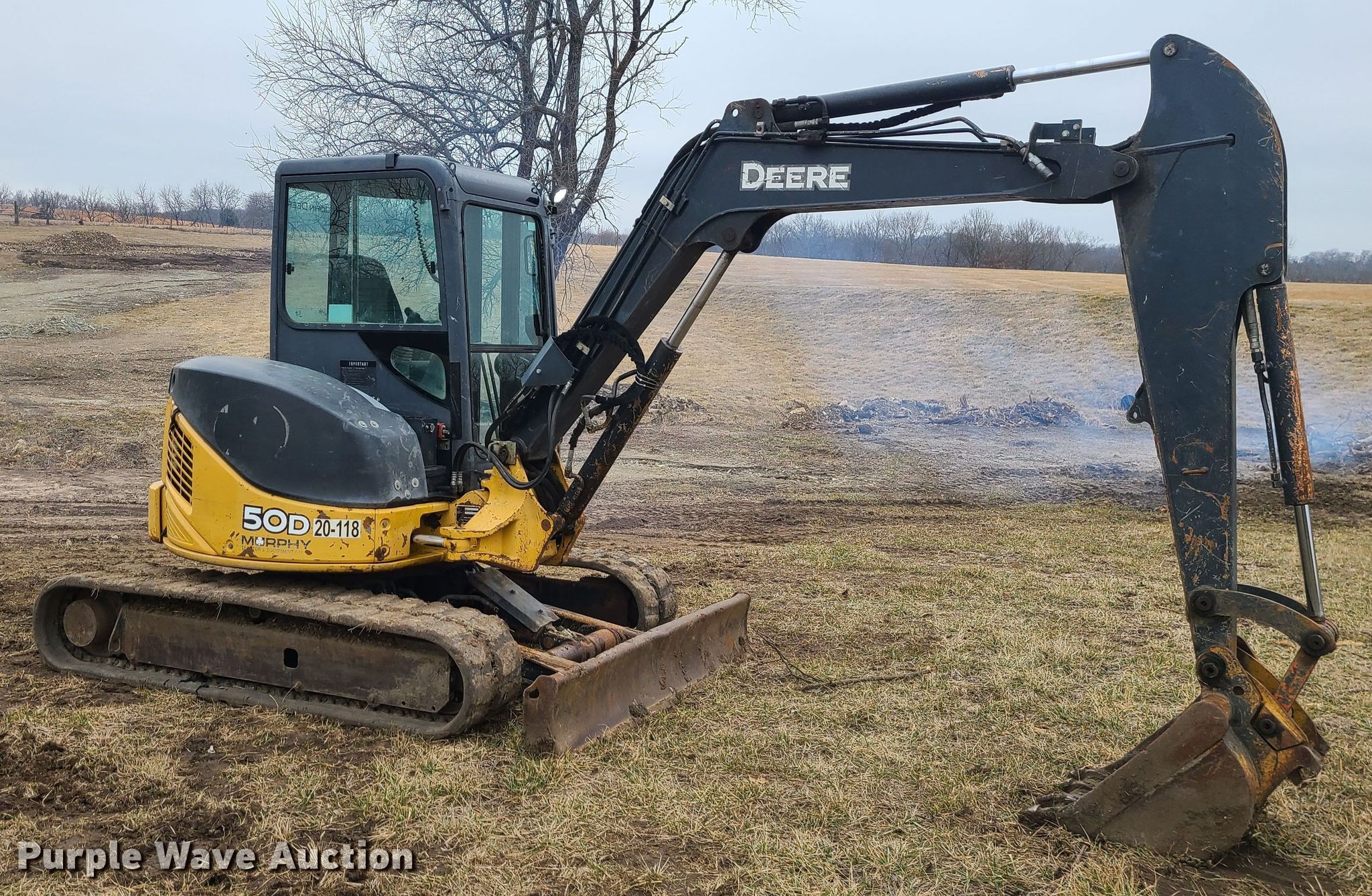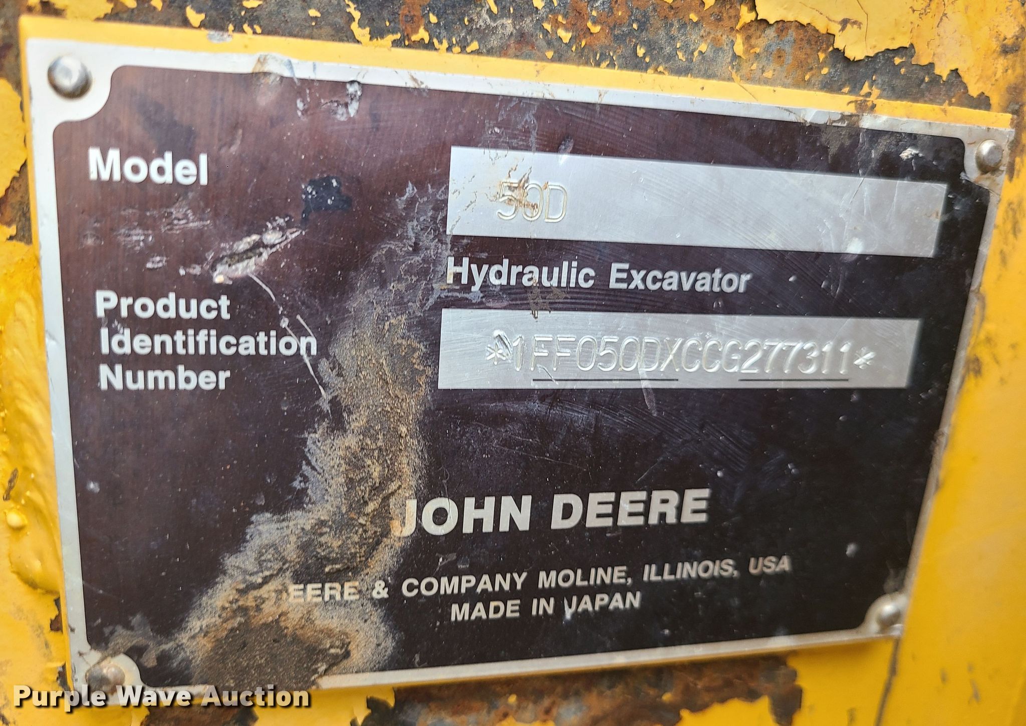 Purple Wave is selling a used Mini Excavator in Missouri. This item is a 2012 John Deere 50D mini excavator with the following: Hours: 9,033 on meter, Serial: 1FF050DXCCG277311