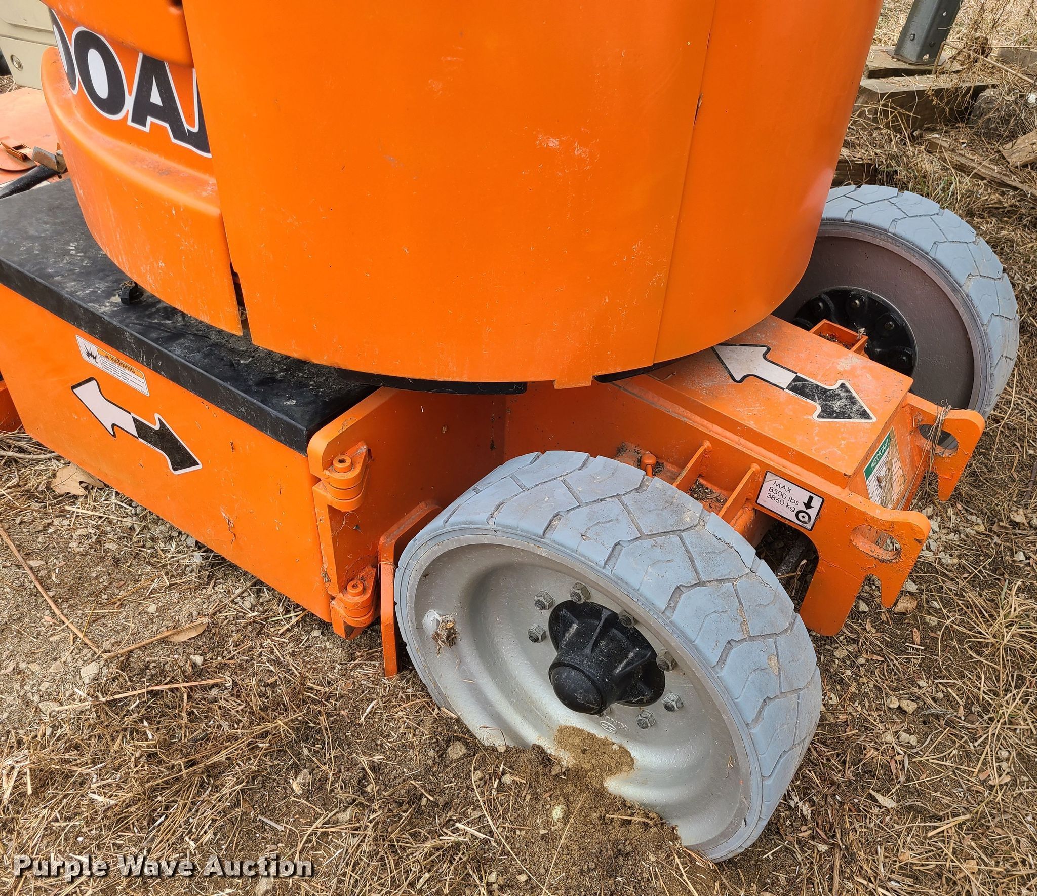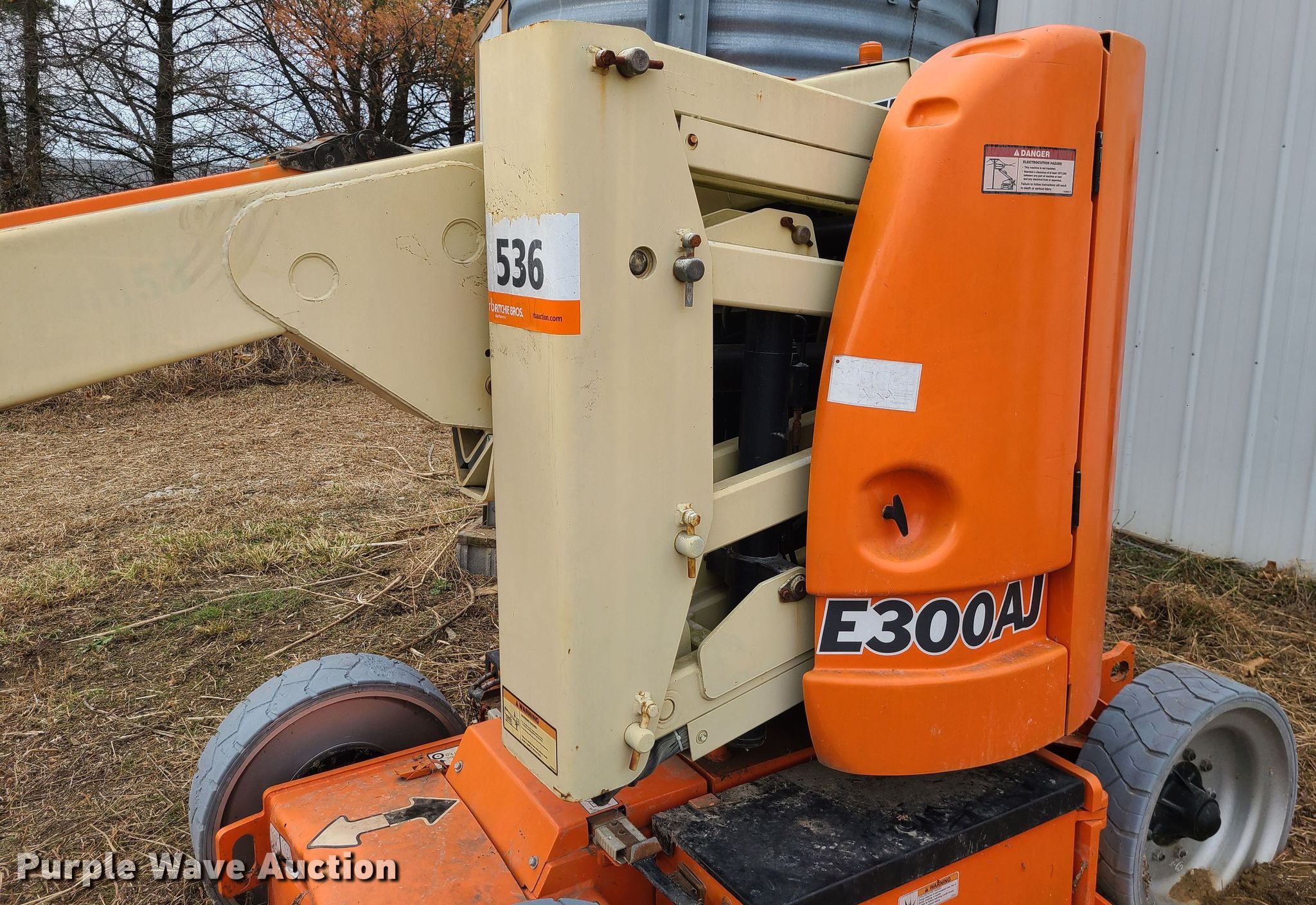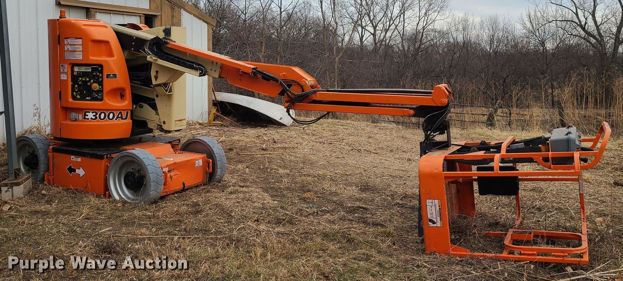2007 JLG E300AJ boom lift. Serial: 0300113521. Electric Motor Volts: 48. Features Articulating boom, Maximum lift capacity: 500 lbs, Platform: 48" L x 30" W, Controls: Platform, Ground. Tires Non-marking. Notes Dead battery, Non-operational unit. 22575 Rt DD. Dearborn, MO 64439
