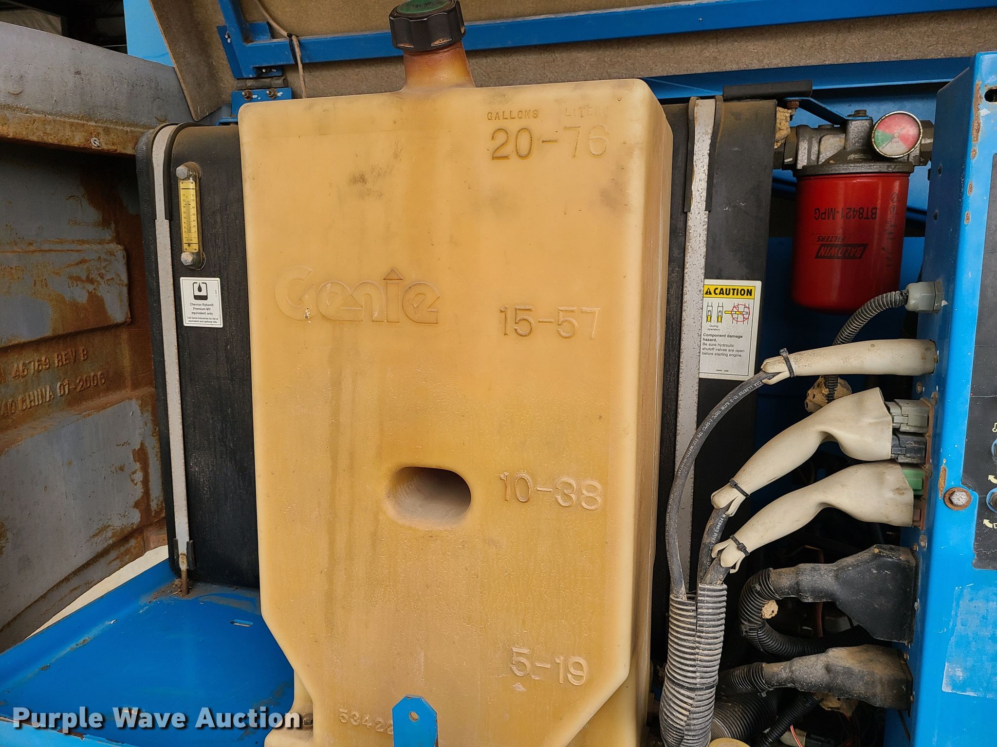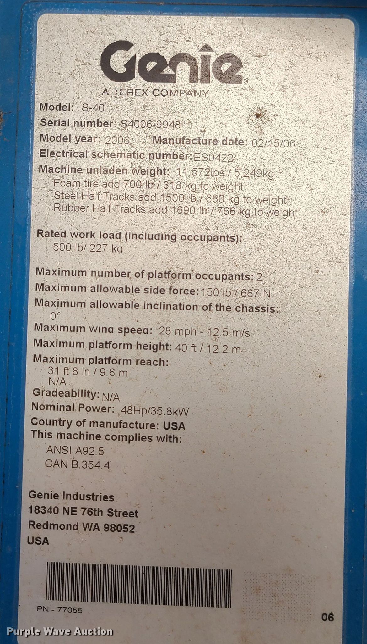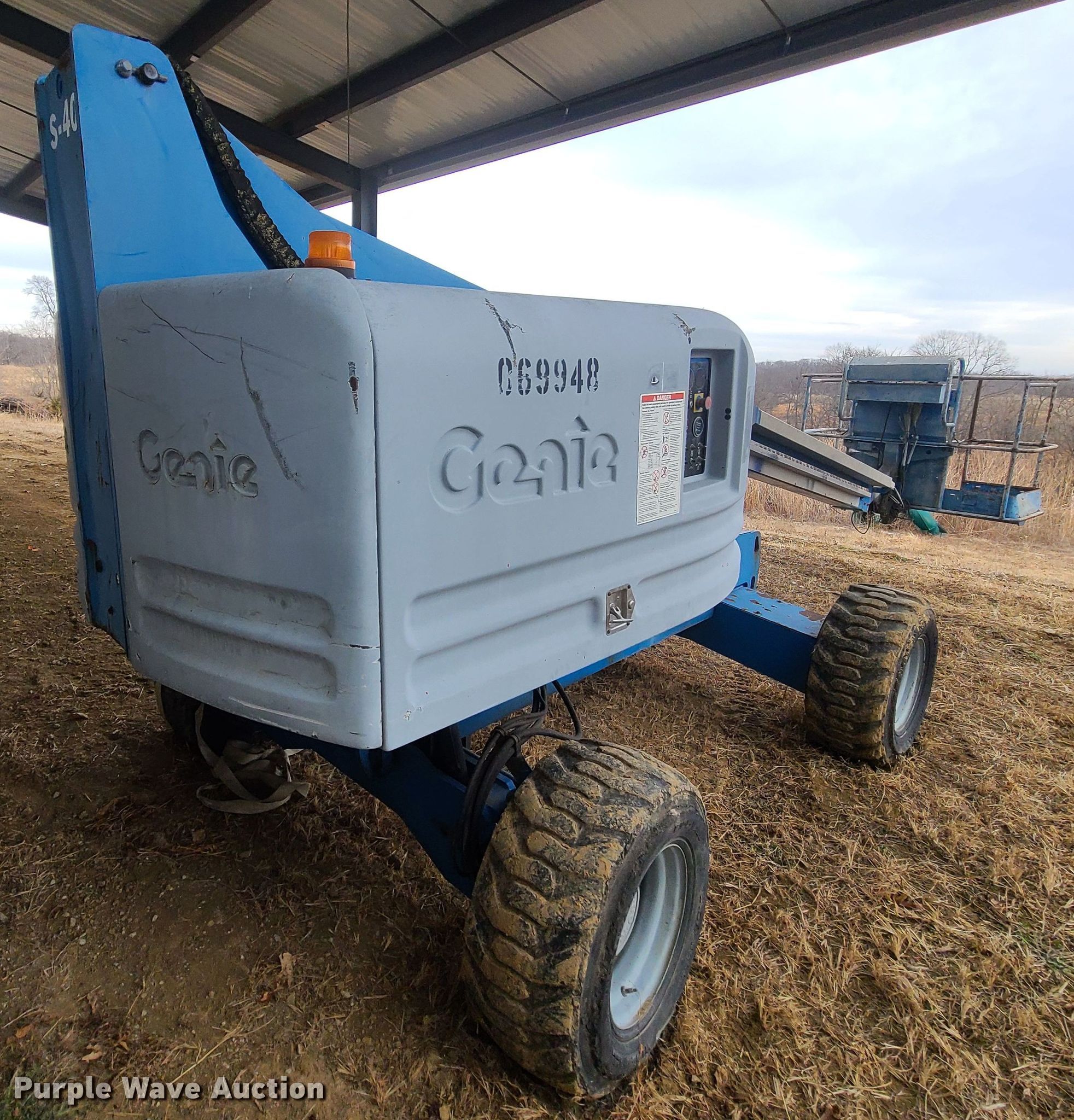 2006 Genie S40 boom lift. Hours: 2,056 on meter, Serial: S4006-9948. Engine Cylinders: 4, Fuel type: Diesel. Features Articulating boom, Maximum lift capacity: 500 lbs, Platform: 72" L x 30" W, Controls: Platform, Ground. Notes Flat tire. 22575 Rt DD. Dearborn, MO 64439
