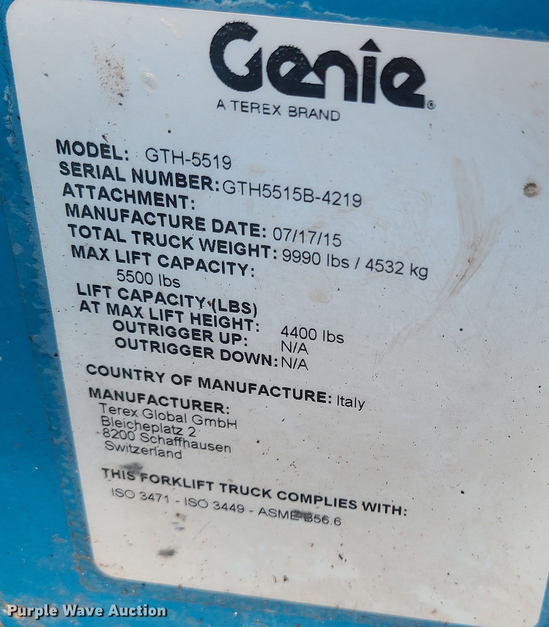 Purple Wave is selling a used Telehandler in Missouri. This item is a 2015 Genie GTH-5519 telehandler with the following: Hours: 1,948 on meter, Serial: GTH5515B-4219