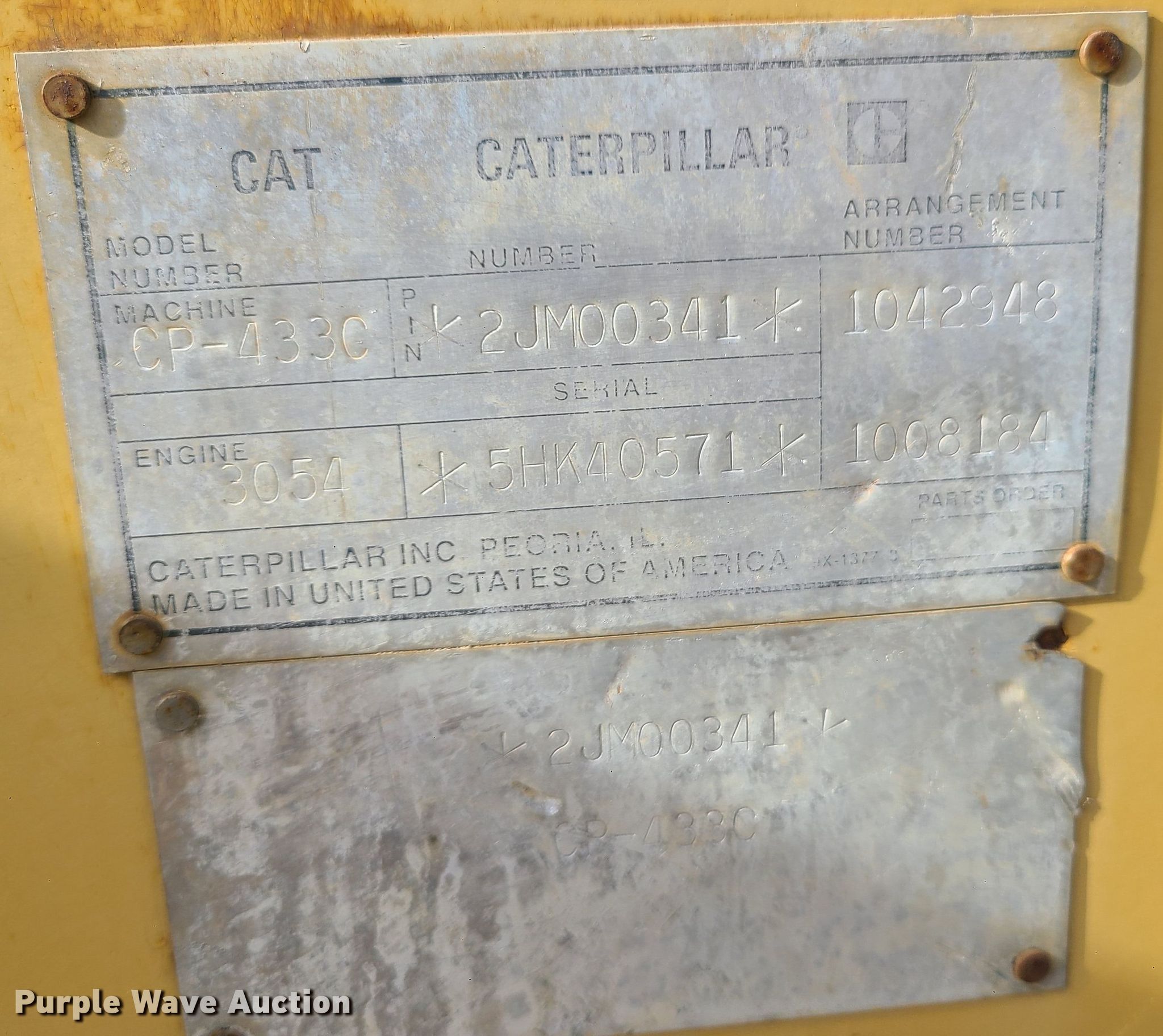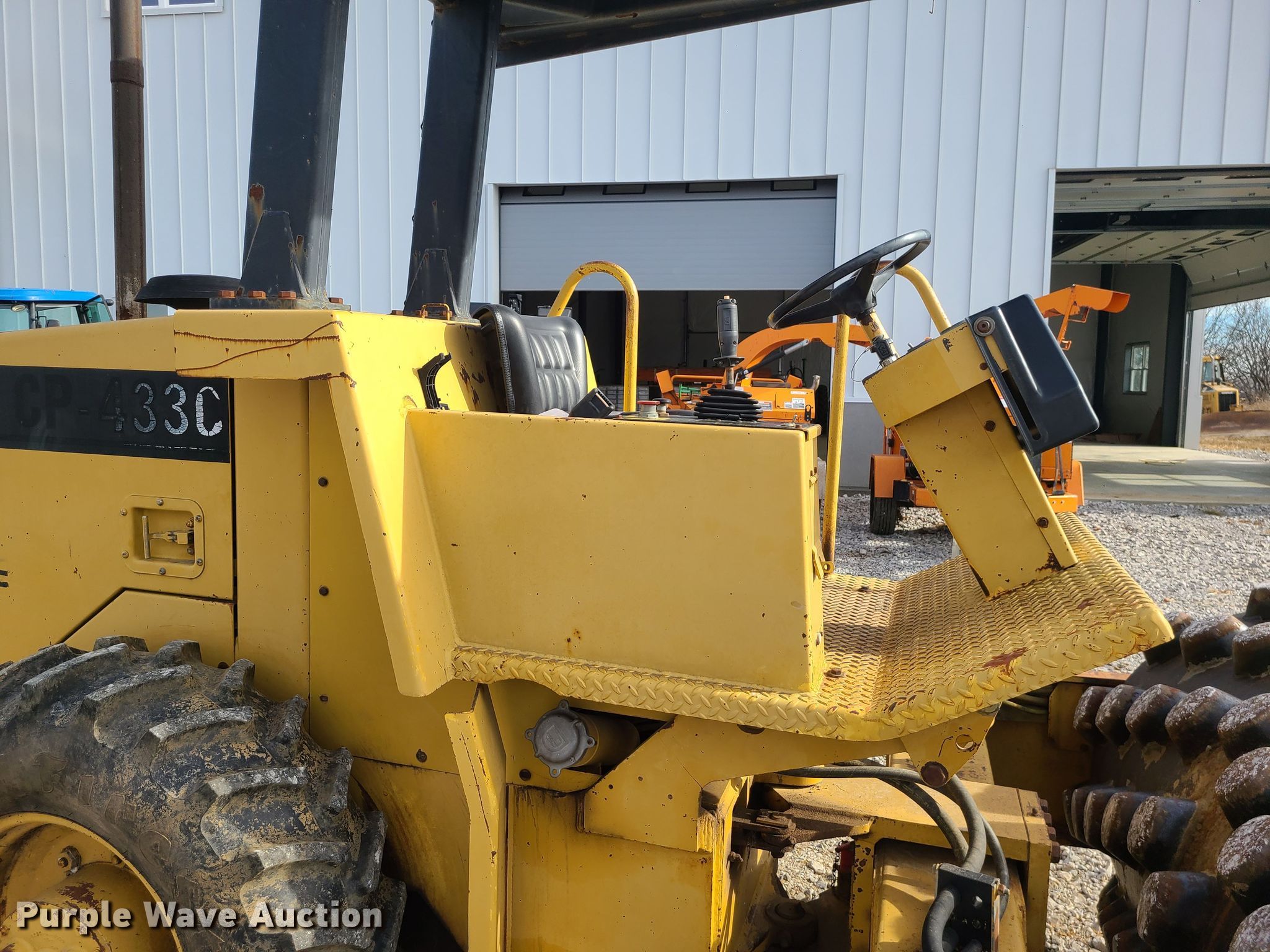 Purple Wave is selling a used Single Drum Roller Compactor in Missouri. This item is a 1996 Caterpillar CP433C single drum roller with the following: Hours: 5,054 on meter, Serial: 2JM00341