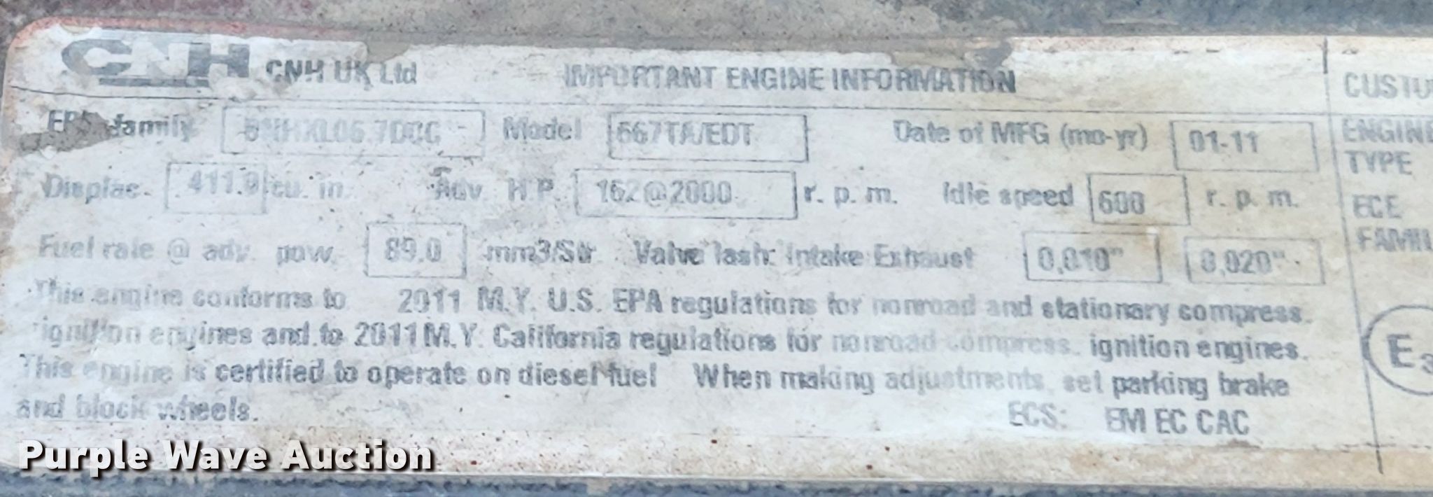 2011 Case 621E XR wheel loader. Hours: 3,272 on meter, Serial: NBF210816. Engine CNH 667TA/EDT, Serial: 00819620, Displacement: 6.7L, Cylinders: 6, Fuel type: Diesel, HP: 162. Transmission Powershift, 4F - 3R. Operators station Enclosed cab, AC, Heat, Bucket controls: Joystick, Ride control. Features Auxiliary hydraulics: Front, Bucket JRB, Width: 102", Self- leveling bucket, Four-in-one, Cutting edge: Bolt-on. Tires Size: 20.5R25. T.A. Contracting Inc. 6495 Hawkins-Fuchs Rd. St. Louis, MO 63129