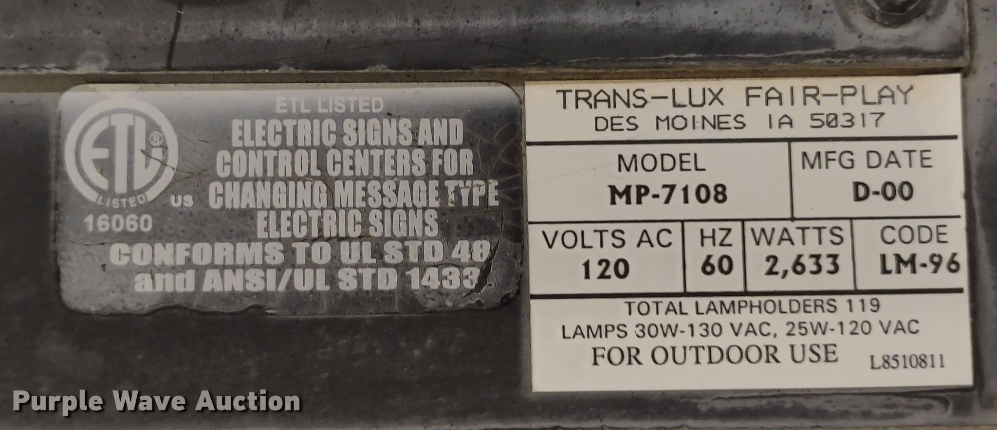 Trans-Lux Fair-Play MP-7108 scoreboard. Volts: 120/240, HZ: 60. USD 290. 1404 S Ash St. Ottawa, KS 66067