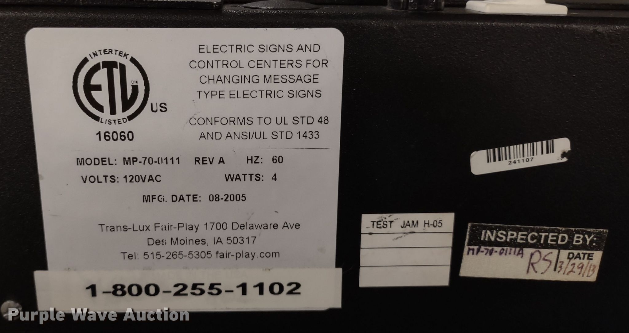 Purple Wave is selling a used Sporting Goods in Kansas. This item is a Trans-Lux Fair-Play MP-7108 scoreboard with the following: Volts: 120/240, HZ: 60